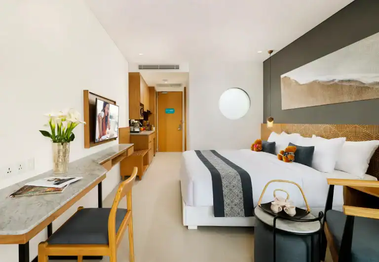 Accommodation is apartment-style, ranging from studios to spacious suites, and designed for travellers who value independence without giving up hotel convenience. Expect bright, modern interiors with air-conditioning, private bathrooms, and free in-room Wi-Fi, plus thoughtful layouts that suit couples, friends, and families. Many rooms include a balcony or terrace for extra breathing space. The kitchenette set-up is a real win for longer stays: keep drinks chilled, assemble simple breakfasts, and snack between adventures. If you are travelling with children, the family-friendly approach and room options make it easier to spread out and keep everyone comfortable. It is the kind of place where you can unpack, settle in, and keep your days flexible, whether you are here for a quick reset or a longer work-and-waves stint.