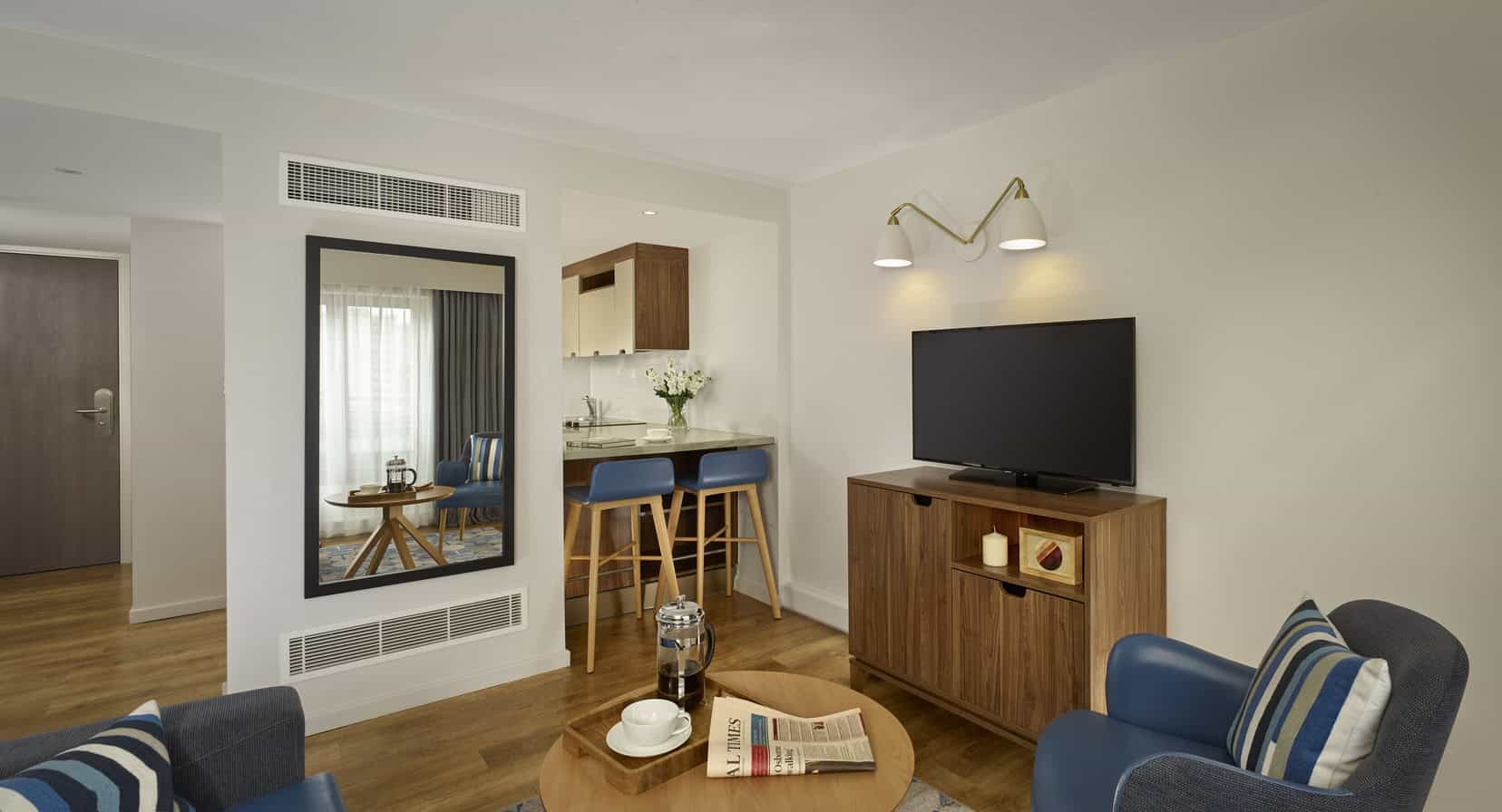 Perfect for both business and leisure stays, Barbican Goswell Road Aparthotel places guests within easy reach of some of London’s best restaurants, cafés, and markets. Nearby St. John Street is home to favourites like Burger and Lobster, Tinseltown, and Workshop Coffee, all within an 8-minute walk. For those planning to cook, Tesco Express is just two minutes from the aparthotel, with a larger Waitrose located five minutes away. Each apartment features a fully equipped kitchenette, spacious living area, modern bathroom, and high-speed Wi-Fi—ideal for longer stays or travellers who value comfort and independence while exploring or working in London.