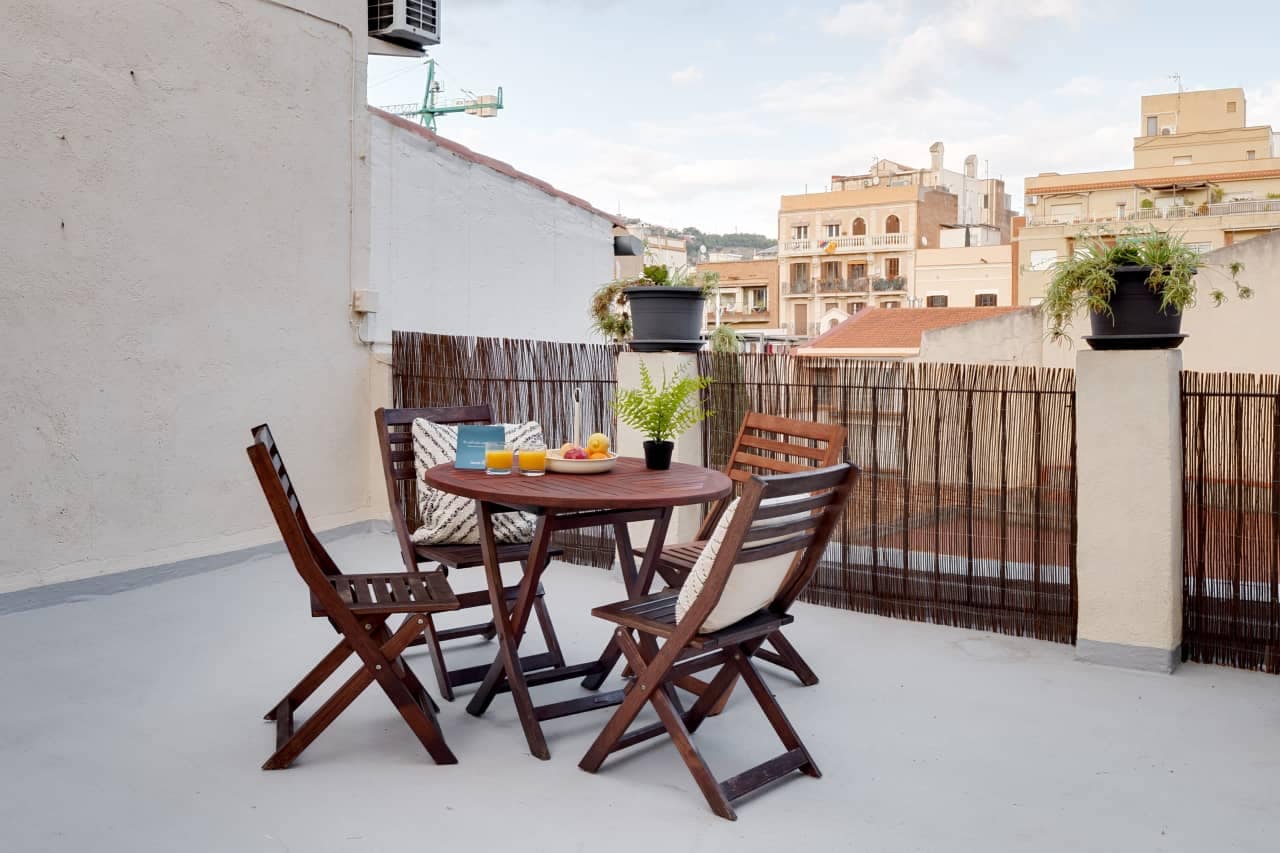 Nestled in the heart of Barcelona’s charming Gracia district, the Barcelona Atic in Gracia studio apartment offers an intimate and stylish retreat for two guests. This bright, 30m² space has been thoughtfully decorated by our local interior designer, blending uplifting yellows, calming blues, and warm natural light to create a cheerful, sunny atmosphere. The layout maximises comfort and style, with a cosy living area, a fresh white kitchen perfect for preparing light meals, and a private terrace that spans the length of the apartment. From this wide patio, you can enjoy sweeping views over the city—ideal for a morning coffee or an evening glass of wine as the sun sets.
