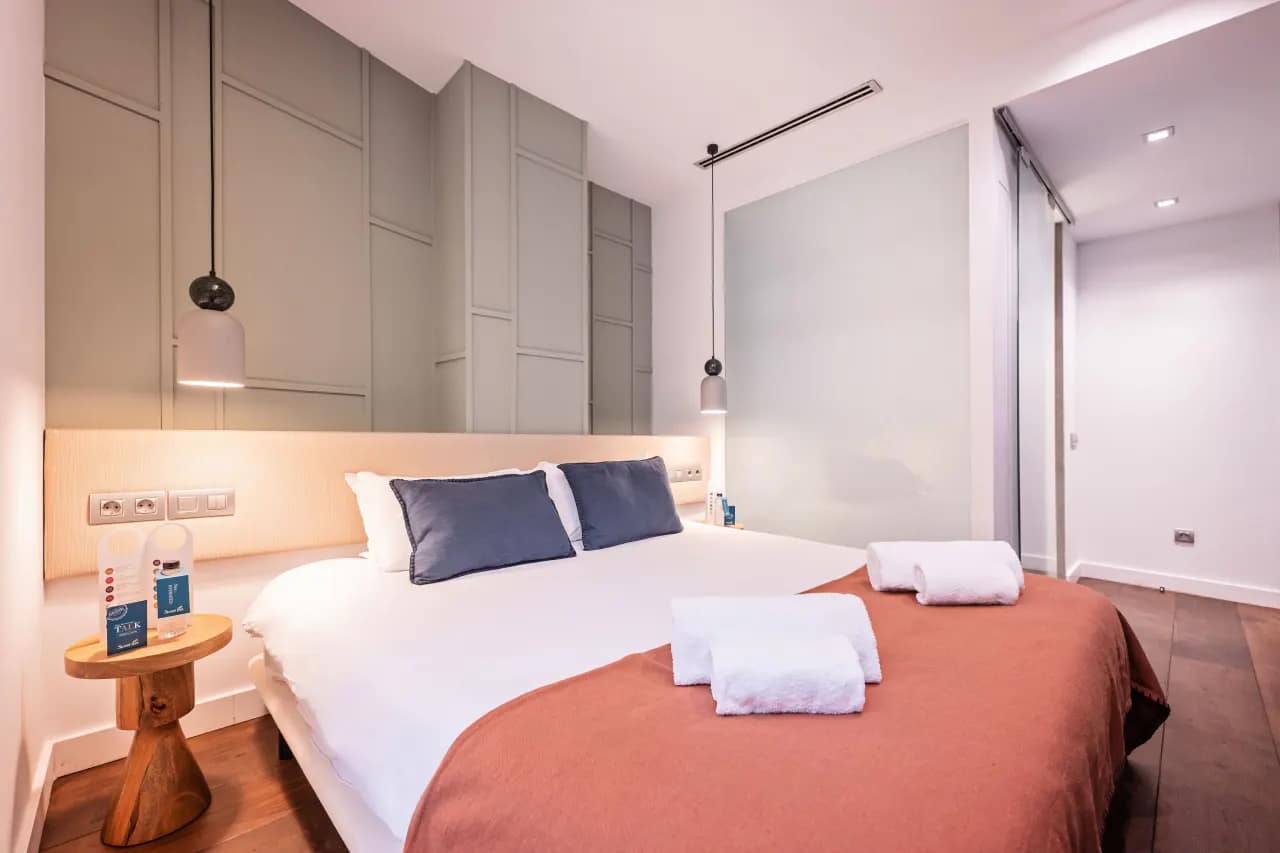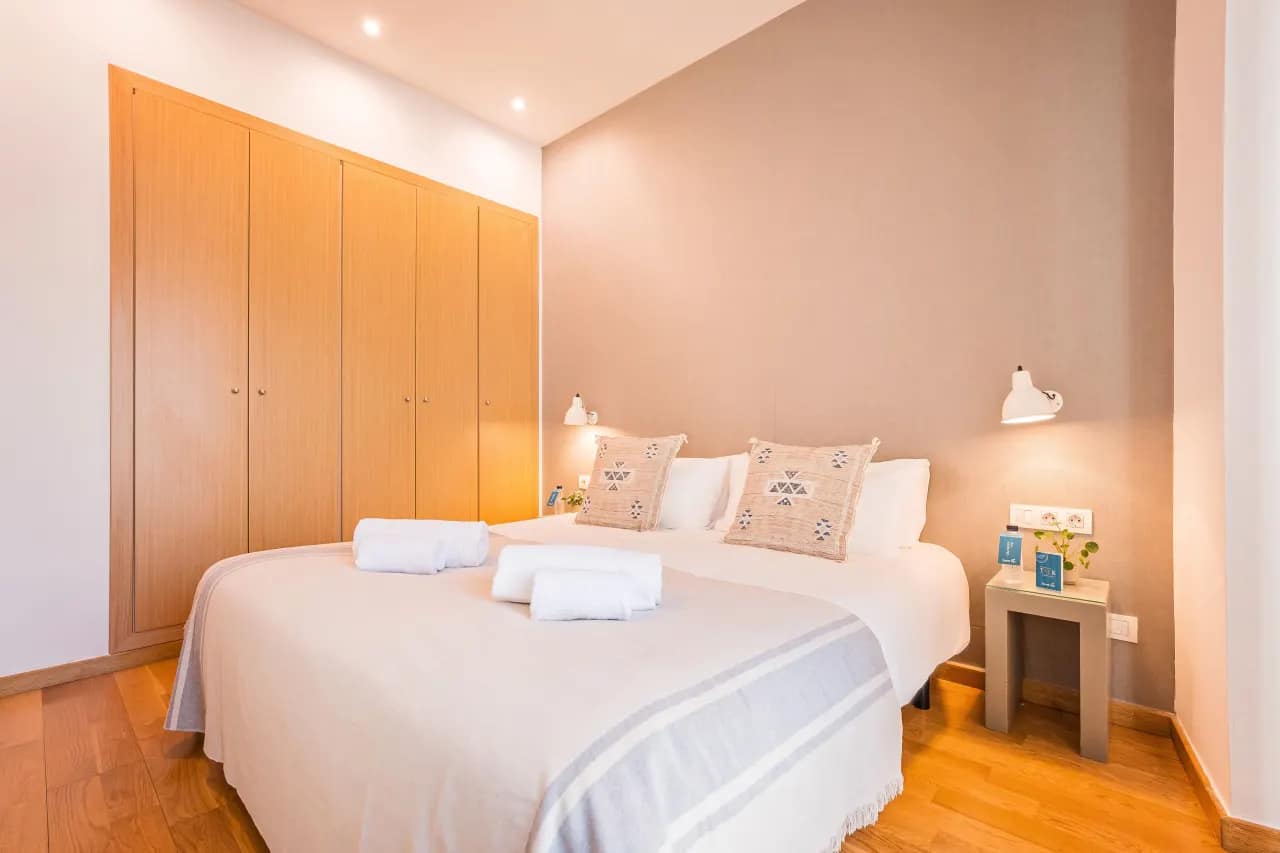 Barcelona La Pedrera Apartments offer a spacious and stylish retreat in the heart of the Eixample district, combining historic charm with modern comfort. With four bedrooms, two bathrooms, and 110m² of living space, this inviting apartment accommodates up to nine guests, making it ideal for families or groups of friends traveling together. Thoughtfully designed by our local interior team, the apartment features a mix of eclectic décor and contemporary touches, complete with three double beds, two single beds, and a sofa bed for flexible sleeping arrangements. A state-of-the-art kitchen, open dining area, and two well-appointed bathrooms provide all the comforts of home, while the private balcony invites you to enjoy sweeping city views. Please note that two of the four bedrooms are adjoining, with the second accessible via the master bedroom.
