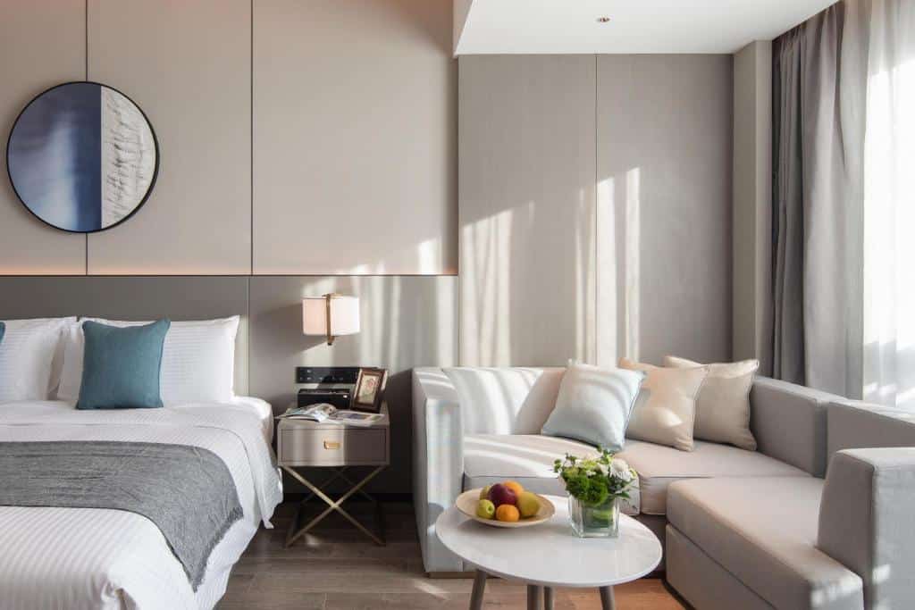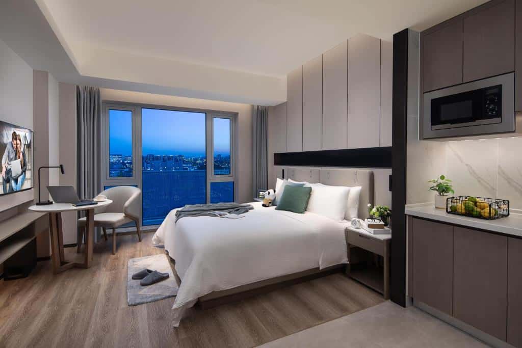 The property features 187 spacious and thoughtfully designed units, from comfortable Standard Rooms to generous Two-Bedroom Apartments, catering to both short- and long-term guests. Some units can be connected to create larger living spaces—ideal for families or business travellers seeking flexibility. Inspired by Beijing’s traditional hutongs and natural elements, each apartment features modern interiors, floor-to-ceiling windows, and warm natural light. Select apartments are equipped with fully fitted kitchens, while all units include premium appliances, high-speed internet, international and domestic TV channels, and access to hotel-style services such as buffet breakfast, housekeeping, 24-hour reception, and security.