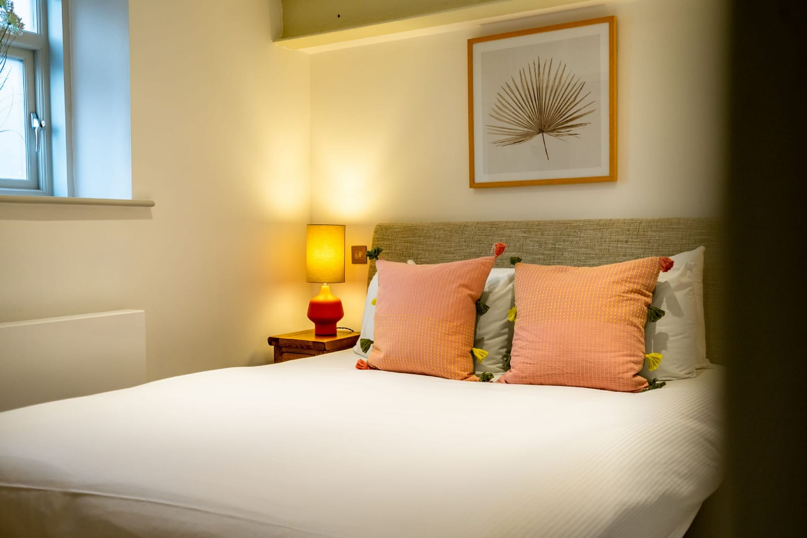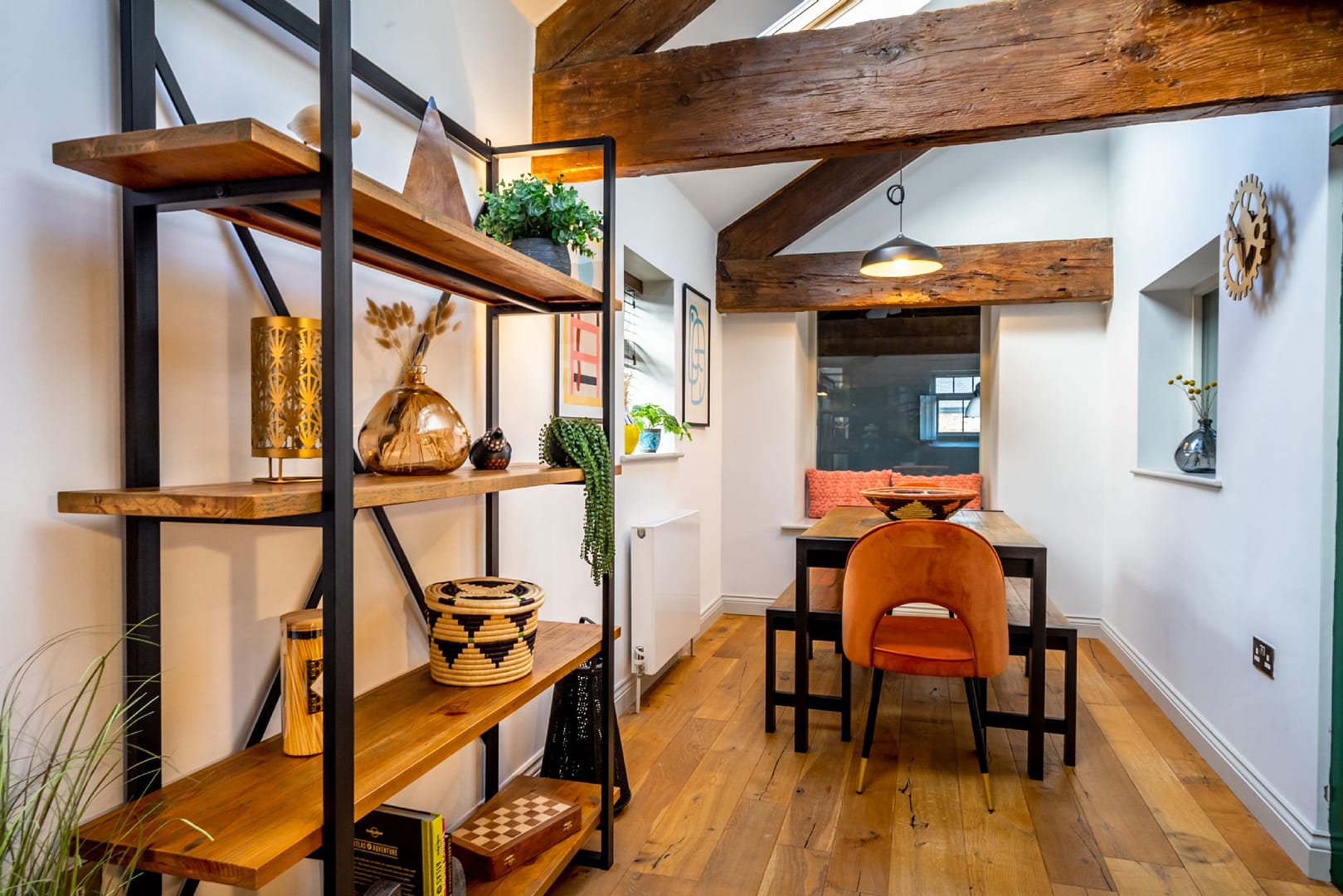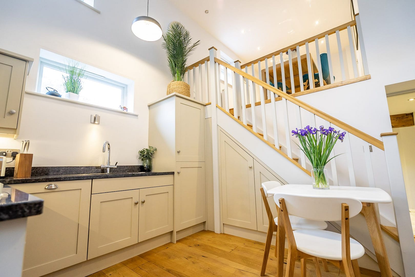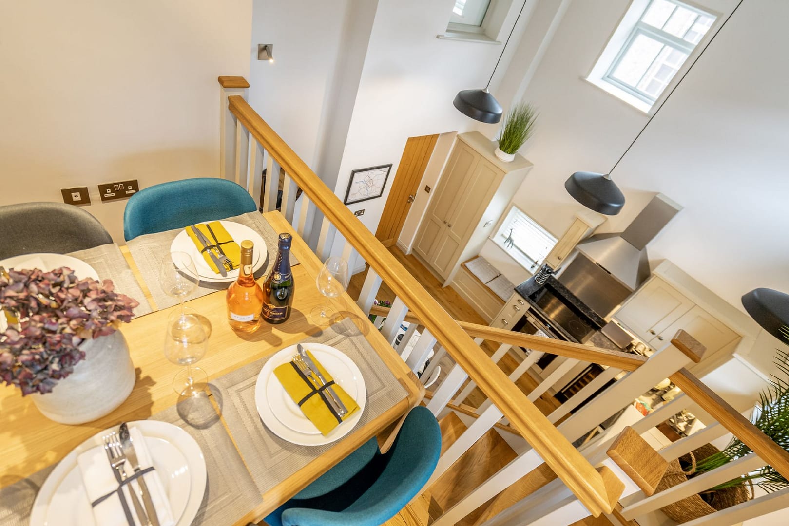 The open-plan ground floor is the heart of the property, seamlessly combining a chic dining area, contemporary fitted kitchen, and stylish living space. Guests can enjoy a 55” Smart TV with Netflix, a PURE Bluetooth radio, and a Nespresso machine, while the fully equipped kitchen features premium touches such as a full-size Miele fridge freezer, dishwasher, and gas hob. Local York artwork, including an original painting of tipsy racegoers on Petergate, adds a playful character to the décor. A wood-burning stove provides both warmth and ambience during the cooler months, while the dining area seats four comfortably for relaxed meals. Outside, a private courtyard with seating for six makes for a perfect summer retreat, and the secure layout offers a safe space for pets to enjoy some fresh air.