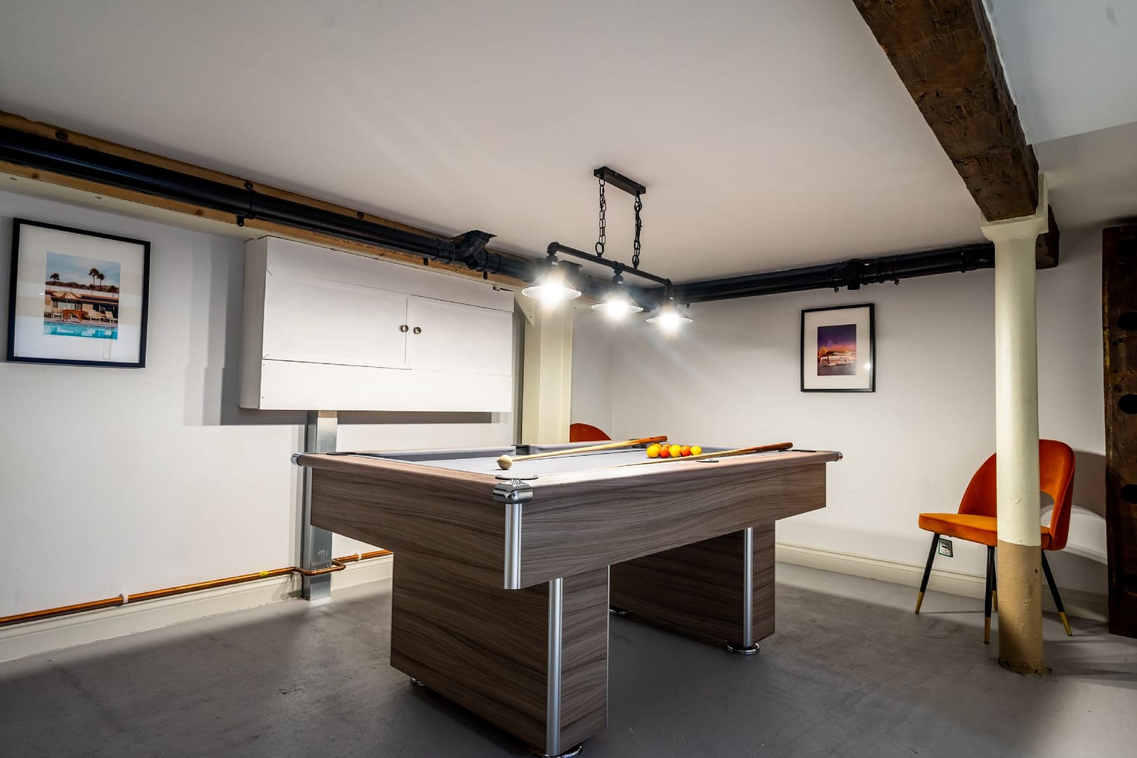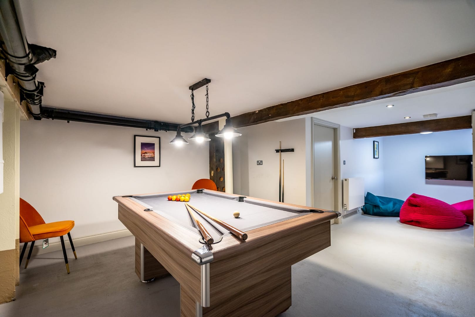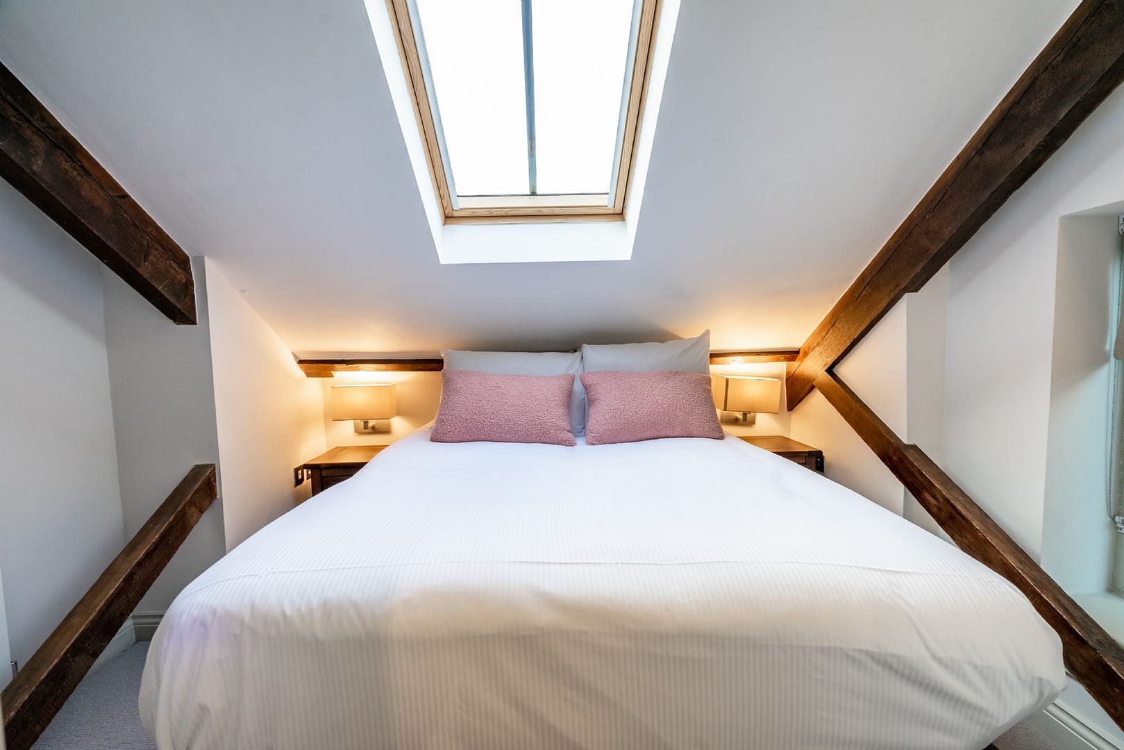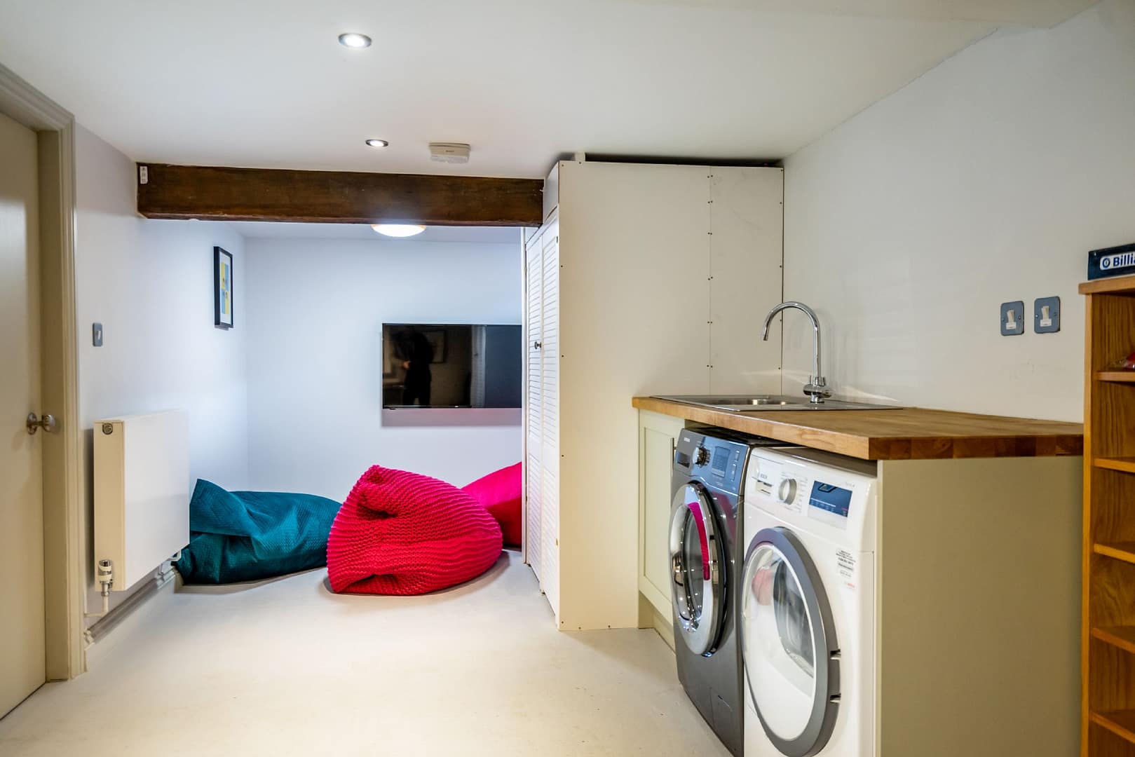 The open-plan ground floor is the heart of the property, seamlessly combining a chic dining area, contemporary fitted kitchen, and stylish living space. Guests can enjoy a 55” Smart TV with Netflix, a PURE Bluetooth radio, and a Nespresso machine, while the fully equipped kitchen features premium touches such as a full-size Miele fridge freezer, dishwasher, and gas hob. Local York artwork, including an original painting of tipsy racegoers on Petergate, adds a playful character to the décor. A wood-burning stove provides both warmth and ambience during the cooler months, while the dining area seats four comfortably for relaxed meals. Outside, a private courtyard with seating for six makes for a perfect summer retreat, and the secure layout offers a safe space for pets to enjoy some fresh air.