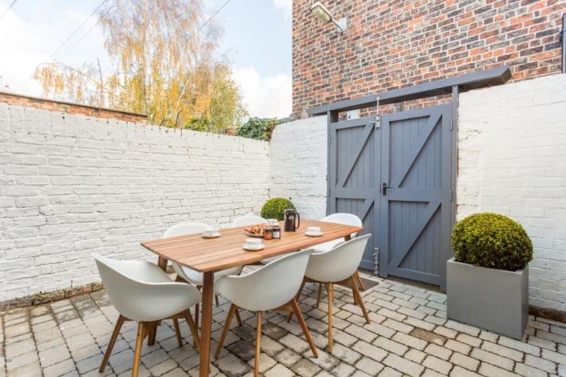 The open-plan ground floor is the heart of the property, seamlessly combining a chic dining area, contemporary fitted kitchen, and stylish living space. Guests can enjoy a 55” Smart TV with Netflix, a PURE Bluetooth radio, and a Nespresso machine, while the fully equipped kitchen features premium touches such as a full-size Miele fridge freezer, dishwasher, and gas hob. Local York artwork, including an original painting of tipsy racegoers on Petergate, adds a playful character to the décor. A wood-burning stove provides both warmth and ambience during the cooler months, while the dining area seats four comfortably for relaxed meals. Outside, a private courtyard with seating for six makes for a perfect summer retreat, and the secure layout offers a safe space for pets to enjoy some fresh air.