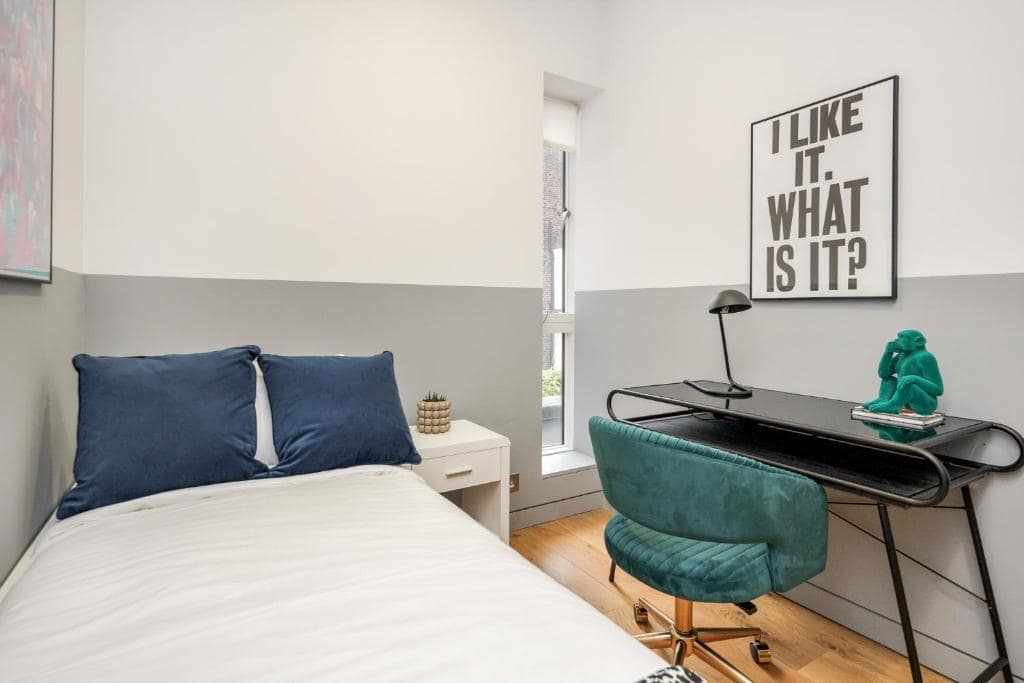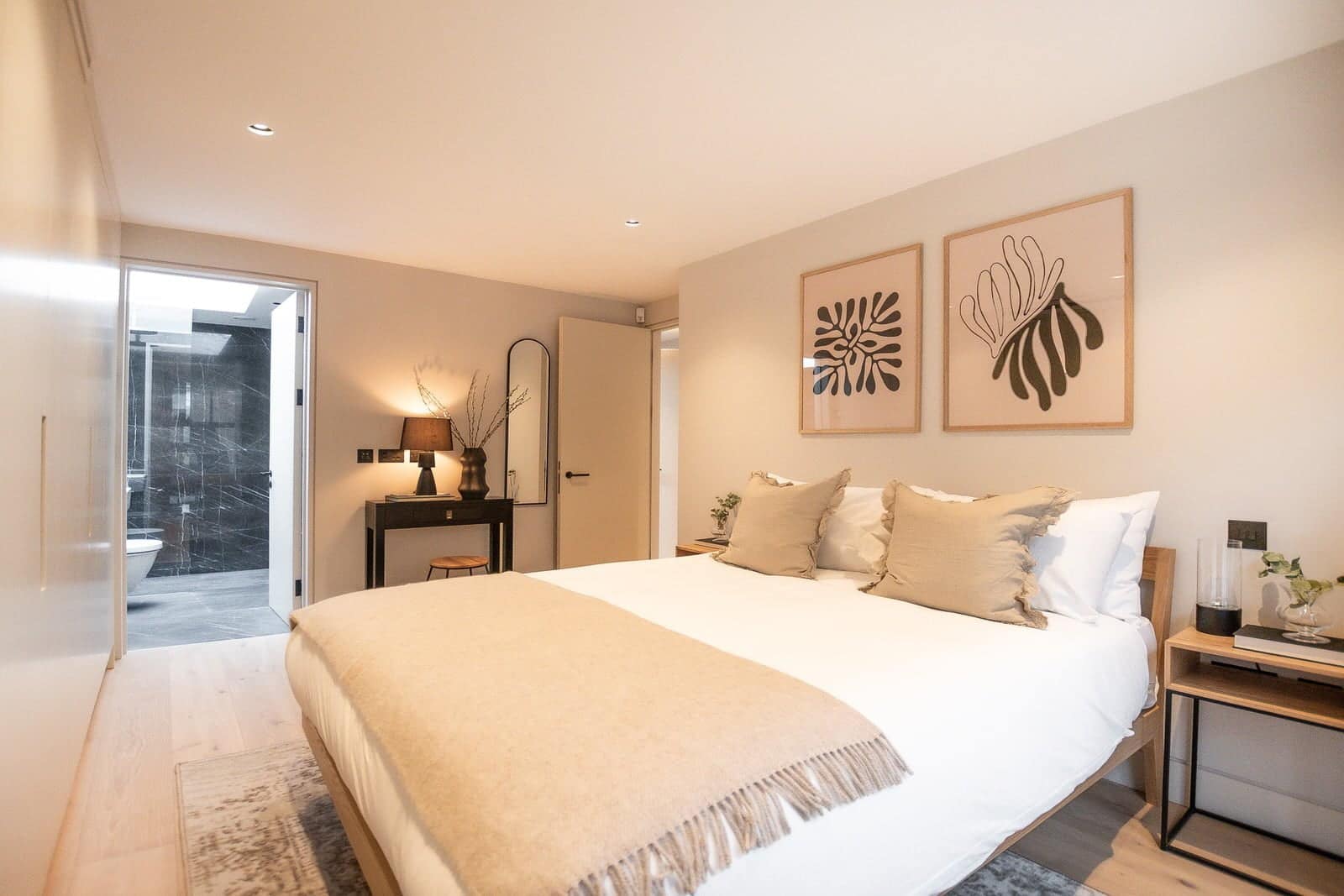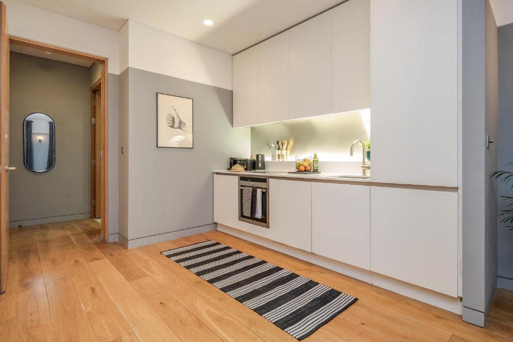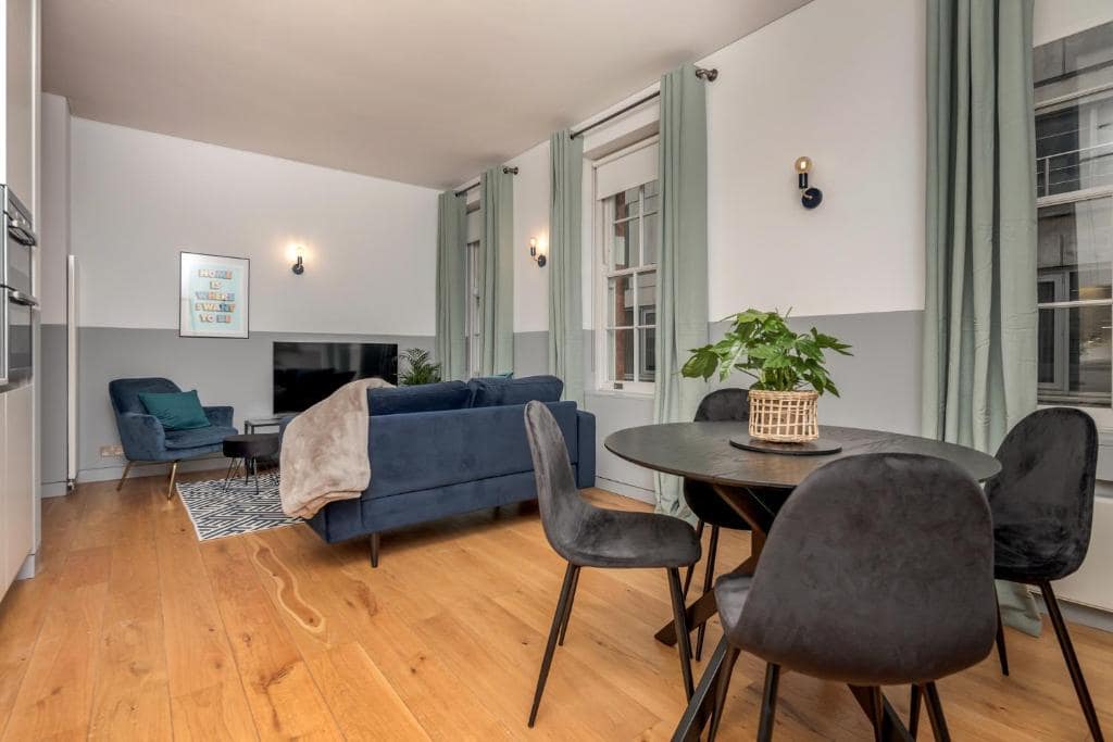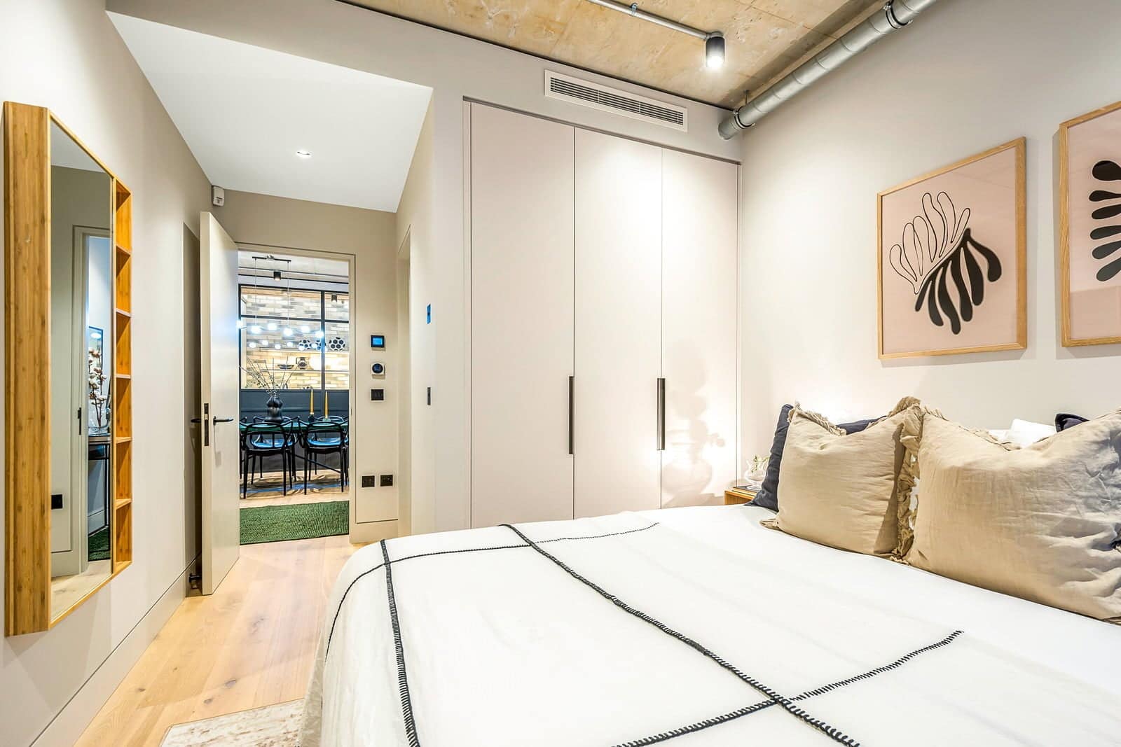 Inside, every apartment includes open plan living areas, bespoke fitted kitchens, and sleek bathrooms with premium fixtures. Layouts include a luxurious two bedroom penthouse with a private terrace and a spacious three-bedroom duplex ideal for families or professional sharers. Many apartments feature dual-aspect views, private balconies, or roof terraces, perfect for relaxing, entertaining, or working from home. Oversized windows create bright interiors while maintaining a tranquil feel. All apartments come fully furnished and include integrated appliances, underfloor heating, and advanced smart home features. With so much flexibility, these spaces are ideal for corporate stays or longer term relocations.