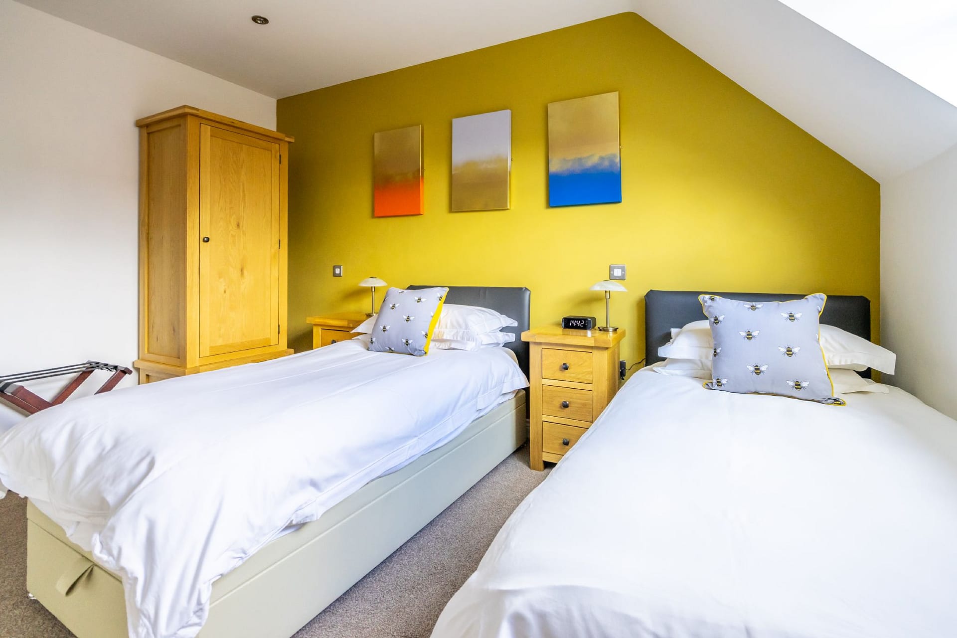 Inside, the apartment is thoughtfully designed with attention to both style and functionality. The master bedroom features a king-size bed, while the second bedroom is furnished with twin beds, offering flexible sleeping arrangements to suit different groups. Two well-appointed bathrooms add convenience, including a bath with an overhead shower and a separate shower for a spa-like experience. The open-plan living space combines comfort and elegance, with a sleek, fully equipped kitchen featuring an oven, electric hob, fridge freezer, dishwasher, and washer/dryer, as well as a dining area perfect for enjoying meals together. Modern entertainment options include a Smart TV, Freeview, and free unlimited WiFi, ensuring guests stay connected and entertained throughout their visit.