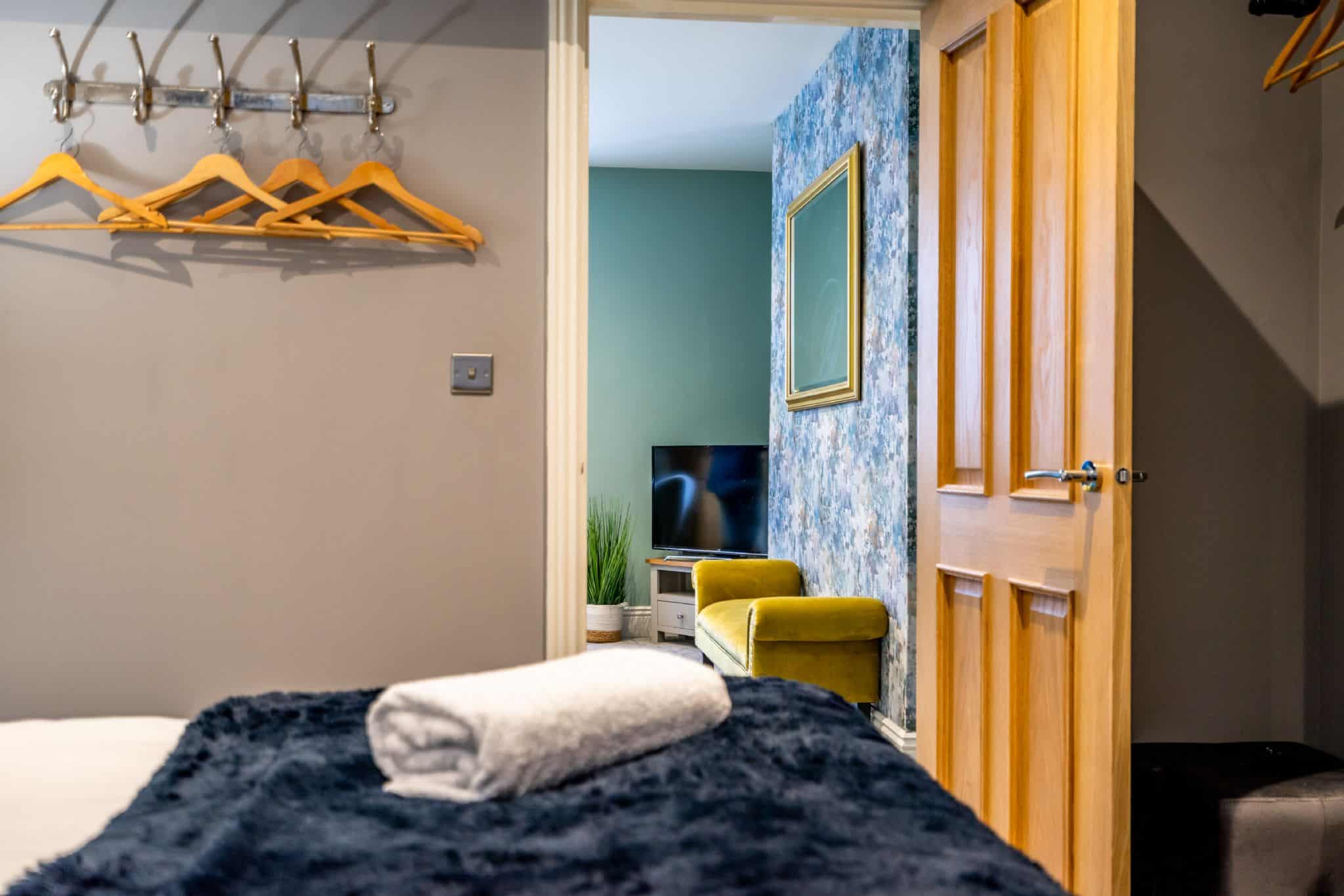 Inside, the apartment is thoughtfully designed for comfort and practicality. The living space features a comfortable sofa that converts into a bed for an occasional extra guest, alongside a Smart LCD TV, office nook, and a dining area with seating for four. The bedroom is furnished with a sumptuous king size bed, ensuring a restful night’s sleep after a day exploring York. The kitchen is fully equipped with modern appliances, including a coffee machine, oven, electric hob, fridge freezer, washer & dryer, microwave, kettle, toaster, and all the necessary cutlery and crockery, making self-catering simple and enjoyable.
