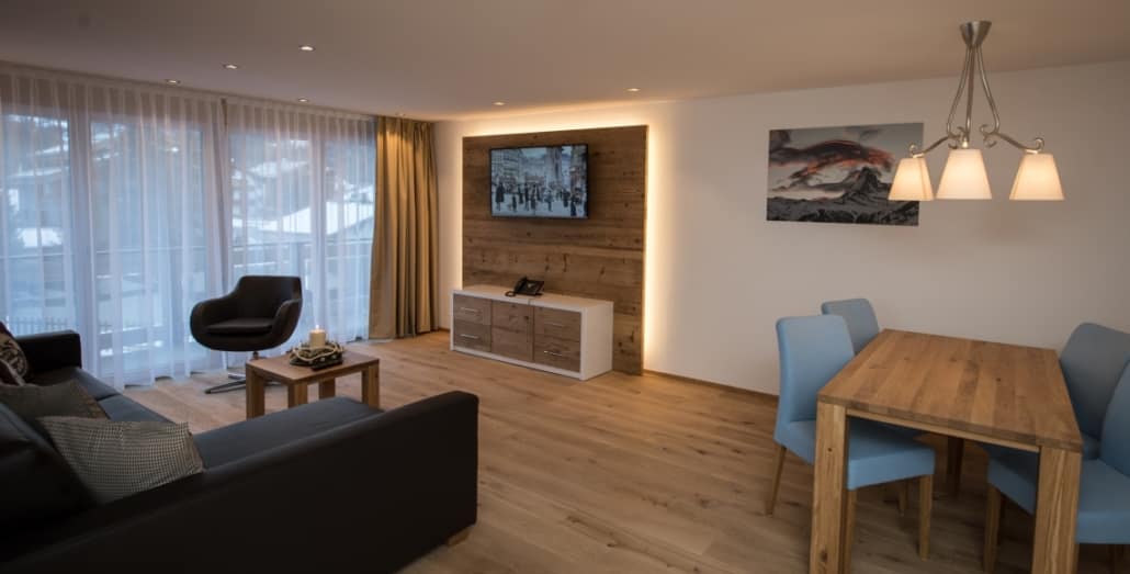 Guests at Boutique Hotel Matthiol also have access to a suite of hotel-style amenities to enhance their alpine experience. The property includes a spa with sauna, steam bath, and jacuzzi for relaxation after a day of skiing or hiking. A ski room with boot warmers provides convenient storage for winter gear, and the apartments are close to local ski rental shops and the Gornergrat railway. On-site parking is available, and concierge services can assist with arranging ski passes, mountain excursions, and restaurant reservations. The combination of fully furnished apartments, prime Zermatt location, and access to wellness and concierge services makes Matthiol an ideal choice for both short and extended stays in the Swiss Alps.