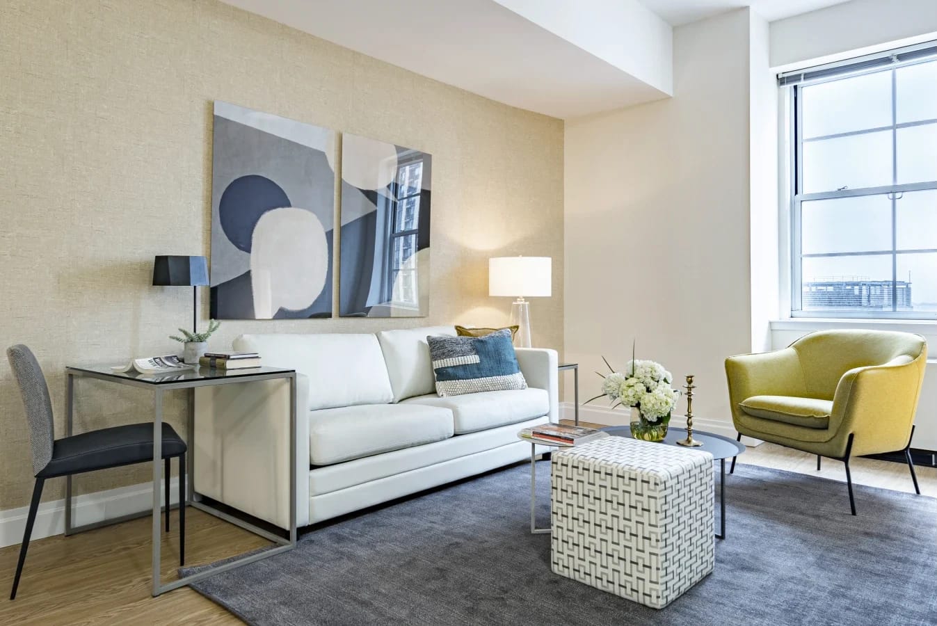 These spacious one-bedroom serviced apartments are set in a striking art deco building just steps from the Financial District and Battery Park in downtown Manhattan. Each unit features oversized windows, hardwood floors, and high ceilings that create a bright and airy atmosphere. Designed with modern convenience in mind, the apartments include fully equipped kitchens with granite countertops, stainless steel appliances, and in-unit or floor-level laundry access. Queen-sized beds, contemporary furnishings, and dedicated workspaces ensure comfort and functionality for both business and leisure travelers alike.