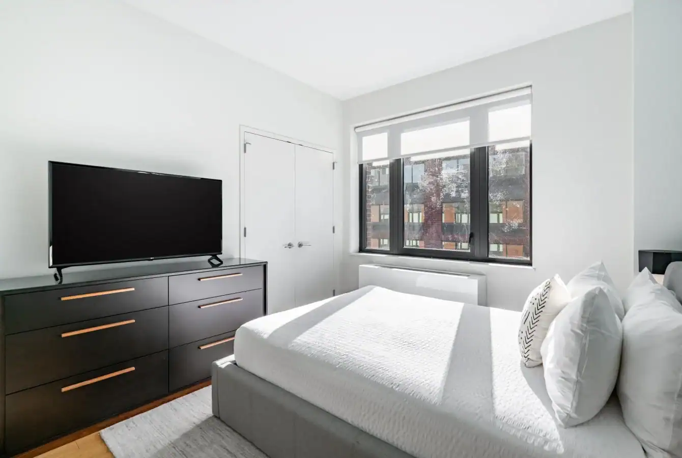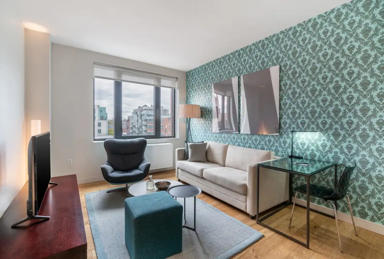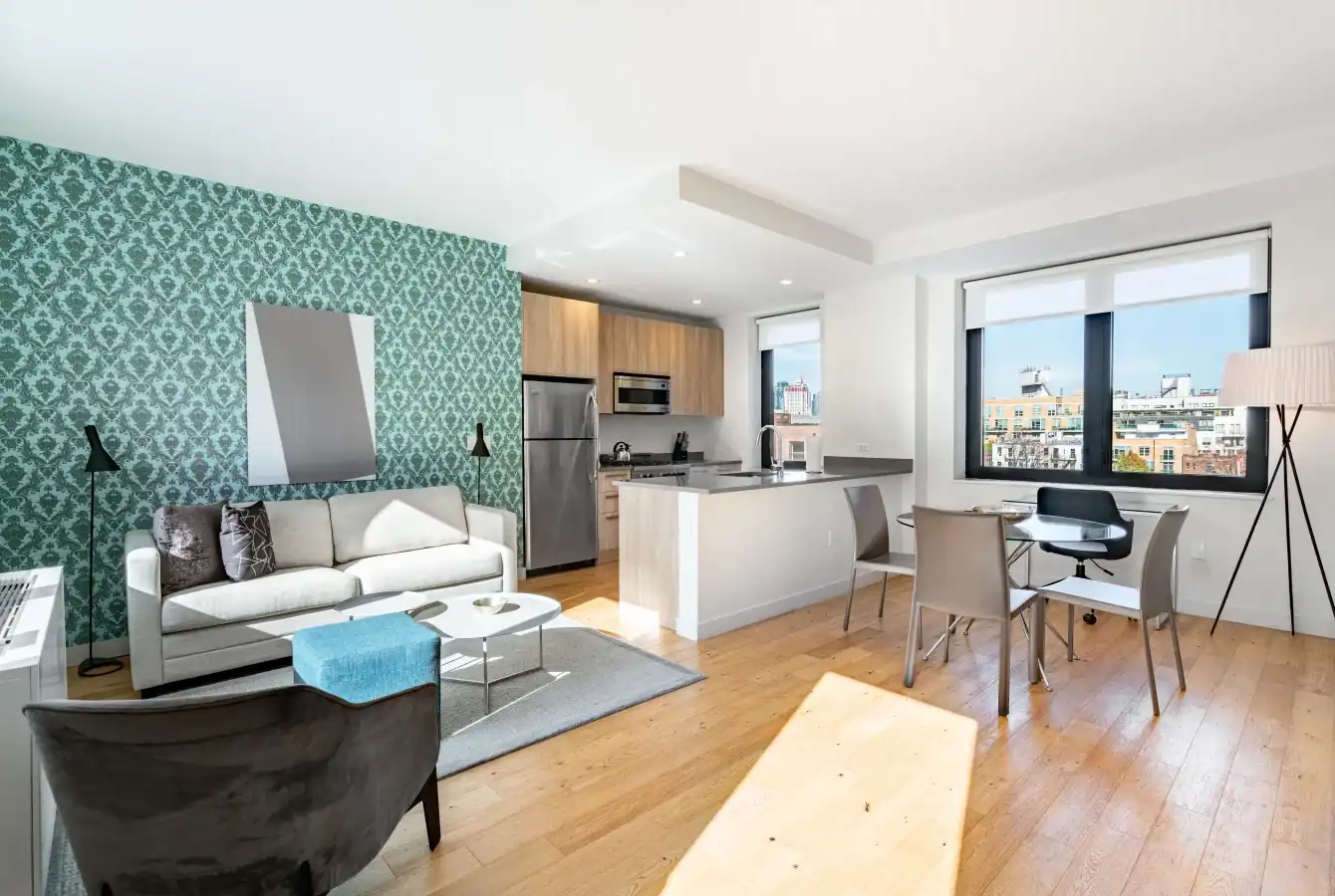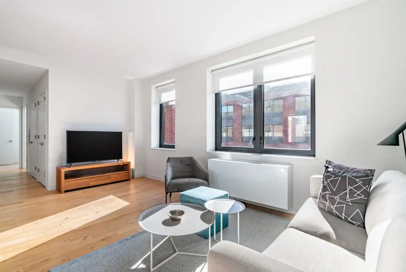 These serviced apartments in the heart of Williamsburg, Brooklyn, offer a stylish blend of modern design and everyday comfort. Available in one- and two-bedroom layouts, each unit features oversized windows, an open-concept floor plan, in-unit washer/dryer, and stainless steel appliances. Queen-sized beds are provided in both bedroom types, with the two-bedroom units offering an ideal setup for families, roommates, or professionals needing extra space. Interiors are elevated with light-filled rooms, Caesarstone quartz backsplashes, polished countertops, and spa-inspired bathrooms with custom Lineadecor vanities, mosaic flooring, and sleek Nemo-tiled showers—perfect for long-term stays or transitional living.