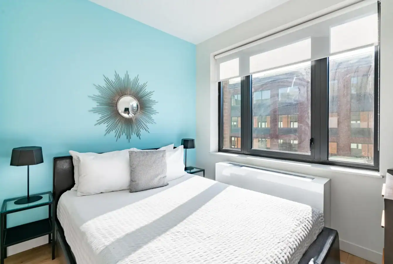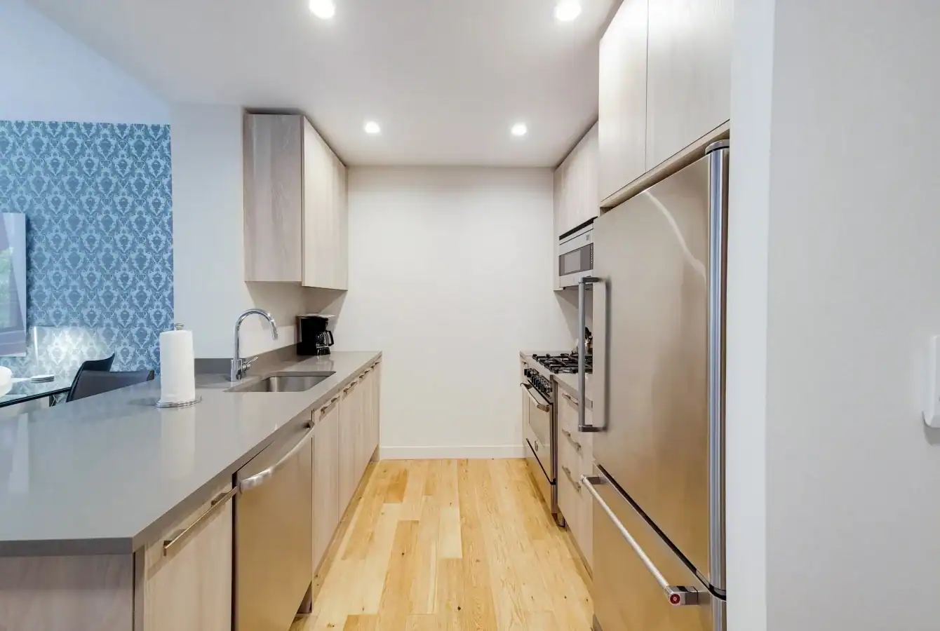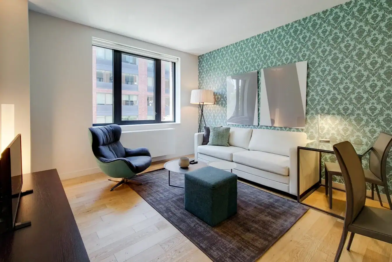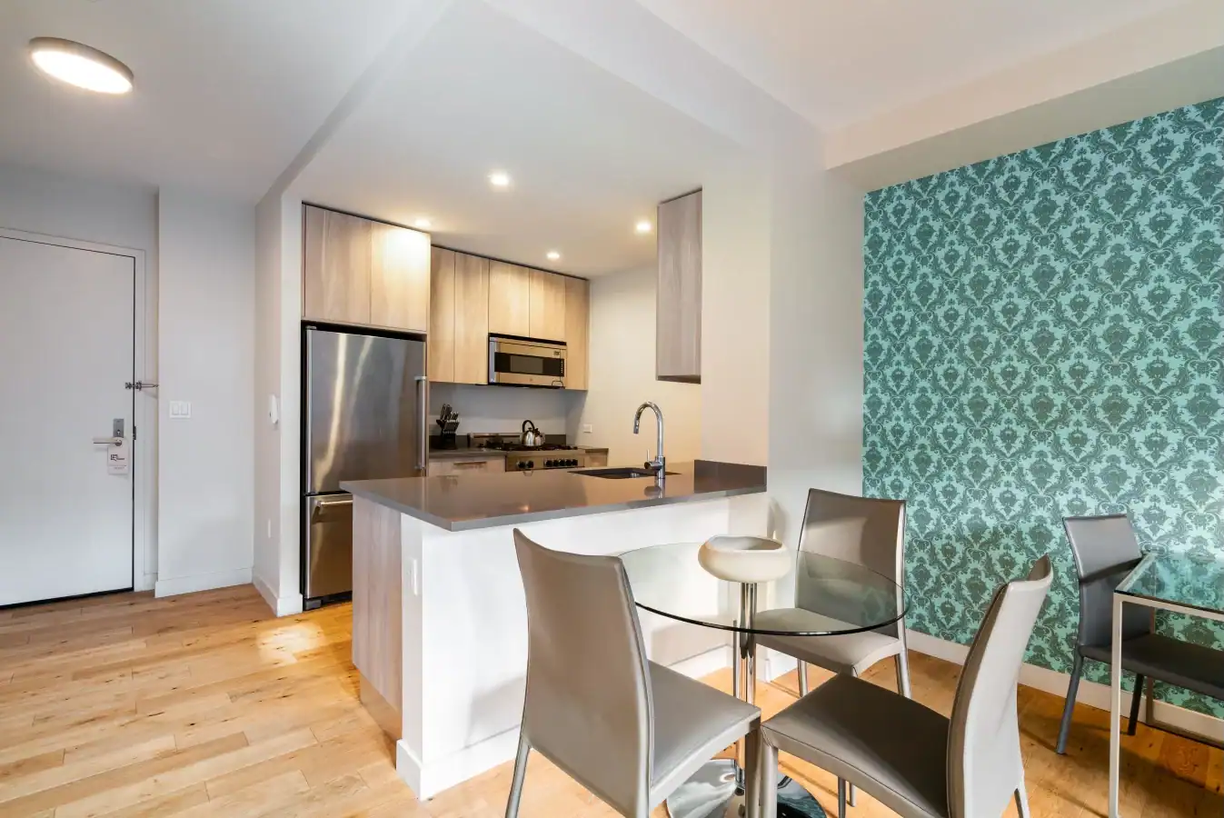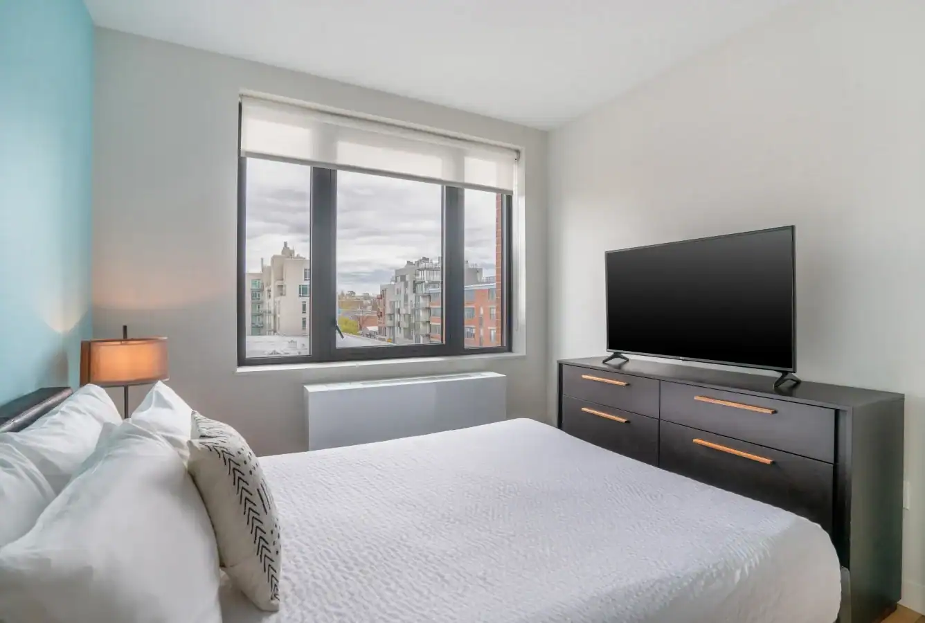 These serviced apartments in the heart of Williamsburg, Brooklyn, offer a stylish blend of modern design and everyday comfort. Available in one- and two-bedroom layouts, each unit features oversized windows, an open-concept floor plan, in-unit washer/dryer, and stainless steel appliances. Queen-sized beds are provided in both bedroom types, with the two-bedroom units offering an ideal setup for families, roommates, or professionals needing extra space. Interiors are elevated with light-filled rooms, Caesarstone quartz backsplashes, polished countertops, and spa-inspired bathrooms with custom Lineadecor vanities, mosaic flooring, and sleek Nemo-tiled showers—perfect for long-term stays or transitional living.