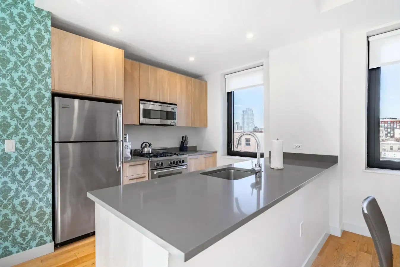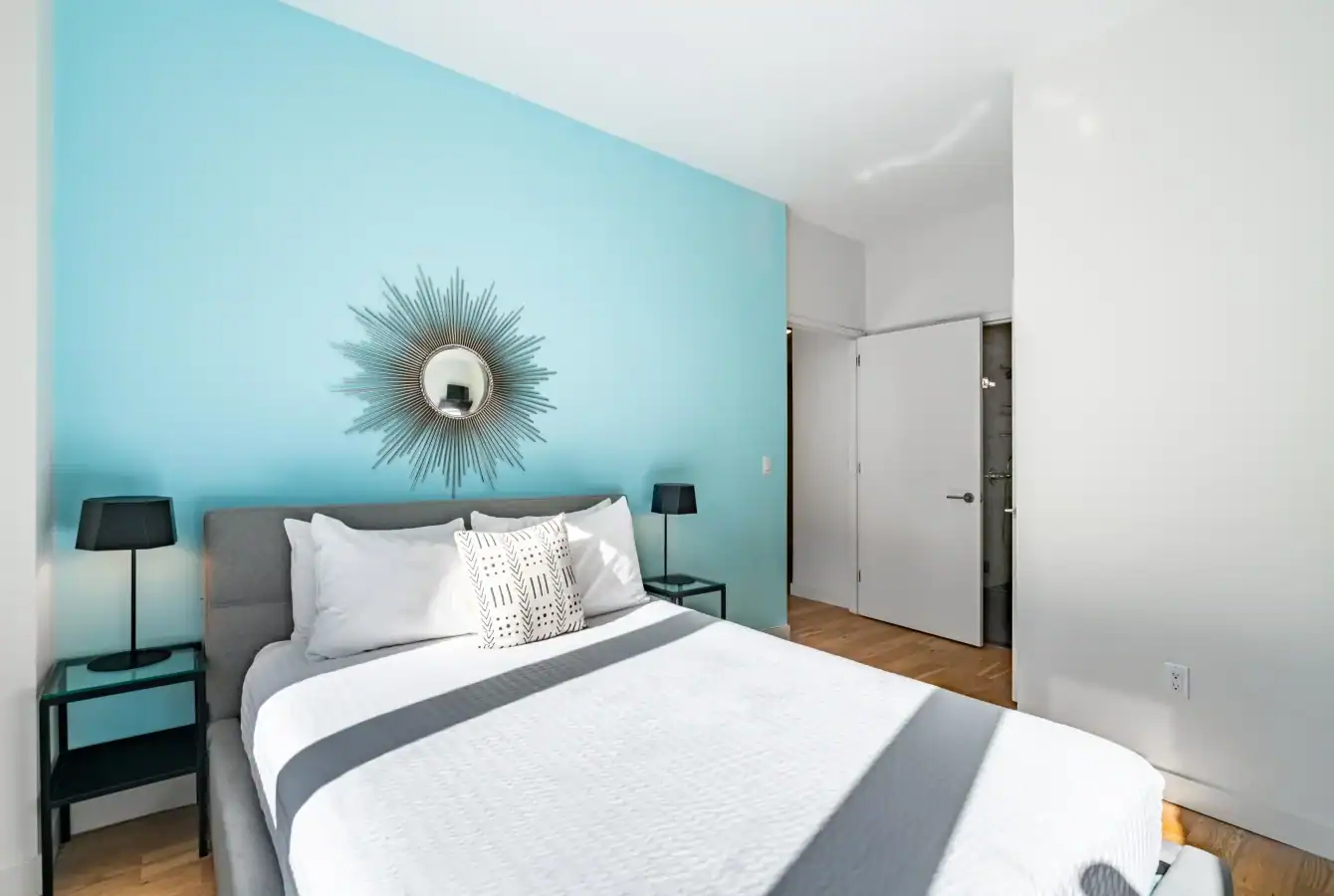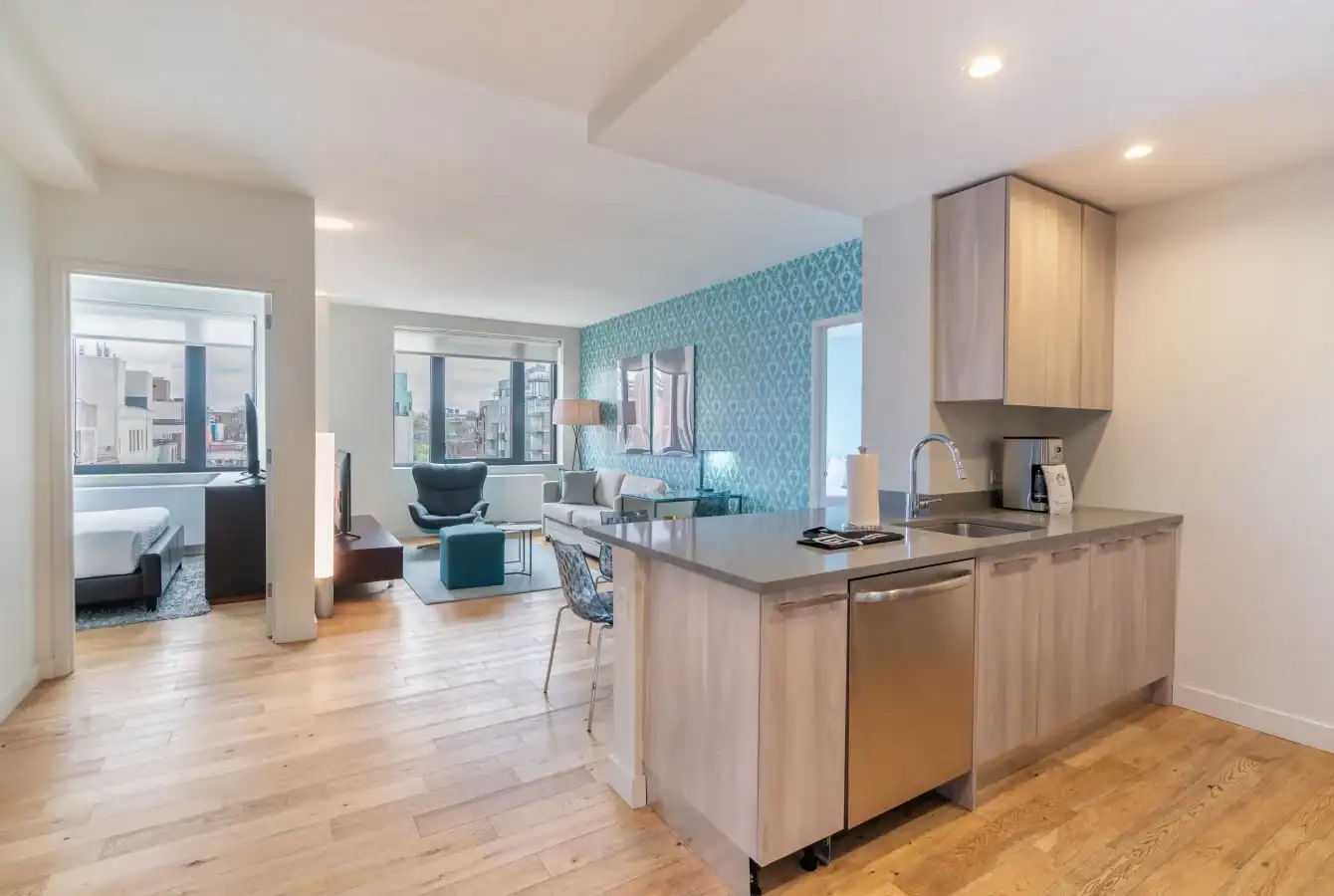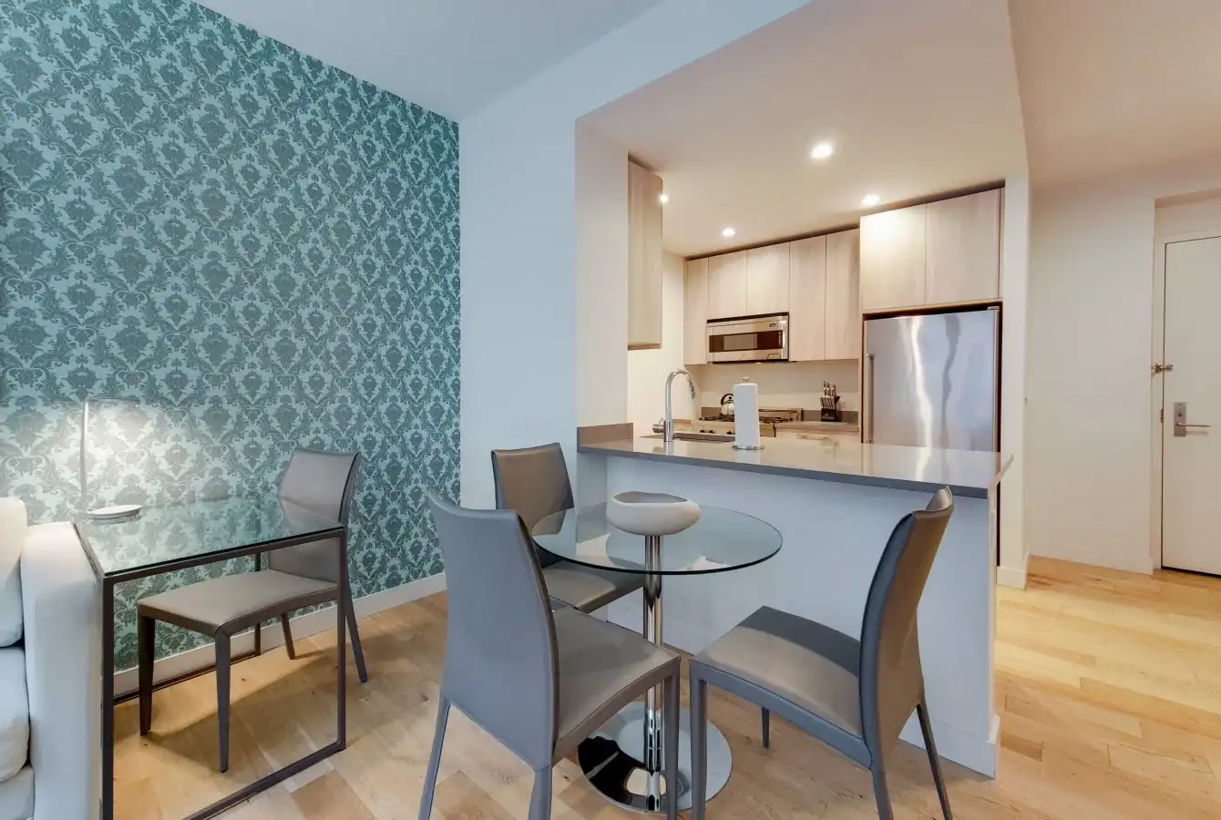 These serviced apartments in the heart of Williamsburg, Brooklyn, offer a stylish blend of modern design and everyday comfort. Available in one- and two-bedroom layouts, each unit features oversized windows, an open-concept floor plan, in-unit washer/dryer, and stainless steel appliances. Queen-sized beds are provided in both bedroom types, with the two-bedroom units offering an ideal setup for families, roommates, or professionals needing extra space. Interiors are elevated with light-filled rooms, Caesarstone quartz backsplashes, polished countertops, and spa-inspired bathrooms with custom Lineadecor vanities, mosaic flooring, and sleek Nemo-tiled showers—perfect for long-term stays or transitional living.