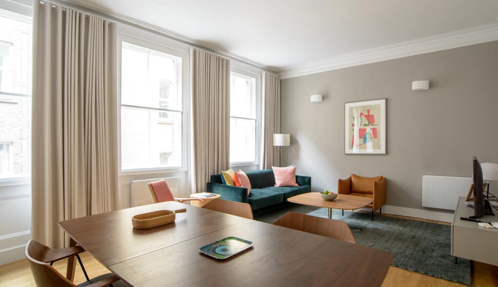Inside, each apartment is thoughtfully designed to balance comfort with style. Open-plan living areas feel bright and spacious thanks to large windows that flood the space with natural light. Fully equipped kitchens allow guests to prepare their own meals easily, whether it’s a quick breakfast before meetings or a relaxed dinner after exploring the city. Bedrooms feature plush bedding and generous storage, helping guests feel at home and well-rested throughout their stay. Sleek bathrooms with modern fixtures and walk-in showers offer a fresh and calming start to each day. The thoughtfully arranged layouts and tasteful décor create an inviting environment perfect for longer stays or short city breaks.