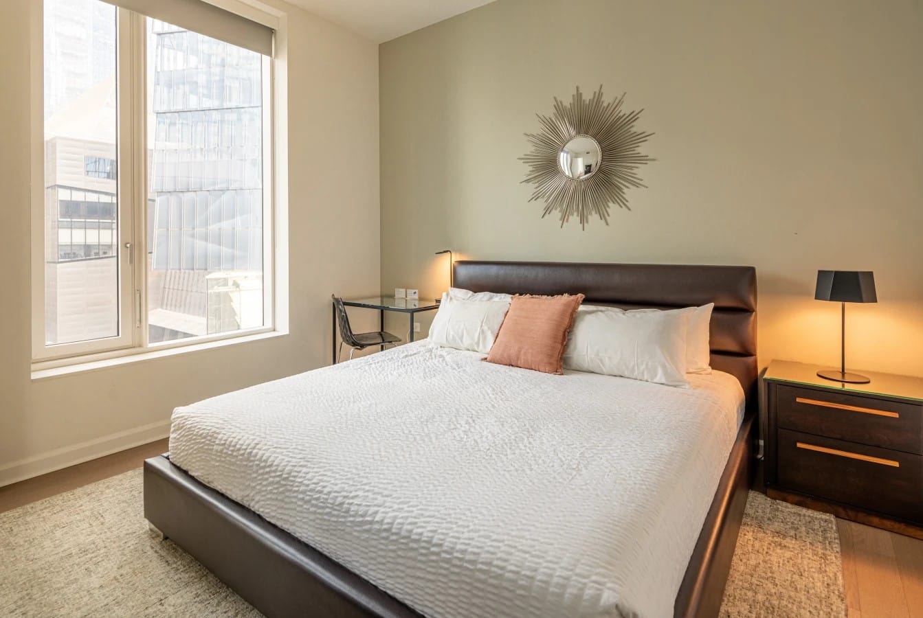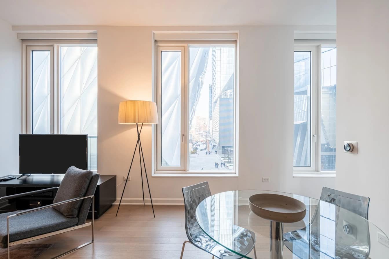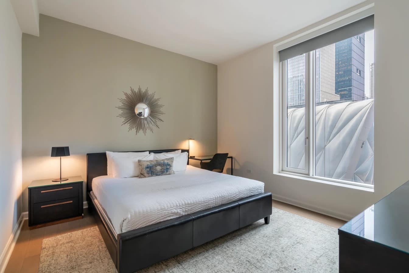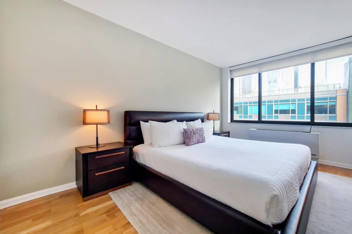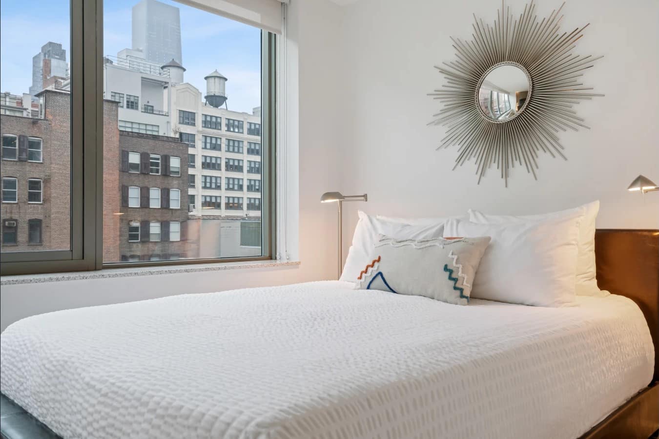 Chelsea Galleries Apartments offers an exceptional residential experience in the heart of Manhattan’s Chelsea neighborhood, directly adjacent to the iconic High Line. This well-appointed one-bedroom, one-bath apartment showcases a modern, open-concept layout designed for both comfort and style. Featuring 9-foot ceilings, floor-to-ceiling windows, and engineered wood flooring, the apartment is flooded with natural light and offers scenic views of the Empire State Building, the New York Times Building, and the Hudson River. The kitchen is fully equipped with stainless steel appliances, quartz countertops, and sleek cabinetry, while the in-unit washer/dryer and individually controlled air conditioning add convenience. The queen-size bed is dressed in plush linens, providing a restful retreat in the heart of the city.