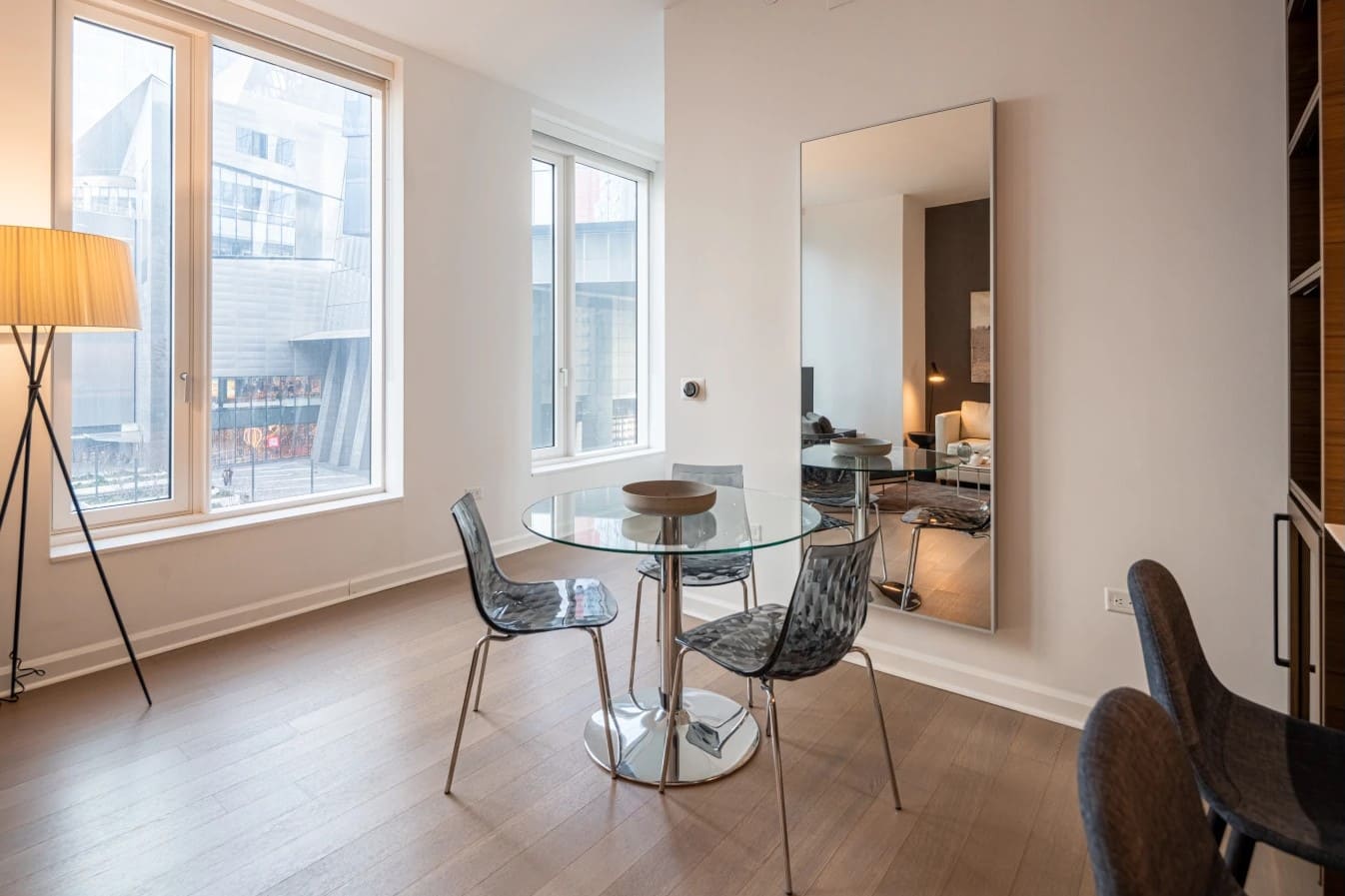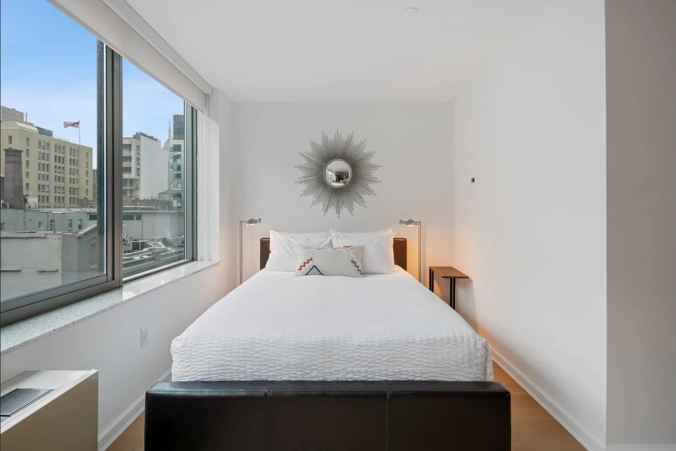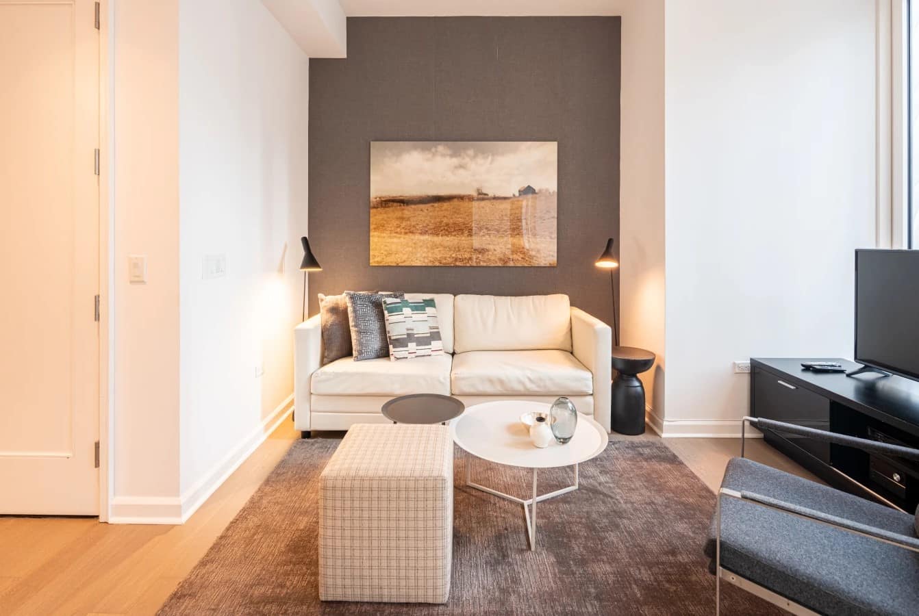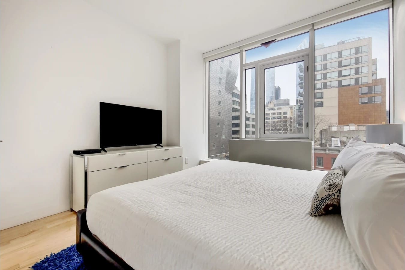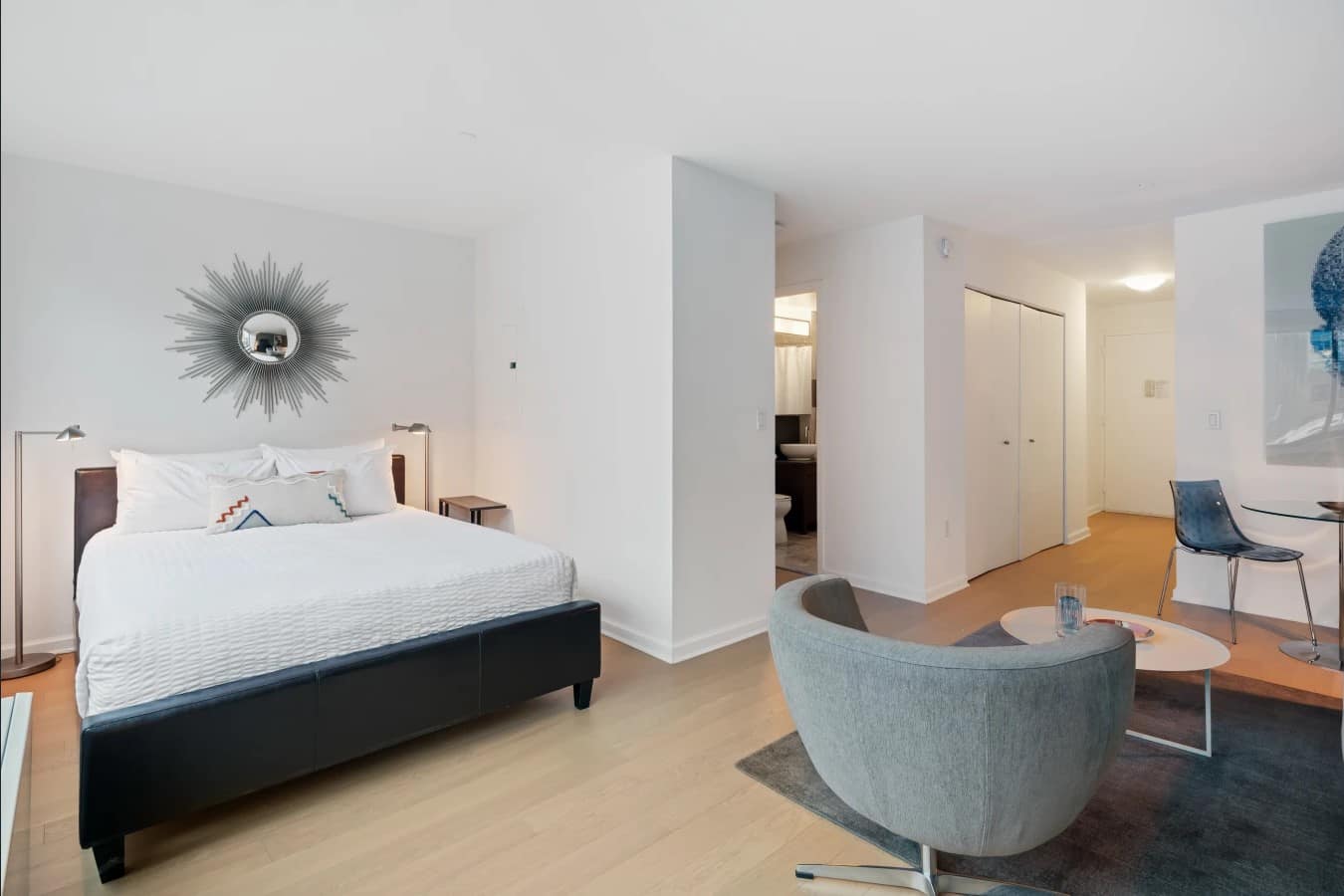 Chelsea Galleries Apartments offers an exceptional residential experience in the heart of Manhattan’s Chelsea neighborhood, directly adjacent to the iconic High Line. This well-appointed one-bedroom, one-bath apartment showcases a modern, open-concept layout designed for both comfort and style. Featuring 9-foot ceilings, floor-to-ceiling windows, and engineered wood flooring, the apartment is flooded with natural light and offers scenic views of the Empire State Building, the New York Times Building, and the Hudson River. The kitchen is fully equipped with stainless steel appliances, quartz countertops, and sleek cabinetry, while the in-unit washer/dryer and individually controlled air conditioning add convenience. The queen-size bed is dressed in plush linens, providing a restful retreat in the heart of the city.