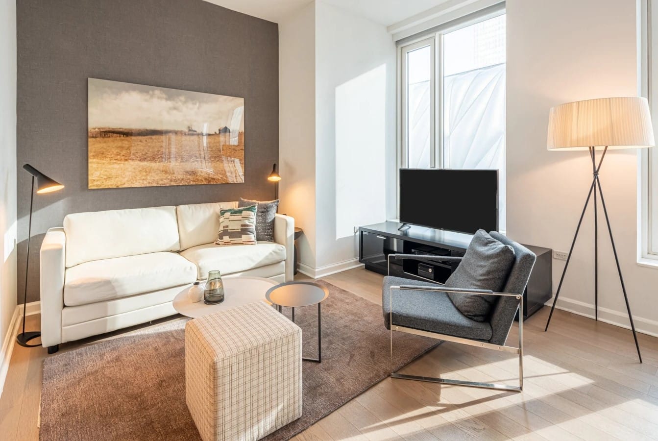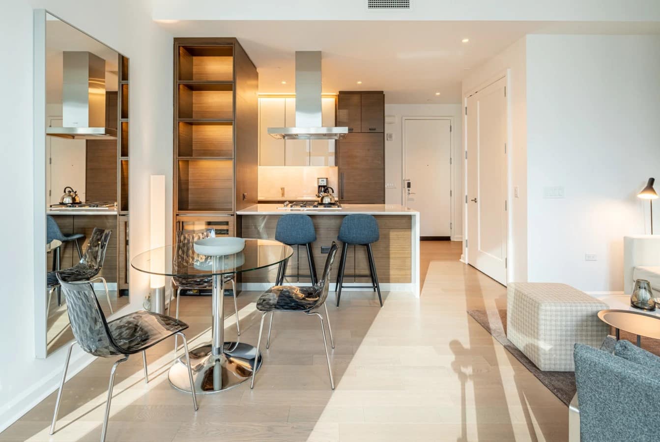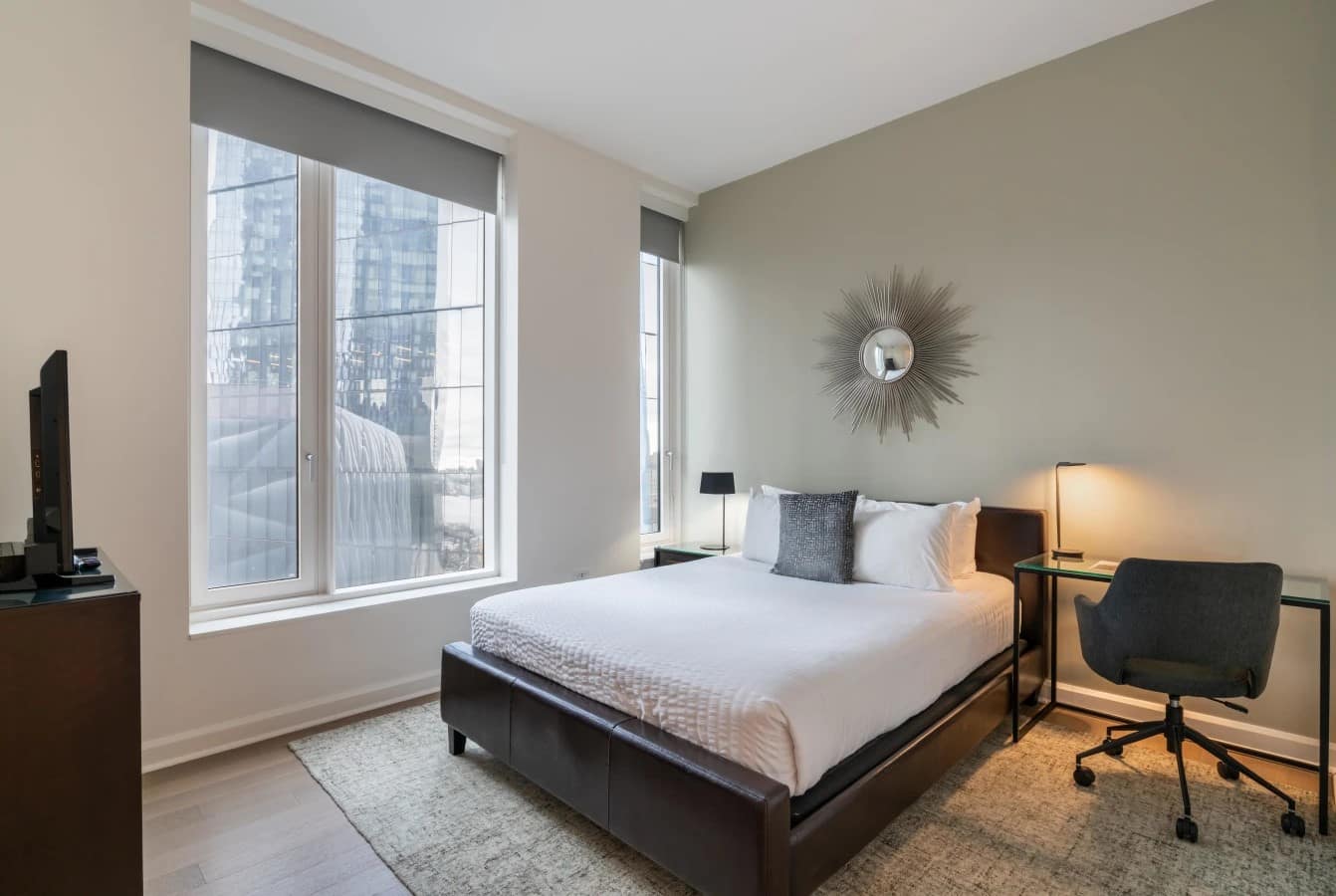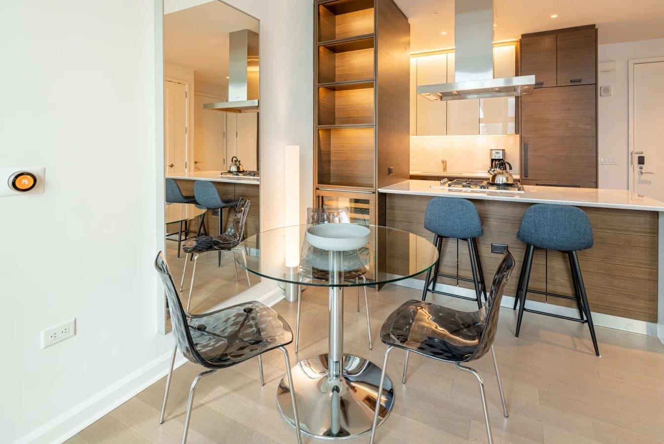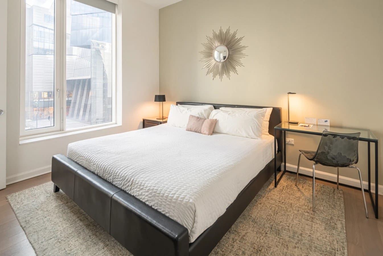 Chelsea Galleries Apartments offers an exceptional residential experience in the heart of Manhattan’s Chelsea neighborhood, directly adjacent to the iconic High Line. This well-appointed one-bedroom, one-bath apartment showcases a modern, open-concept layout designed for both comfort and style. Featuring 9-foot ceilings, floor-to-ceiling windows, and engineered wood flooring, the apartment is flooded with natural light and offers scenic views of the Empire State Building, the New York Times Building, and the Hudson River. The kitchen is fully equipped with stainless steel appliances, quartz countertops, and sleek cabinetry, while the in-unit washer/dryer and individually controlled air conditioning add convenience. The queen-size bed is dressed in plush linens, providing a restful retreat in the heart of the city.
