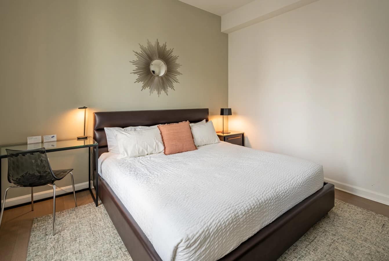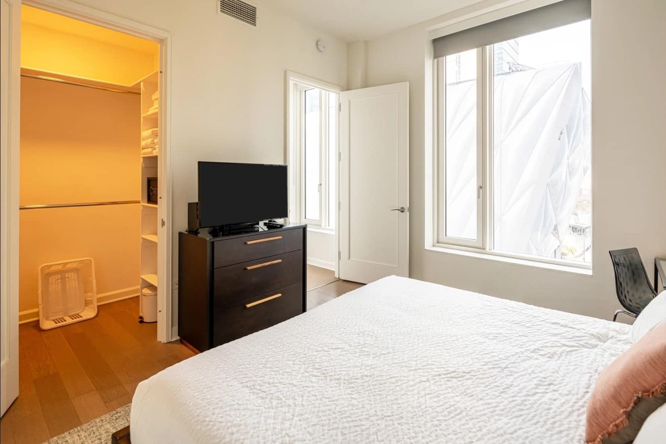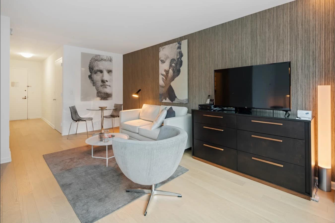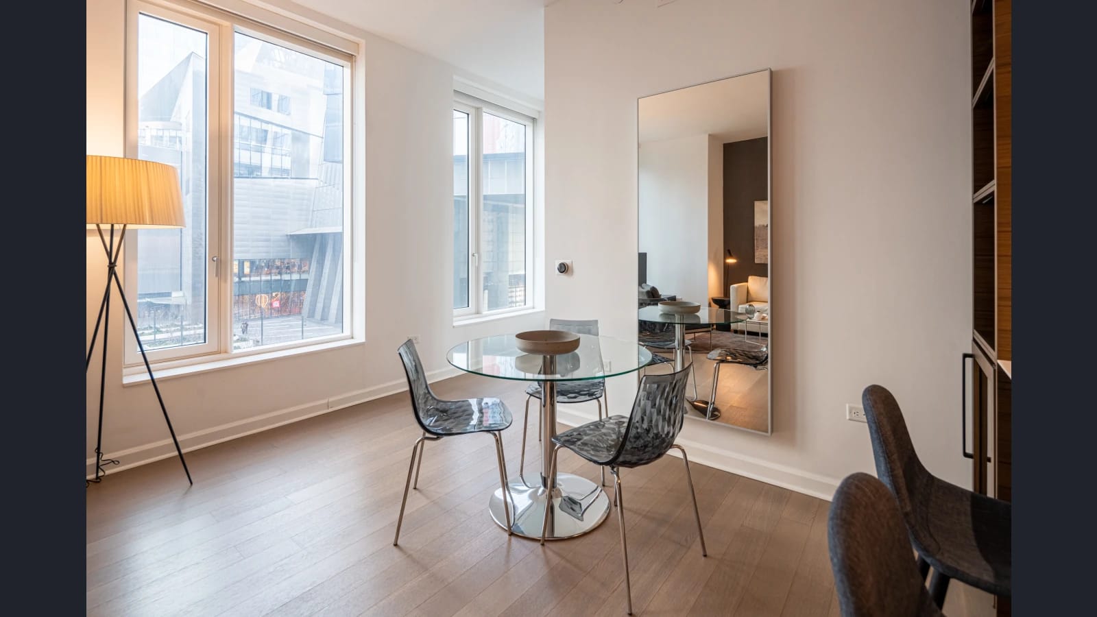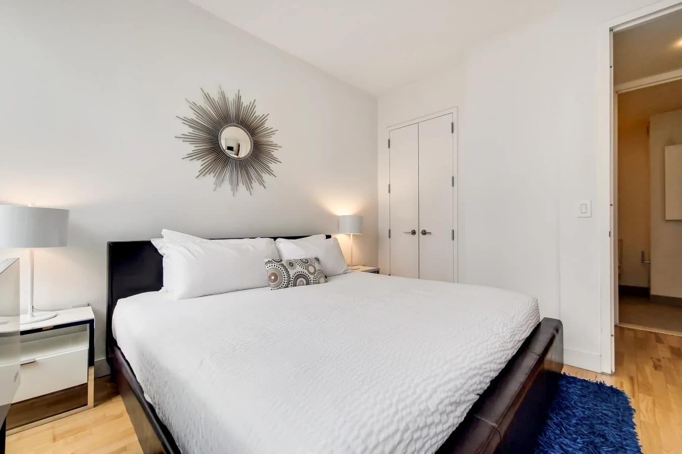 Chelsea Galleries Apartments offers an exceptional residential experience in the heart of Manhattan’s Chelsea neighborhood, directly adjacent to the iconic High Line. This well-appointed one-bedroom, one-bath apartment showcases a modern, open-concept layout designed for both comfort and style. Featuring 9-foot ceilings, floor-to-ceiling windows, and engineered wood flooring, the apartment is flooded with natural light and offers scenic views of the Empire State Building, the New York Times Building, and the Hudson River. The kitchen is fully equipped with stainless steel appliances, quartz countertops, and sleek cabinetry, while the in-unit washer/dryer and individually controlled air conditioning add convenience. The queen-size bed is dressed in plush linens, providing a restful retreat in the heart of the city.