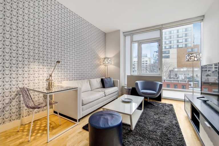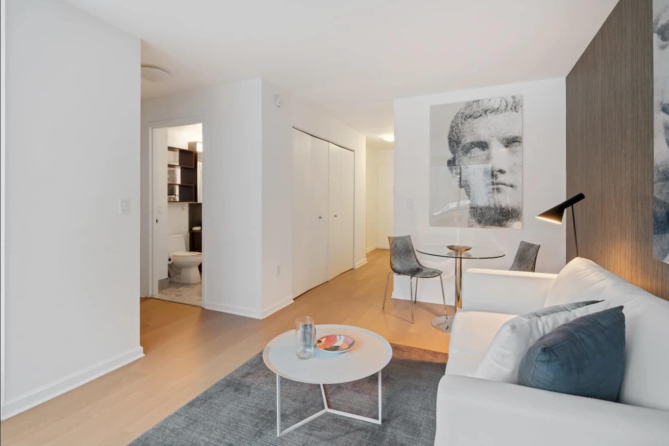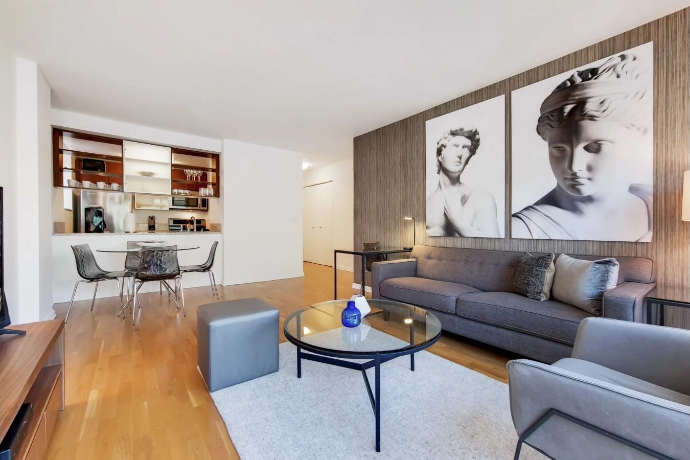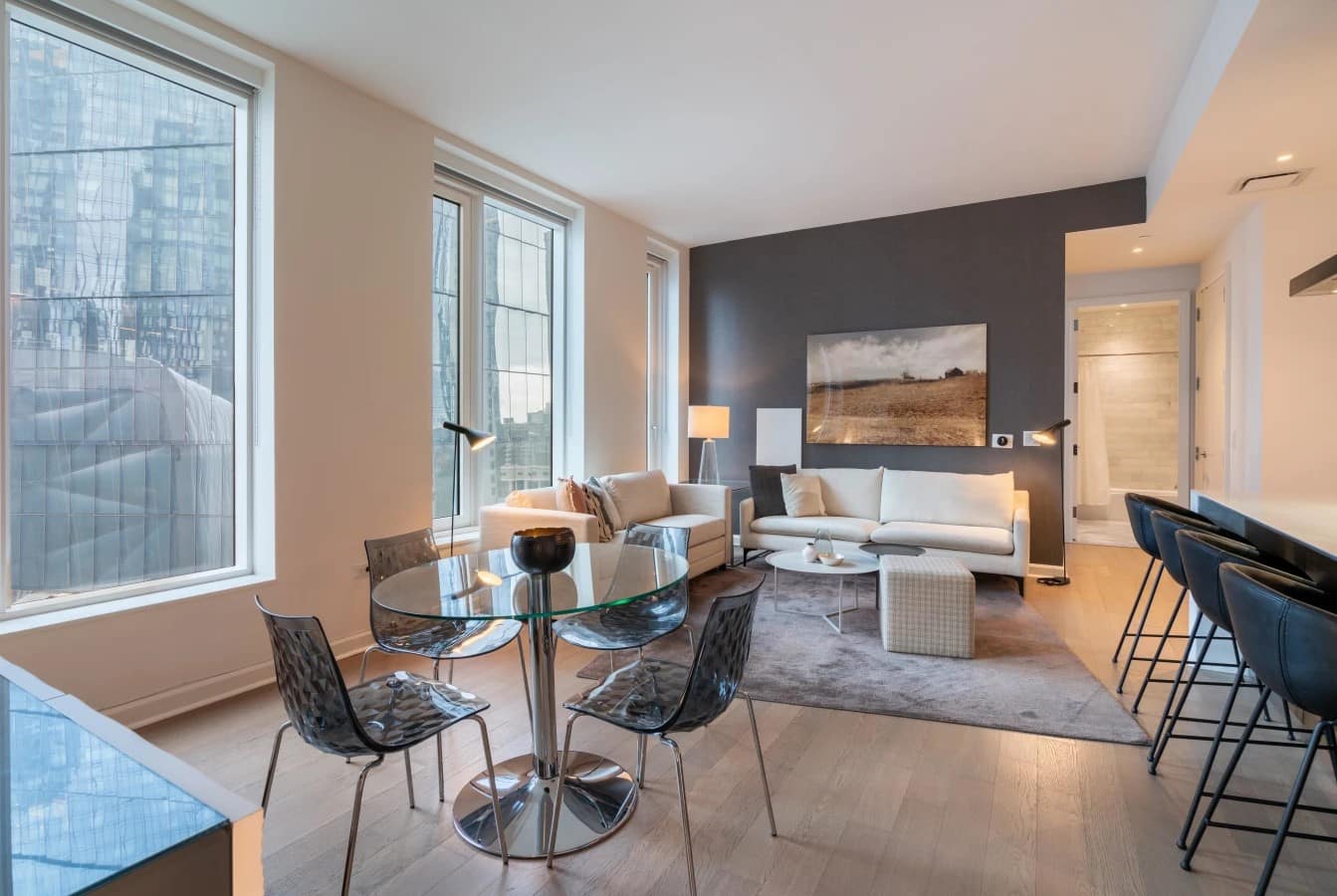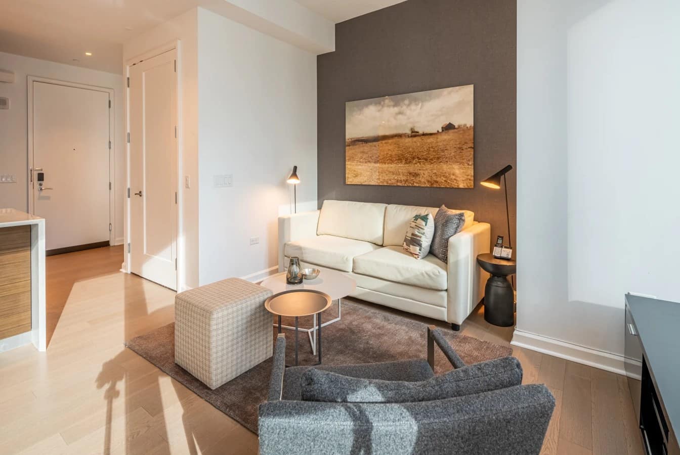 Chelsea Galleries Apartments offers an exceptional residential experience in the heart of Manhattan’s Chelsea neighborhood, directly adjacent to the iconic High Line. This well-appointed one-bedroom, one-bath apartment showcases a modern, open-concept layout designed for both comfort and style. Featuring 9-foot ceilings, floor-to-ceiling windows, and engineered wood flooring, the apartment is flooded with natural light and offers scenic views of the Empire State Building, the New York Times Building, and the Hudson River. The kitchen is fully equipped with stainless steel appliances, quartz countertops, and sleek cabinetry, while the in-unit washer/dryer and individually controlled air conditioning add convenience. The queen-size bed is dressed in plush linens, providing a restful retreat in the heart of the city.