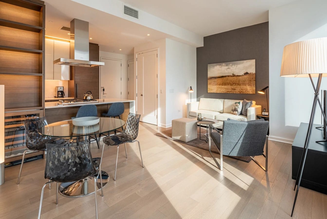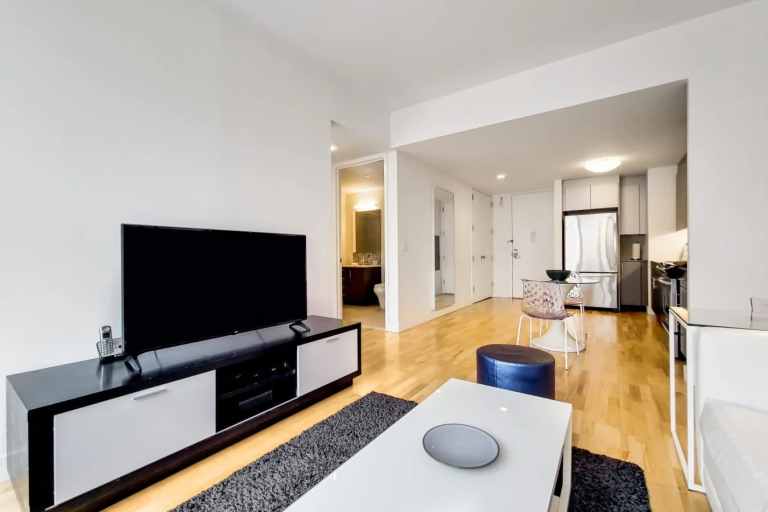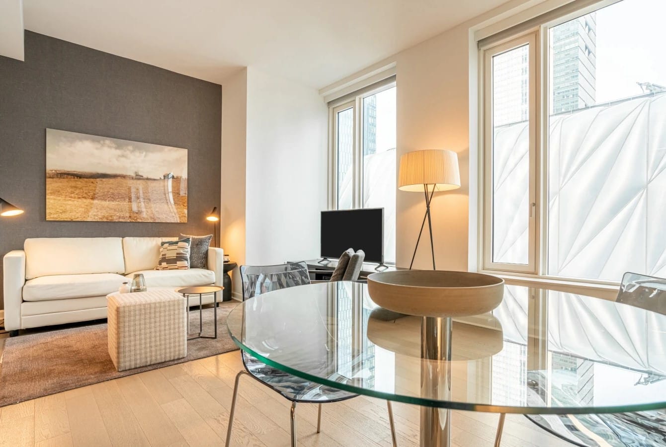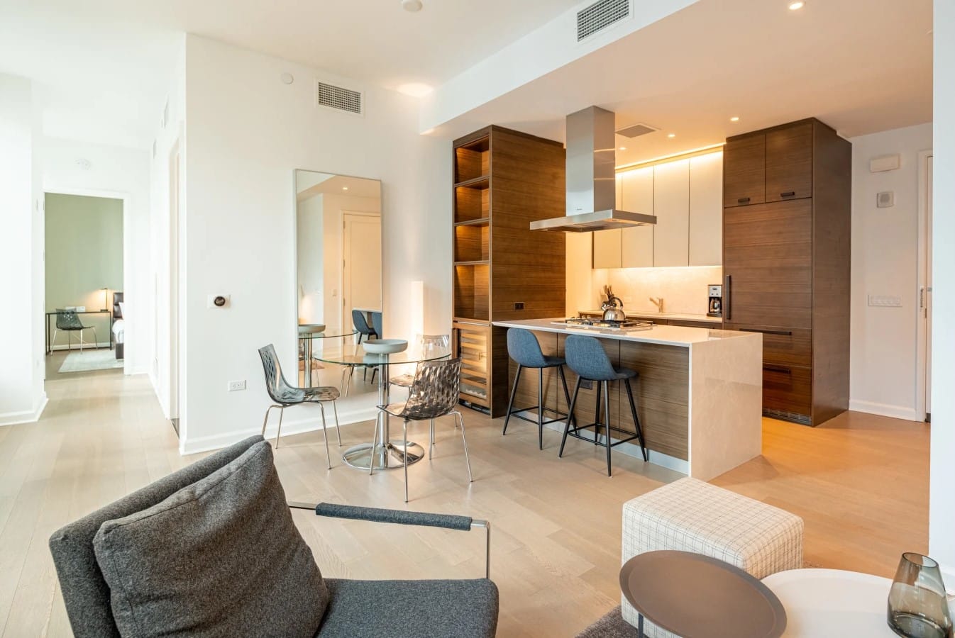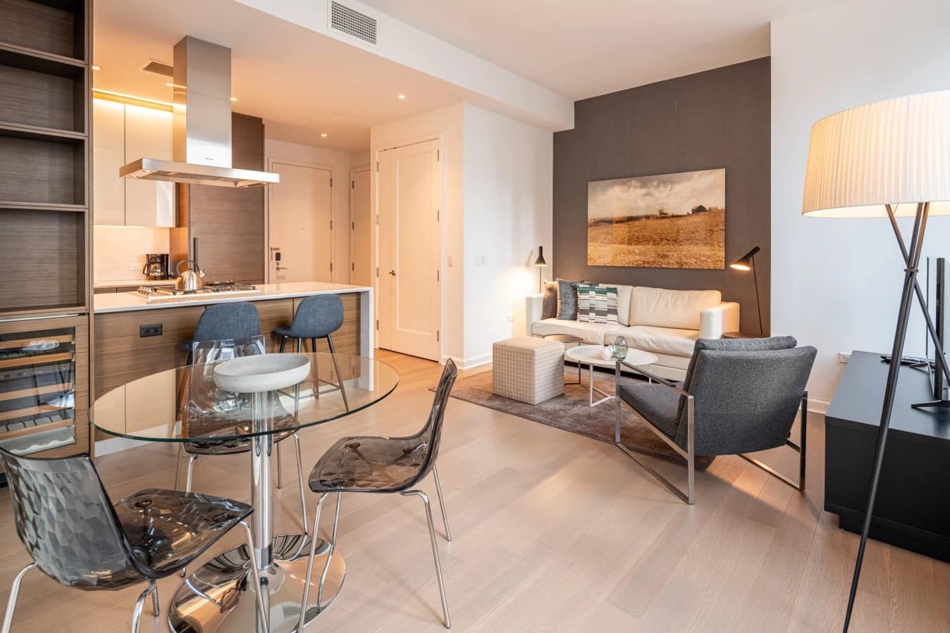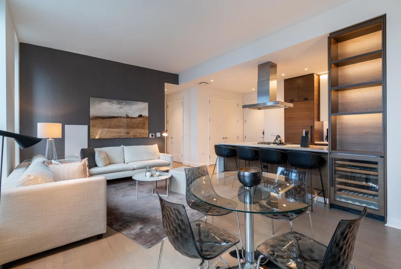 Chelsea Galleries Apartments offers an exceptional residential experience in the heart of Manhattan’s Chelsea neighborhood, directly adjacent to the iconic High Line. This well-appointed one-bedroom, one-bath apartment showcases a modern, open-concept layout designed for both comfort and style. Featuring 9-foot ceilings, floor-to-ceiling windows, and engineered wood flooring, the apartment is flooded with natural light and offers scenic views of the Empire State Building, the New York Times Building, and the Hudson River. The kitchen is fully equipped with stainless steel appliances, quartz countertops, and sleek cabinetry, while the in-unit washer/dryer and individually controlled air conditioning add convenience. The queen-size bed is dressed in plush linens, providing a restful retreat in the heart of the city.