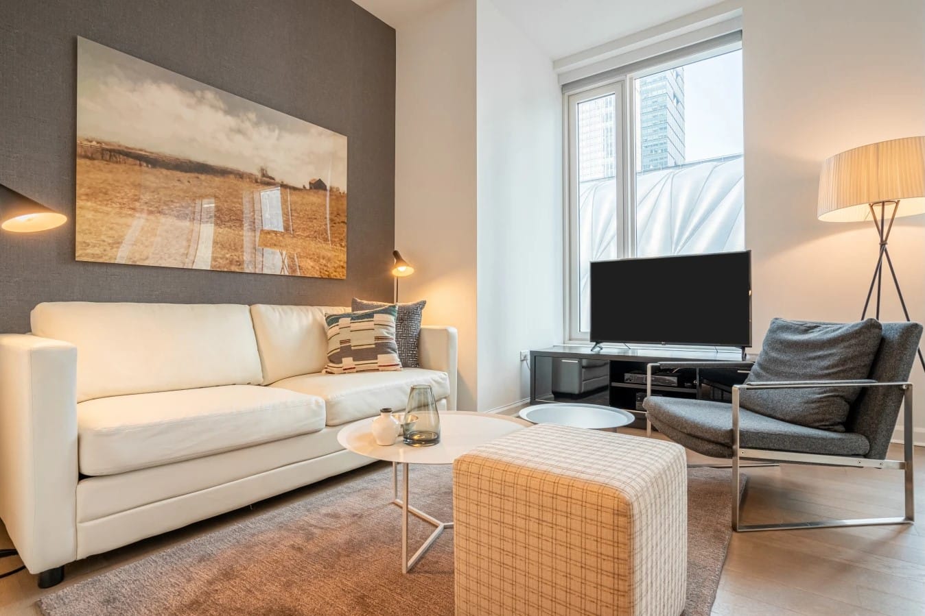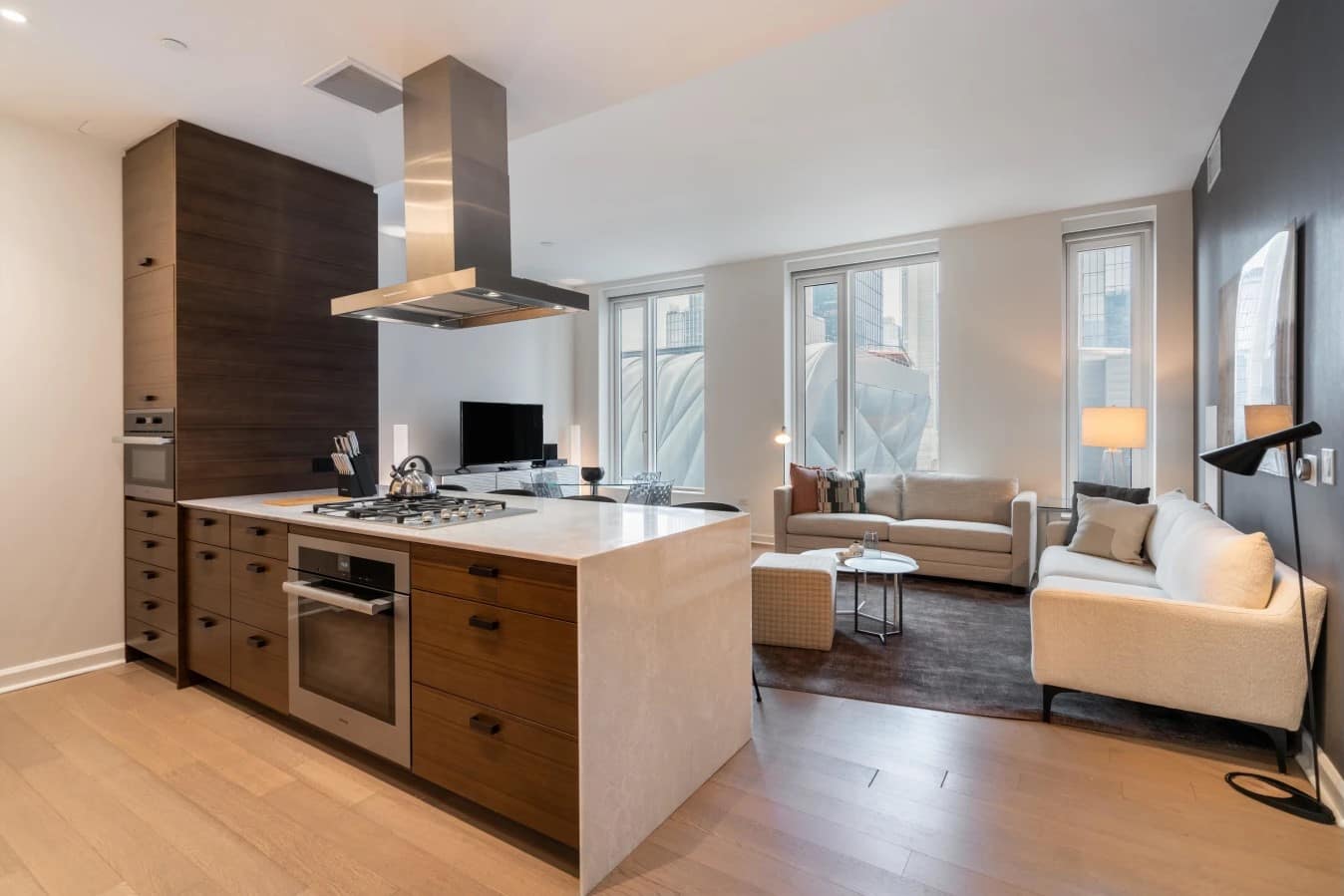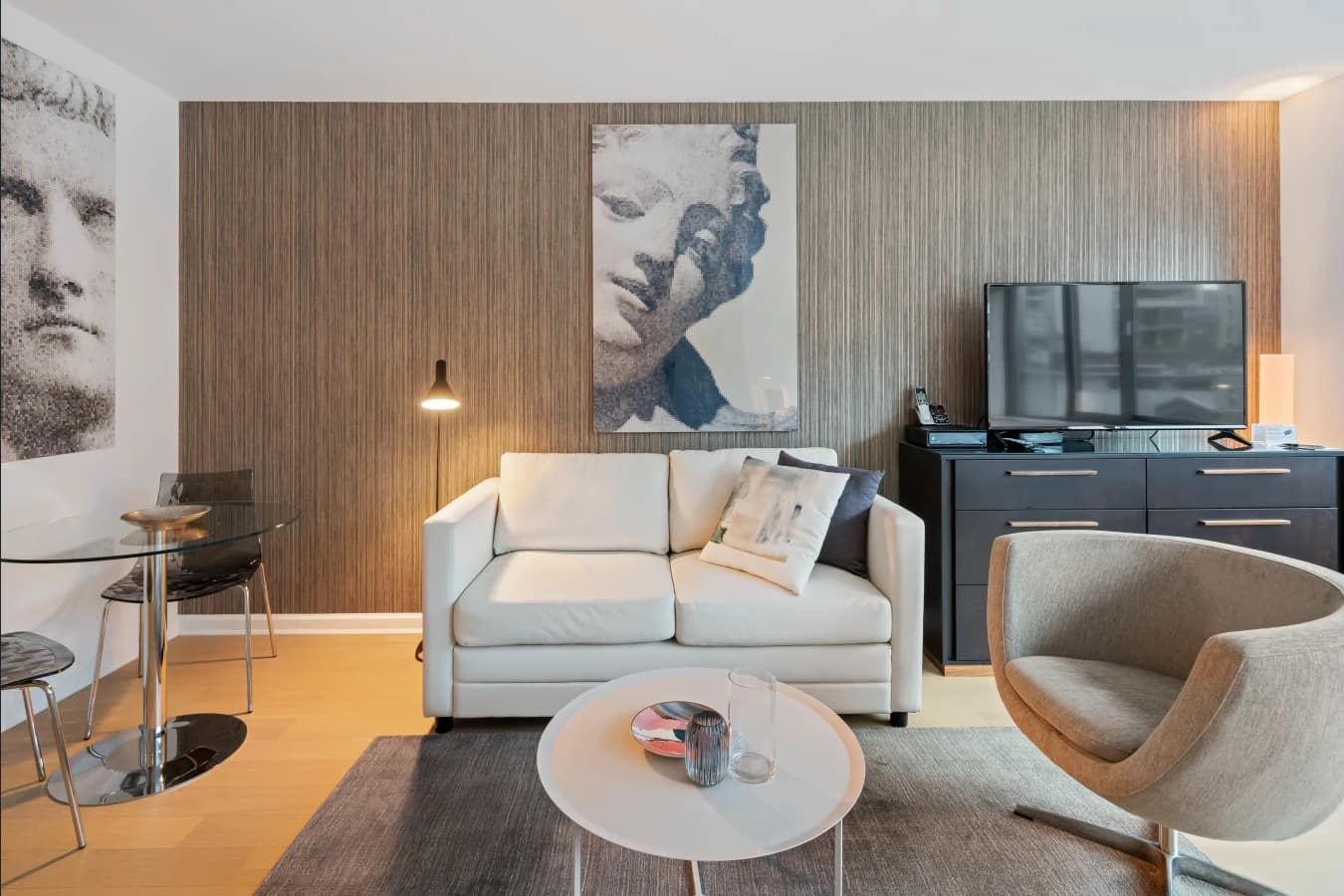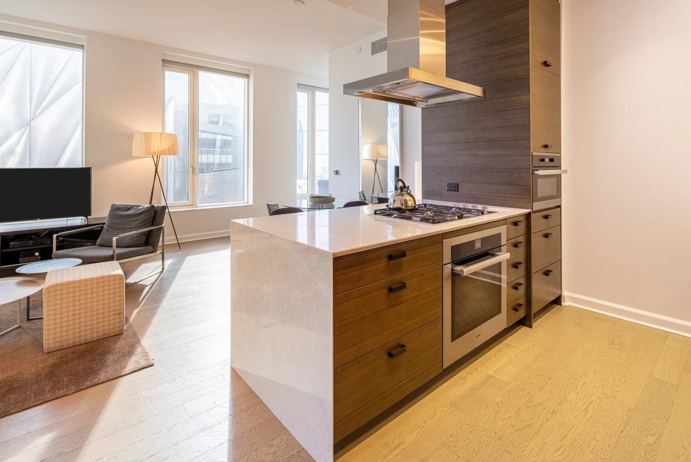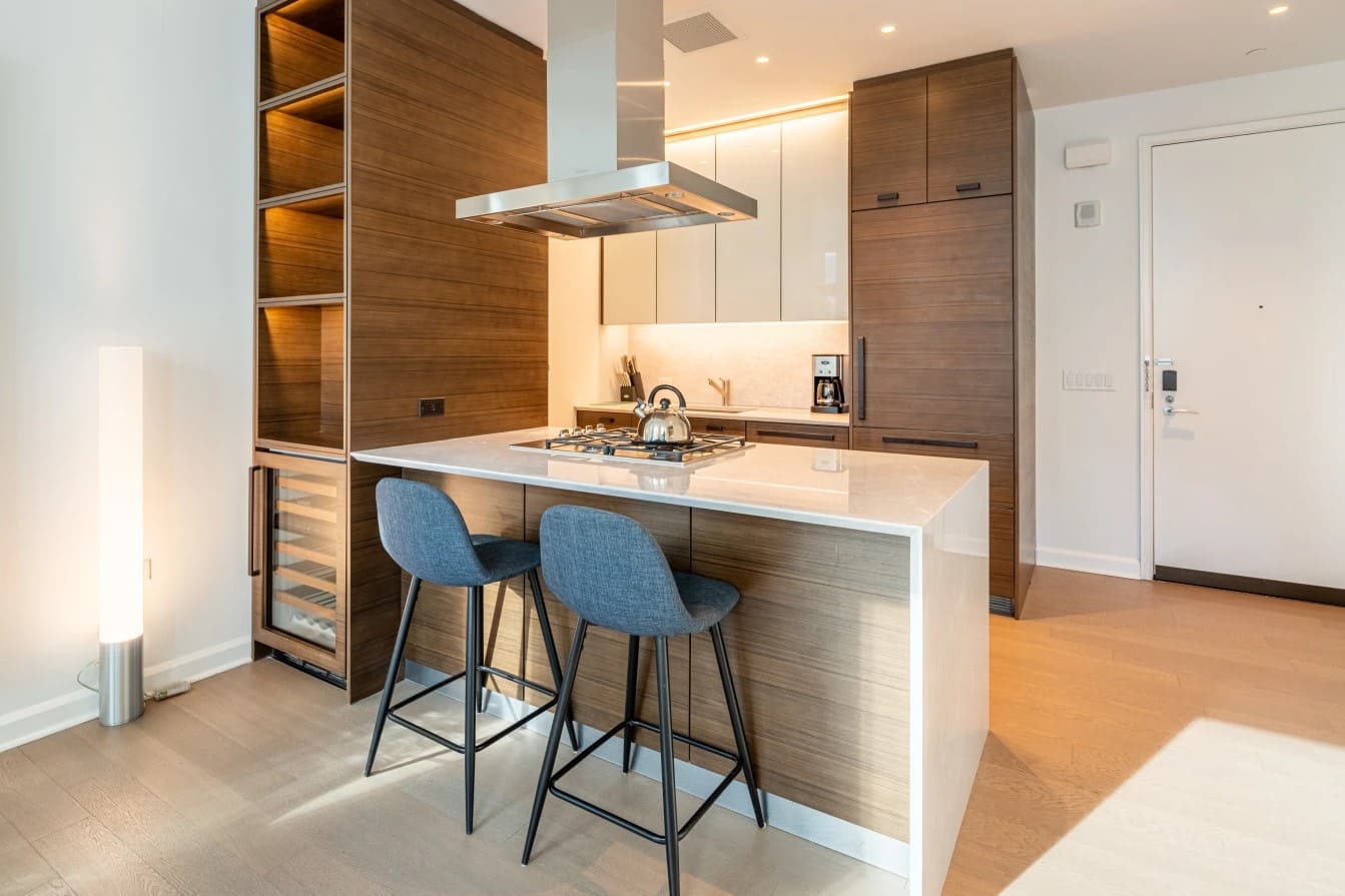 Chelsea Galleries Apartments offers an exceptional residential experience in the heart of Manhattan’s Chelsea neighborhood, directly adjacent to the iconic High Line. This well-appointed one-bedroom, one-bath apartment showcases a modern, open-concept layout designed for both comfort and style. Featuring 9-foot ceilings, floor-to-ceiling windows, and engineered wood flooring, the apartment is flooded with natural light and offers scenic views of the Empire State Building, the New York Times Building, and the Hudson River. The kitchen is fully equipped with stainless steel appliances, quartz countertops, and sleek cabinetry, while the in-unit washer/dryer and individually controlled air conditioning add convenience. The queen-size bed is dressed in plush linens, providing a restful retreat in the heart of the city.
