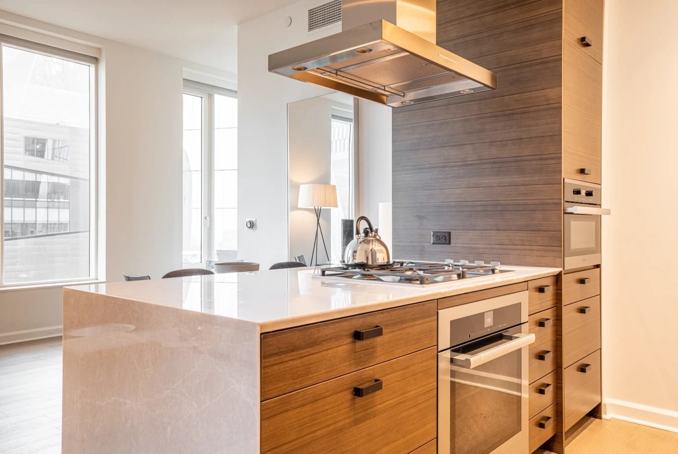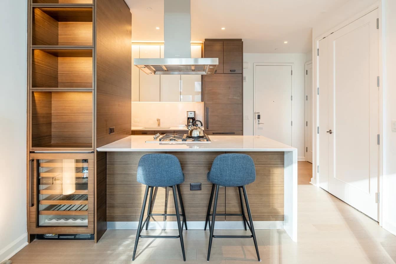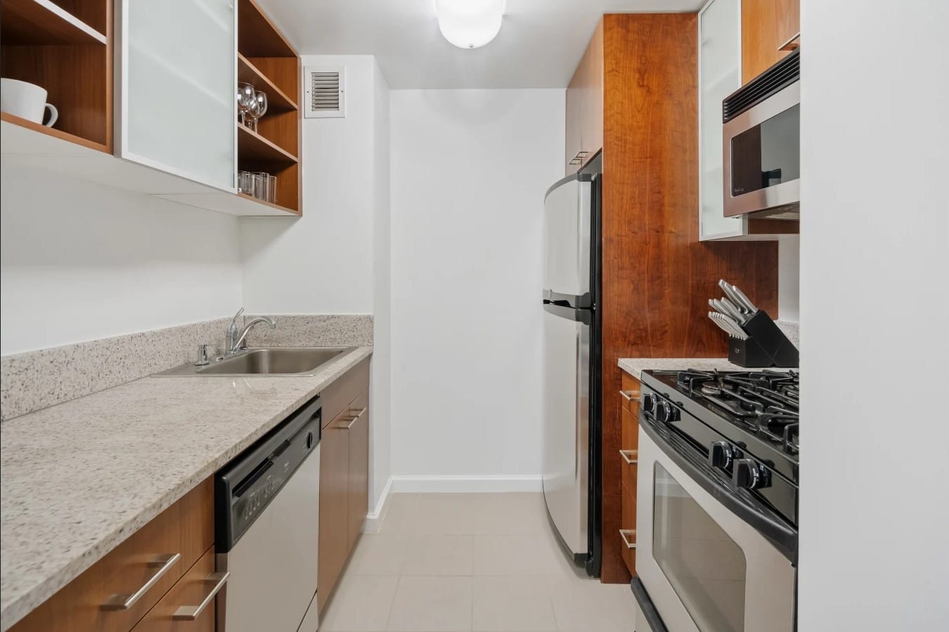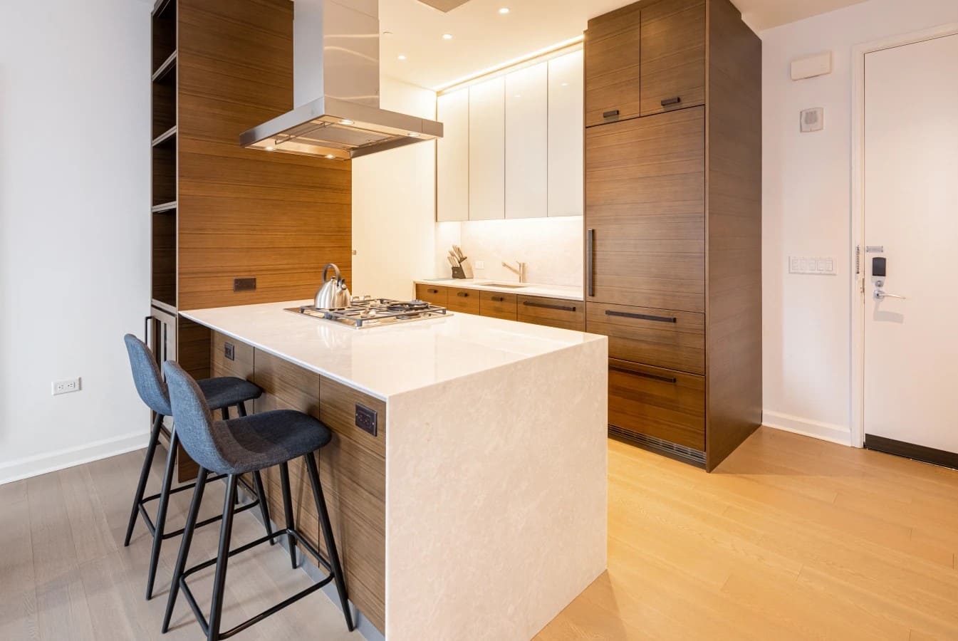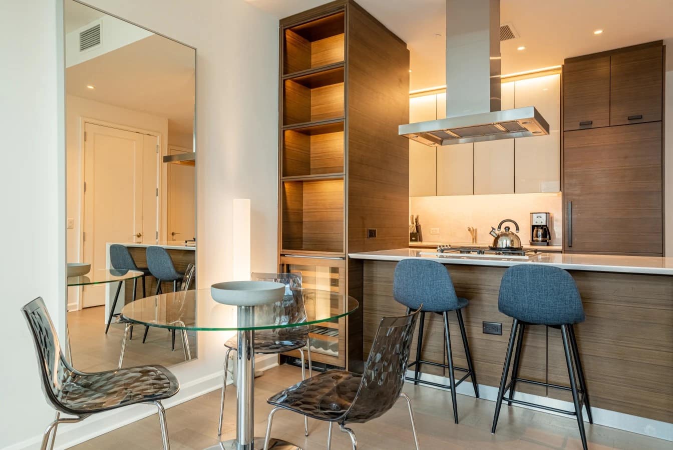 Chelsea Galleries Apartments offers an exceptional residential experience in the heart of Manhattan’s Chelsea neighborhood, directly adjacent to the iconic High Line. This well-appointed one-bedroom, one-bath apartment showcases a modern, open-concept layout designed for both comfort and style. Featuring 9-foot ceilings, floor-to-ceiling windows, and engineered wood flooring, the apartment is flooded with natural light and offers scenic views of the Empire State Building, the New York Times Building, and the Hudson River. The kitchen is fully equipped with stainless steel appliances, quartz countertops, and sleek cabinetry, while the in-unit washer/dryer and individually controlled air conditioning add convenience. The queen-size bed is dressed in plush linens, providing a restful retreat in the heart of the city.