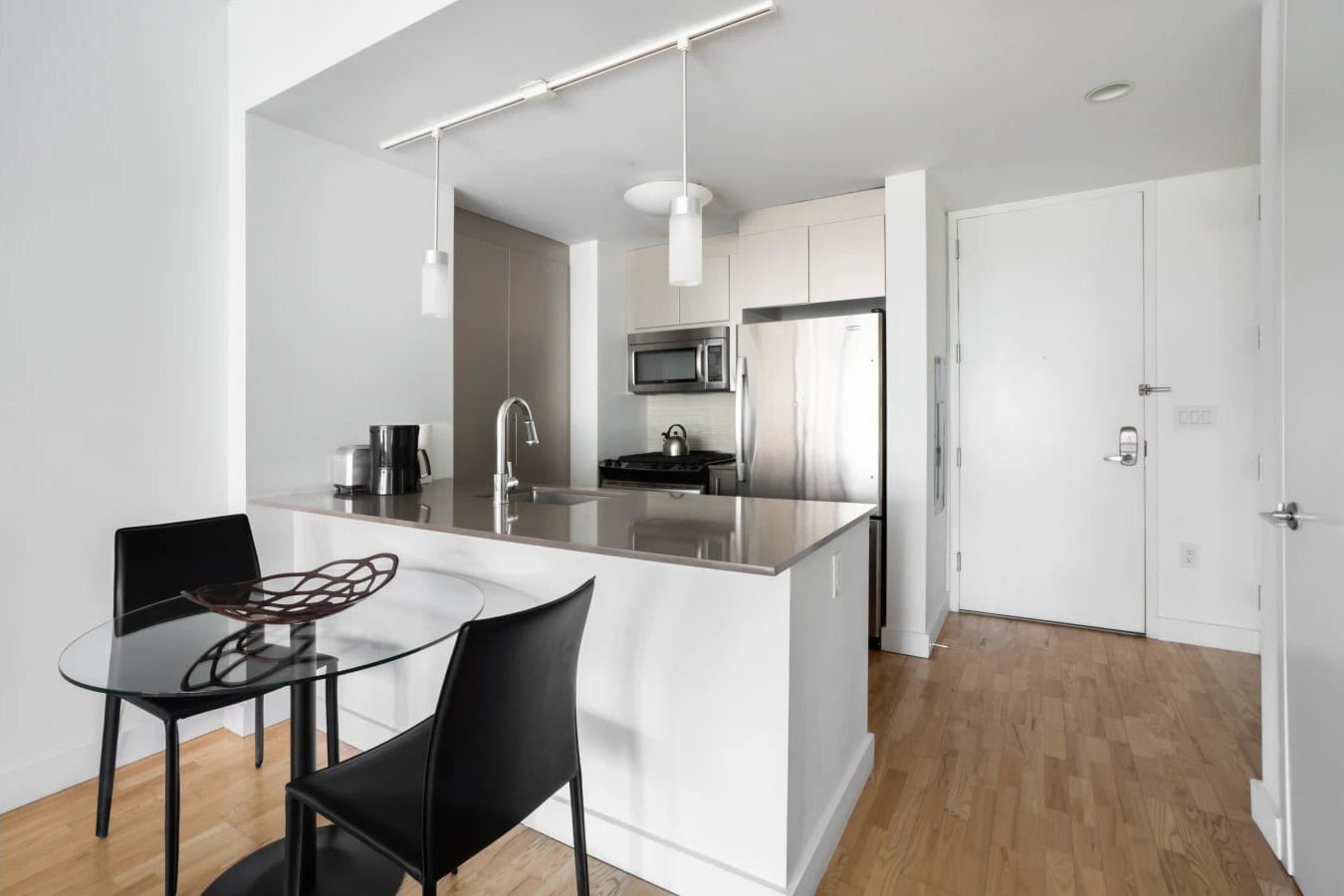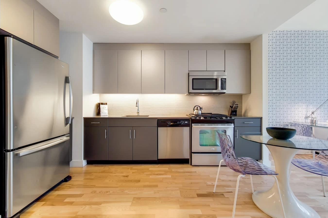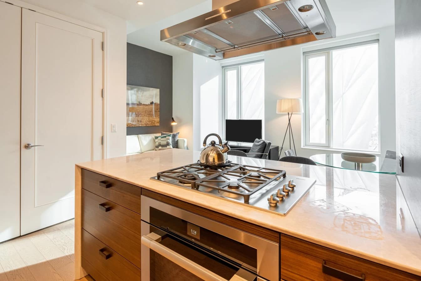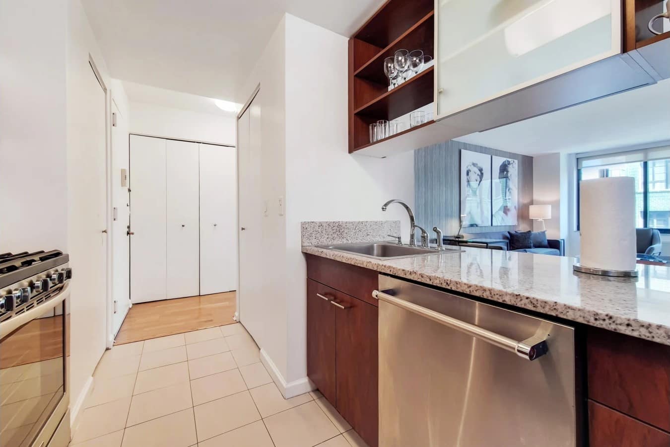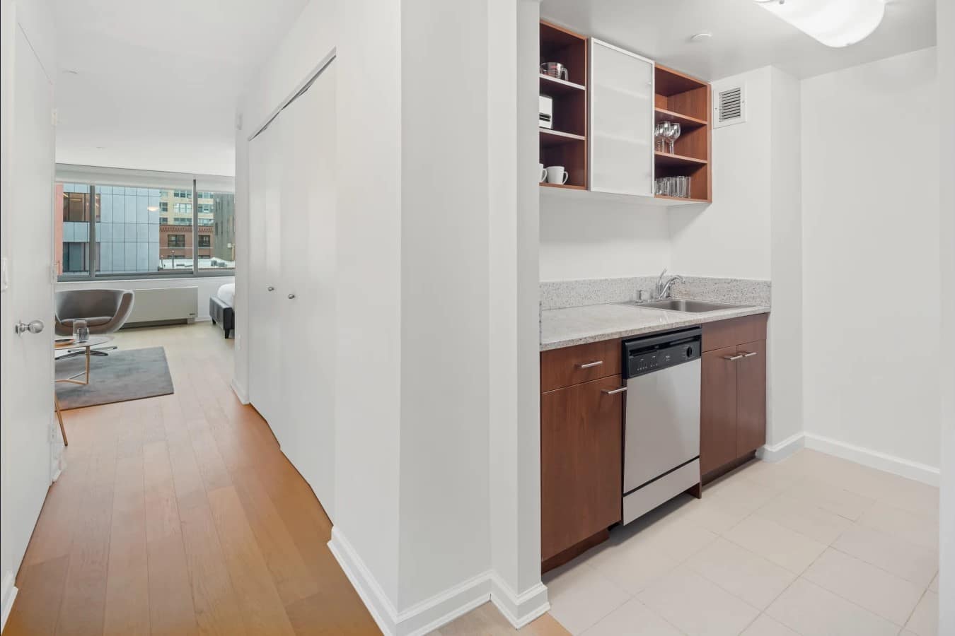 Chelsea Galleries Apartments offers an exceptional residential experience in the heart of Manhattan’s Chelsea neighborhood, directly adjacent to the iconic High Line. This well-appointed one-bedroom, one-bath apartment showcases a modern, open-concept layout designed for both comfort and style. Featuring 9-foot ceilings, floor-to-ceiling windows, and engineered wood flooring, the apartment is flooded with natural light and offers scenic views of the Empire State Building, the New York Times Building, and the Hudson River. The kitchen is fully equipped with stainless steel appliances, quartz countertops, and sleek cabinetry, while the in-unit washer/dryer and individually controlled air conditioning add convenience. The queen-size bed is dressed in plush linens, providing a restful retreat in the heart of the city.