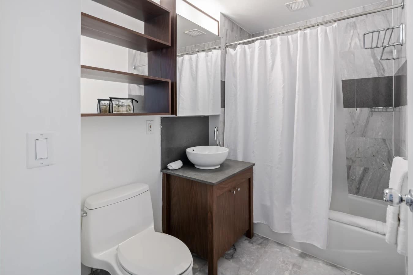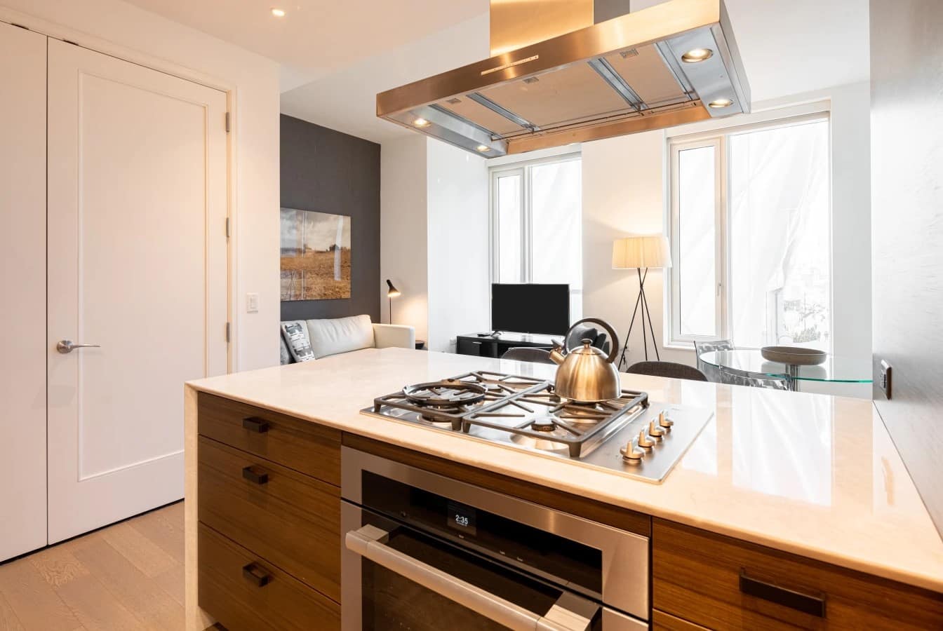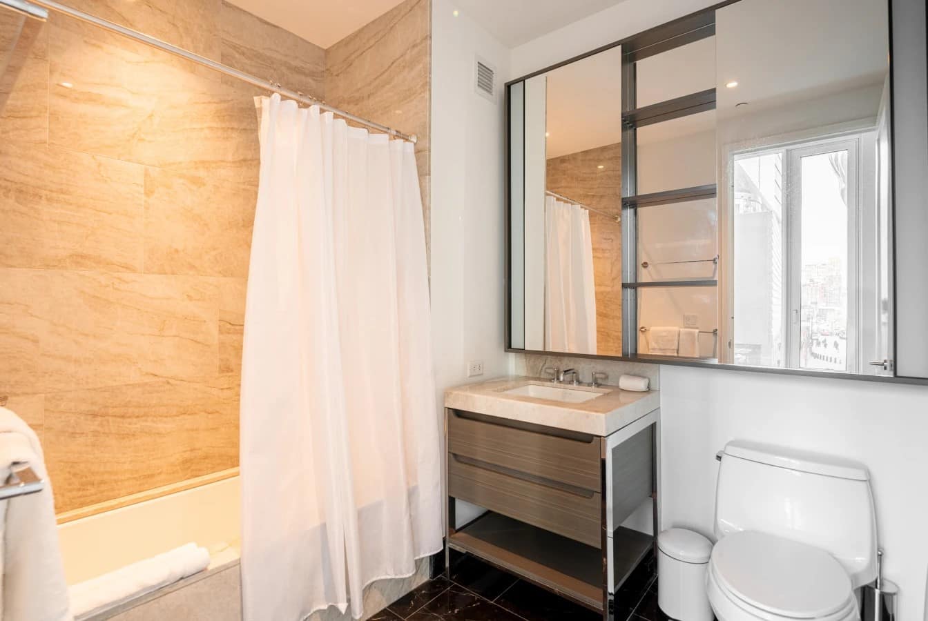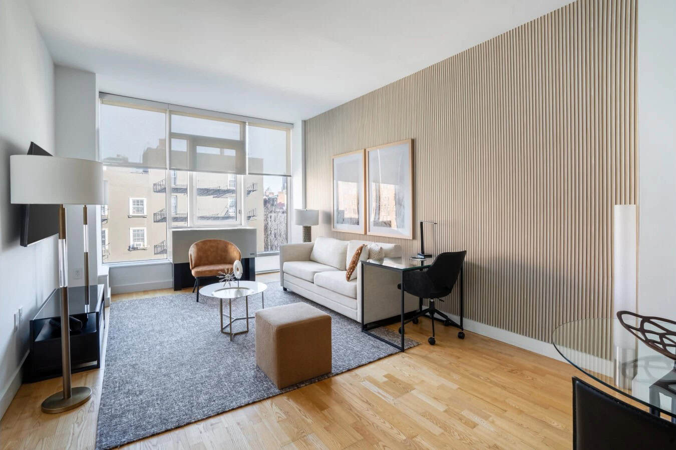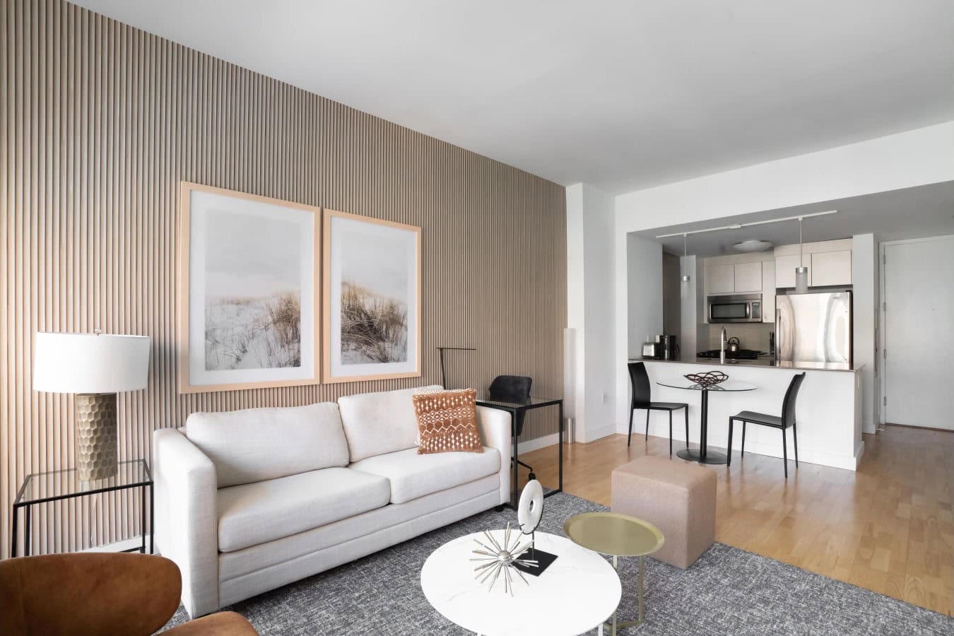 Chelsea Galleries Apartments offers an exceptional residential experience in the heart of Manhattan’s Chelsea neighborhood, directly adjacent to the iconic High Line. This well-appointed one-bedroom, one-bath apartment showcases a modern, open-concept layout designed for both comfort and style. Featuring 9-foot ceilings, floor-to-ceiling windows, and engineered wood flooring, the apartment is flooded with natural light and offers scenic views of the Empire State Building, the New York Times Building, and the Hudson River. The kitchen is fully equipped with stainless steel appliances, quartz countertops, and sleek cabinetry, while the in-unit washer/dryer and individually controlled air conditioning add convenience. The queen-size bed is dressed in plush linens, providing a restful retreat in the heart of the city.