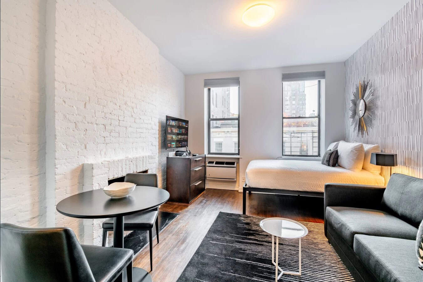 Inside, each apartment features high ceilings, exposed brick accents, hardwood flooring, and tasteful modern furnishings. Kitchens are fully equipped for everyday living, and all units come with a full-size bed, ideal for solo travelers or couples. Select apartments showcase unique pre-war architectural elements that add warmth and personality to the space. While the building does not have an elevator, it does offer on-site laundry facilities, an intercom entry system, and double-locked entry doors for added security. The pet-friendly policy makes it a welcoming home for animal lovers as well.