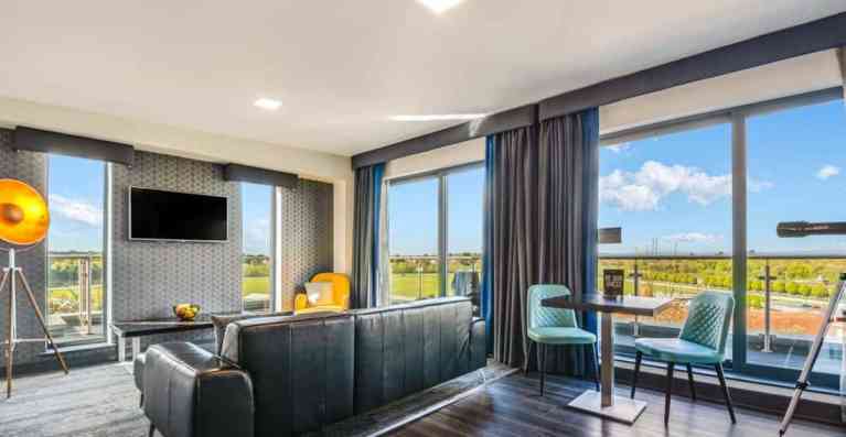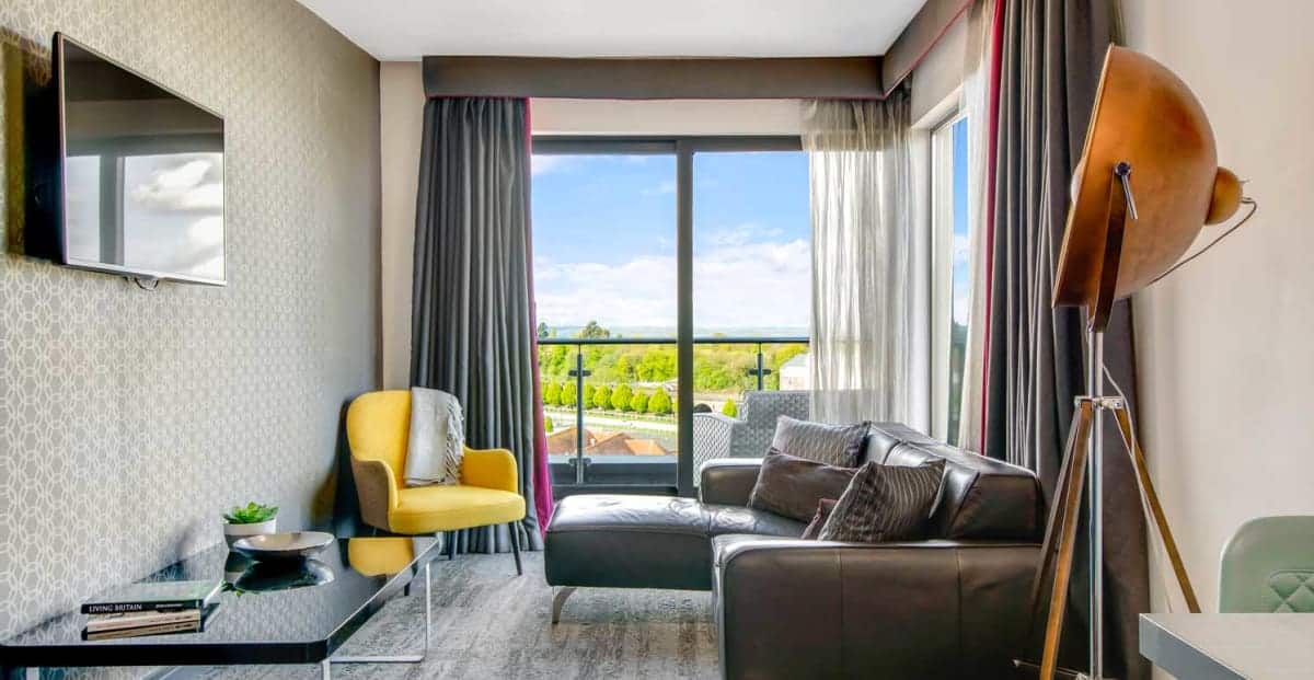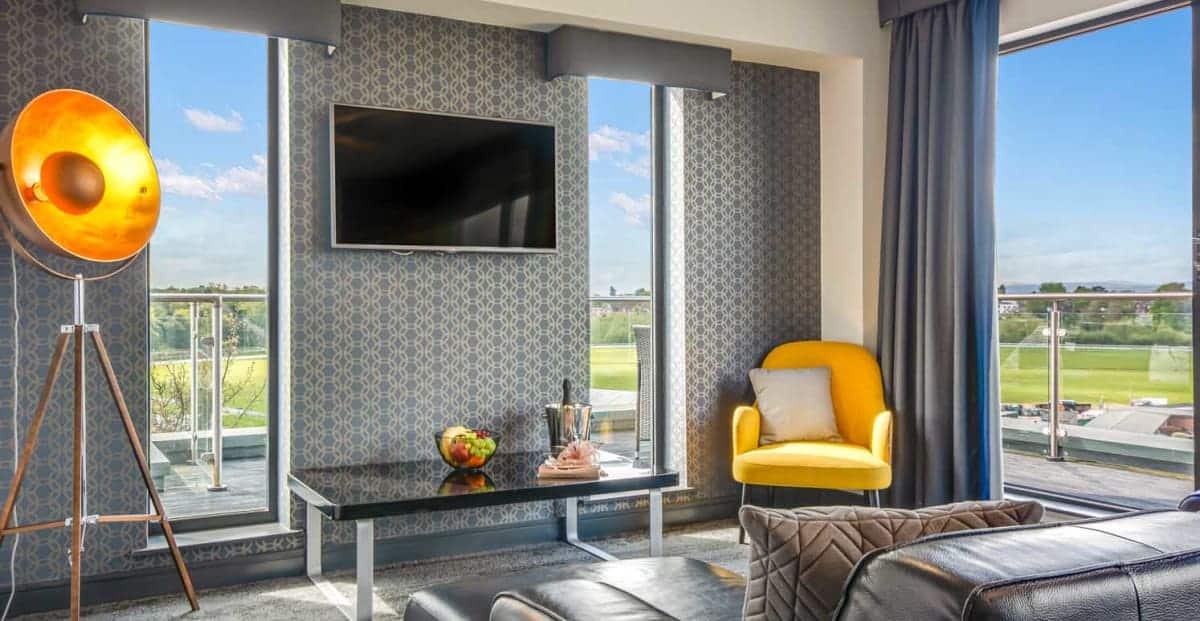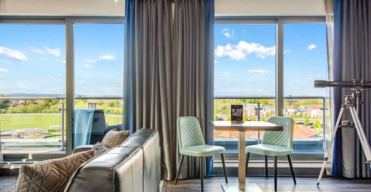 Accommodation at Chester Racecourse Aparthotel covers several types of studio and suite layouts designed to suit a range of needs. Smart Studios provide a budget‑friendly, compact option for two guests, featuring a king‑sized, 2,000‑spring‑coil bed, kitchenette with dishwasher, heated bathroom floors, rain or power shower and free high‑speed WiFi. Grande Studios expand the space a little further with a sofa, dining table and workspace, while Family Grande Studios allow for up to four guests with additional sofa beds. Penthouse and Ascot Suites raise the luxury proposition with separate living and bedroom areas, balconies overlooking the racecourse, and premium extras like telescopes in the Ascot Suite. Across all apartment types you’ll find fully‑fitted kitchenettes, air‑conditioning, smart TVs, and practical touches such as ironing boards, washing machine access, and in‑room safes, making these units suitable for both short breaks and longer stays.