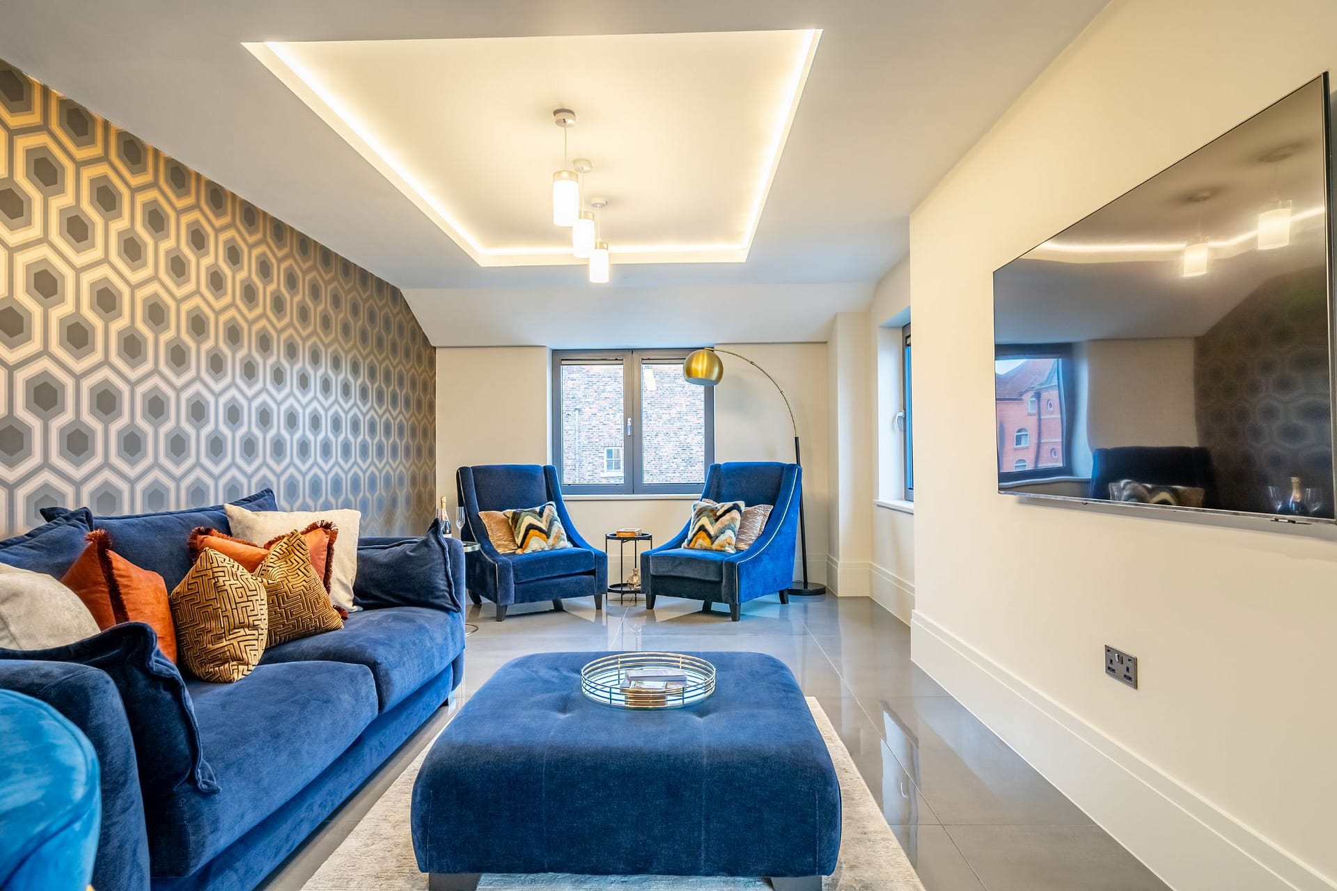 The open-plan living space is both modern and inviting, offering everything you need for a relaxing stay. A Smart TV with Freeview and Netflix provides entertainment for cosy evenings in, while the sleek kitchen is fitted with high-end appliances including a wine fridge, dishwasher, washer/dryer, and coffee machine. Whether you’re preparing a leisurely breakfast, enjoying a takeaway from York’s many restaurants, or settling in for an evening glass of wine, the apartment is perfectly equipped. The bathrooms reflect the same attention to detail, with contemporary fittings, a separate shower, and additional WC, all finished to an exceptional standard. Weekly cleaning, fresh towels, and linens ensure convenience throughout your stay.