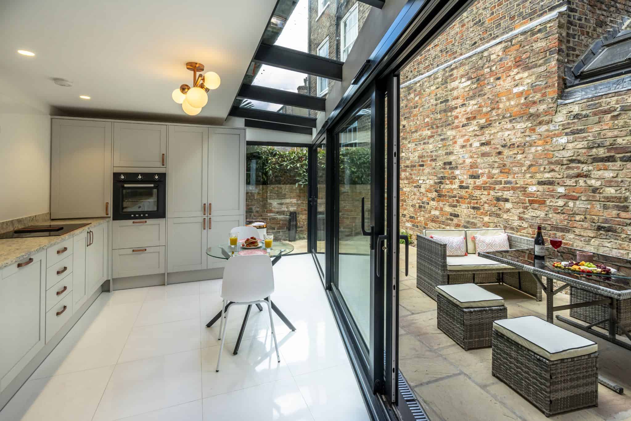 The ground floor is home to a versatile occasional room, ideal for a quiet moment with a book, and a formal dining room with seating for eight that also includes a sofa bed for occasional extra guests. At the rear, the sleek, modern kitchen is fitted to the highest standard, with granite worktops, premium appliances, and a stylish bistro area. Sliding glass doors lead directly onto a private patio, the perfect spot for al fresco dining or evening drinks in warmer months. Upstairs on the first floor, you’ll find the luxurious house bathroom, designed with elegant copper finishes and a spacious wet-room style shower. The main living room is also here, furnished with comfortable seating and a Smart TV. A charming double bedroom is also located on this floor.