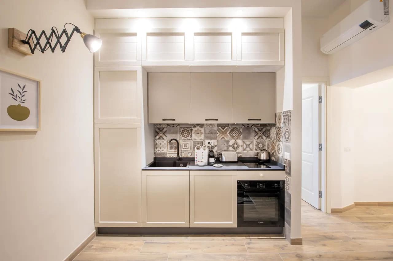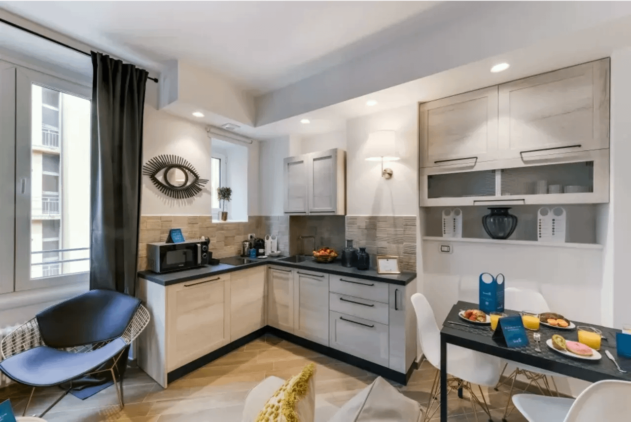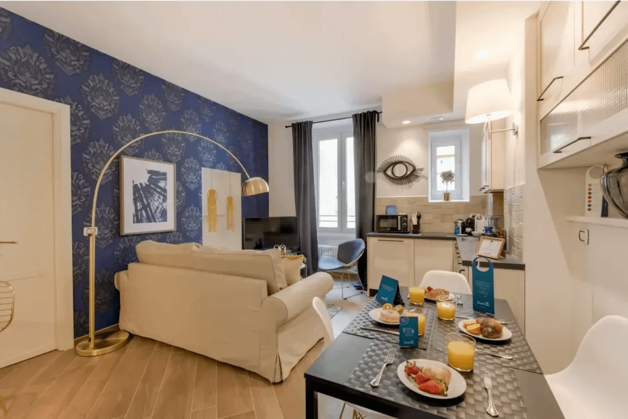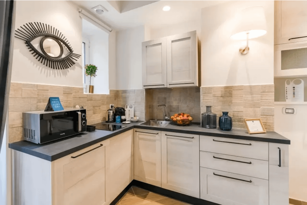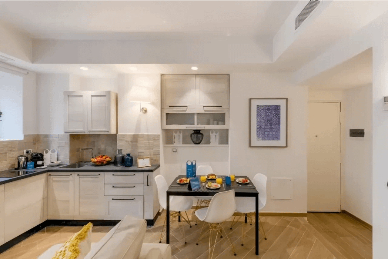 Accommodations at Corso Sempione Apartments are designed for flexibility and comfort, whether you’re visiting solo, with a partner, or in a small group. There are studios with kitchenettes, medium-sized one-bedroom apartments, XL studio options with sofa beds, and even two-bedroom apartments to accommodate larger parties—some with terraces or balconies. Interiors are modern, bright, and well-appointed: free WiFi, air conditioning (seasonal), flat-screen TVs, quality kitchen/kitchenette features, professional weekly cleaning, lift access, and luggage storage are among the amenities. The décor strikes a balance between sleek modern minimalism and warm liveability—thoughtfully designed to feel like home yet clearly polished.