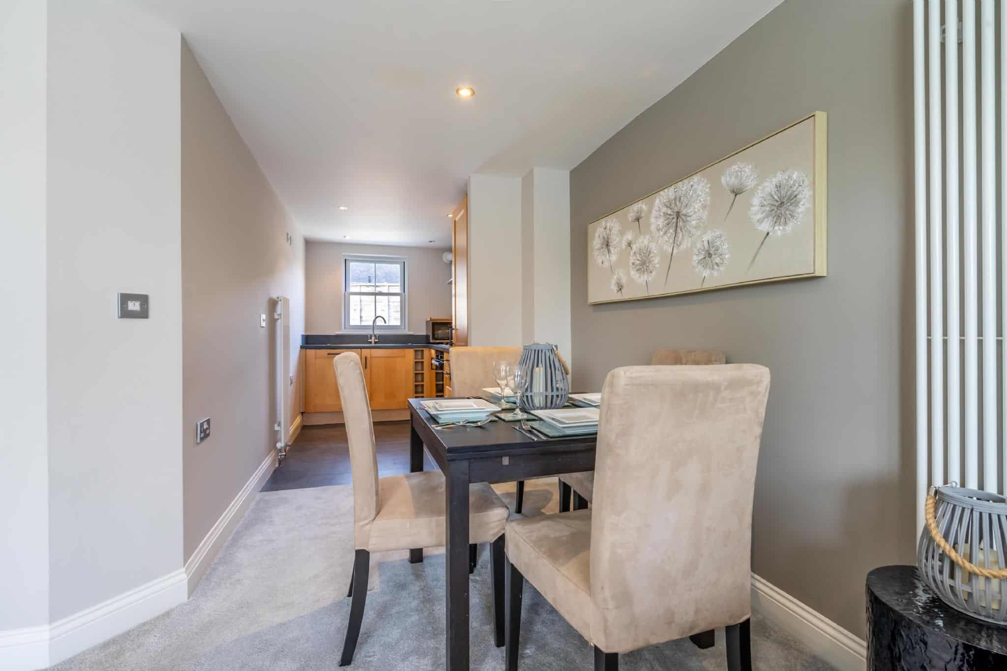 Step inside, and the apartment unfolds across three levels. On the first floor, a bright open-plan lounge and kitchen area awaits, bathed in natural light and boasting mesmerising views of York’s iconic City Walls. The fully equipped kitchen ensures you have everything you need for a stress-free stay, from casual breakfasts to home-cooked dinners. The lounge, with comfortable seating and a Smart TV, provides the perfect spot to relax after a busy day of sightseeing. Whether you’re preparing a meal, enjoying a glass of wine, or simply gazing out at the historic backdrop, this space is as practical as it is stylish.