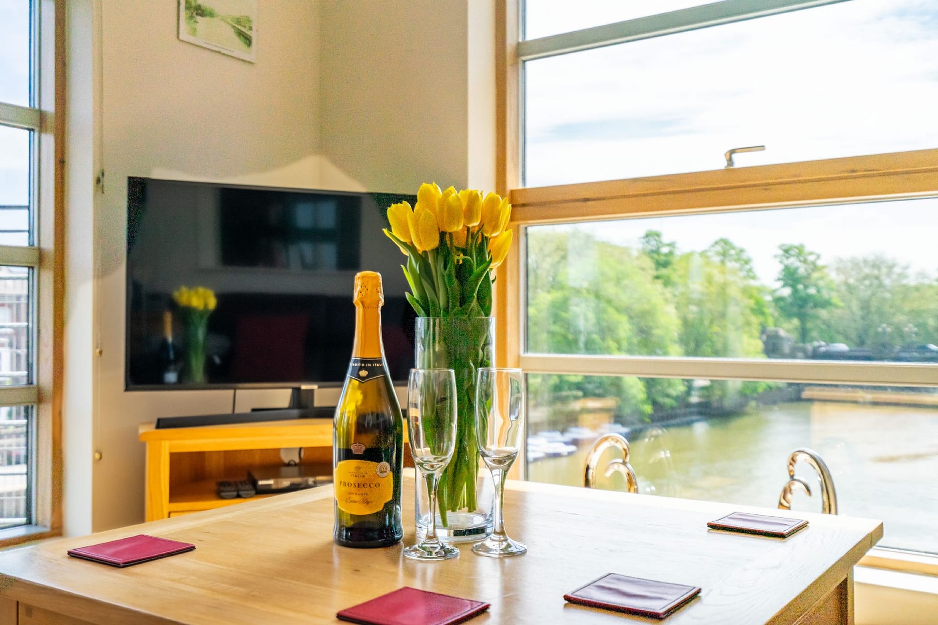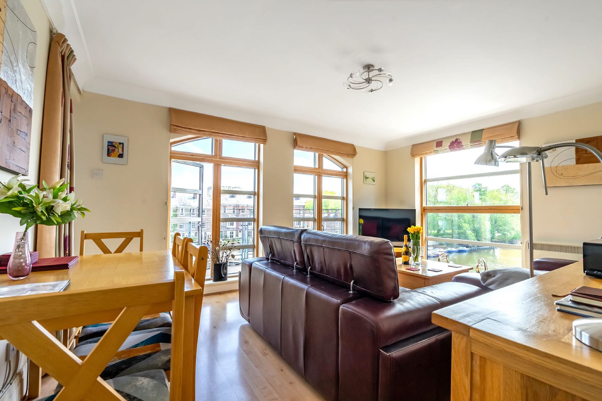 Inside, the apartment is beautifully appointed to make the most of its position. The spacious living area opens onto two private balconies, complete with chairs and a table, where you can sit back and enjoy the river views. A Smart TV with Freeview, Netflix, and DVD player ensures entertainment on cosy evenings in, while a small library of books, games, and DVDs adds thoughtful touches for guests. The modern kitchen comes fully equipped with everything you need, including a dishwasher, washer/dryer, fridge freezer, and cafetiere, while the dining area offers a stylish space for relaxed meals at home.