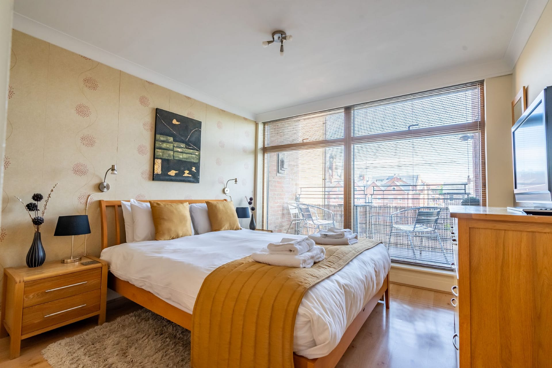 The master bedroom features a comfortable king-size bed, fitted wardrobes, and a wall-mounted TV, along with an ensuite shower room and direct river views. The second bedroom is a cosy single, ideal for a third guest, and is complemented by a house bathroom with a bath and heated towel rail. Fresh towels, linens, and weekly housekeeping are included to ensure a stress-free stay. A rare benefit for central York, the property also provides a free reserved parking space within a secure, gated basement with lift access directly to the apartment. Combining spectacular views, stylish interiors, and unbeatable convenience, Emperors Wharf is a truly unique base for experiencing the very best of York.