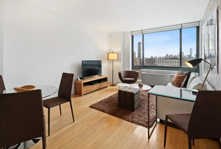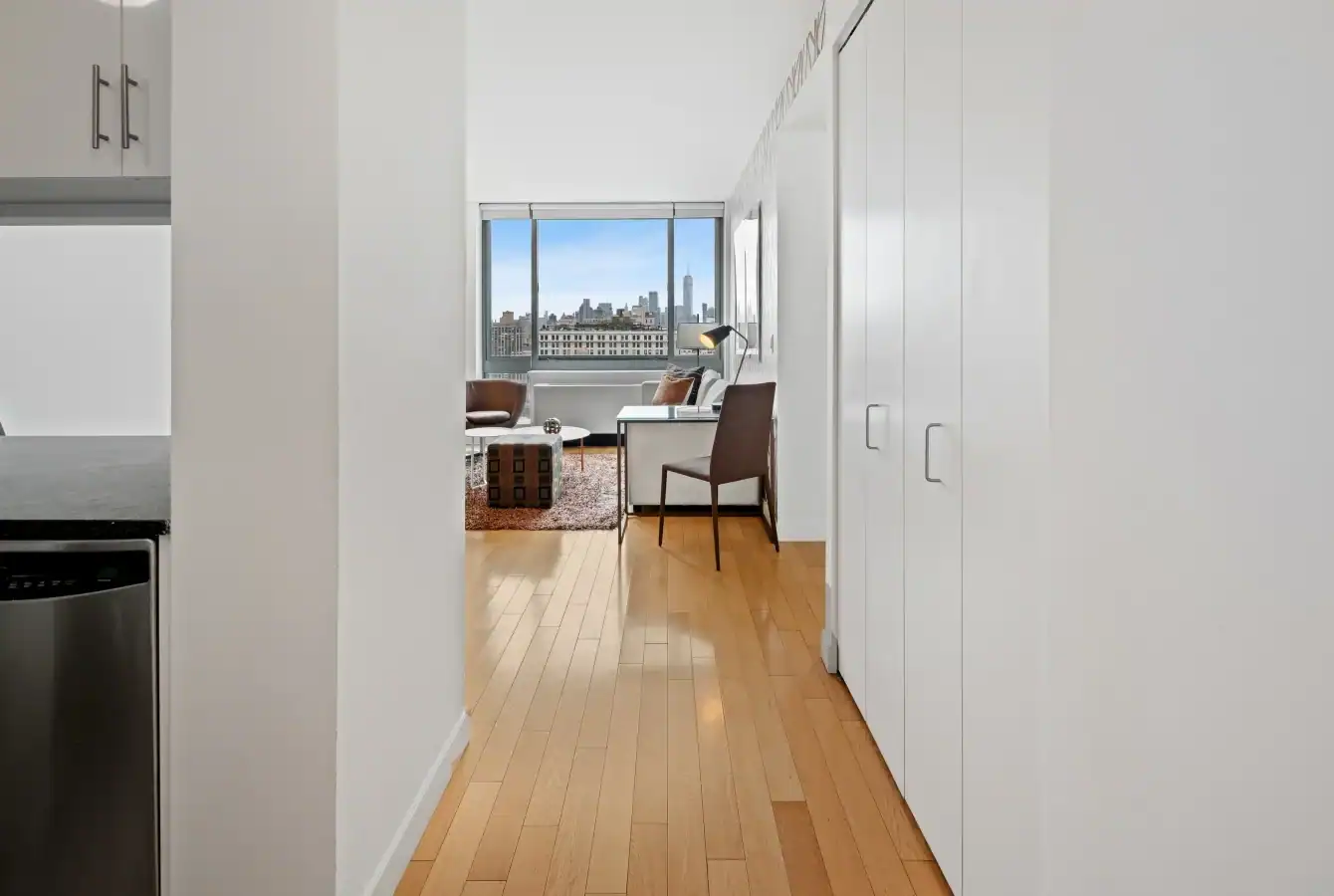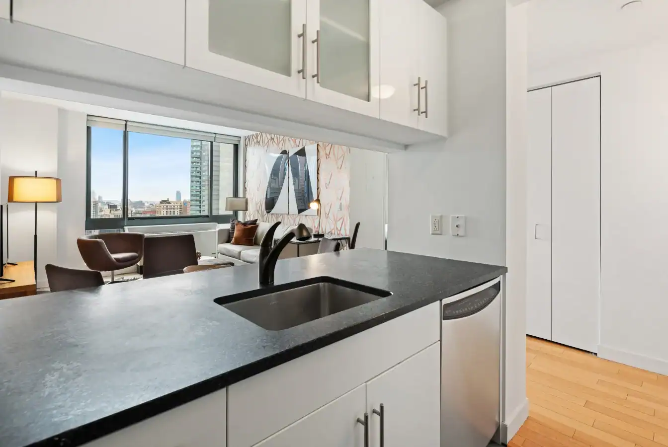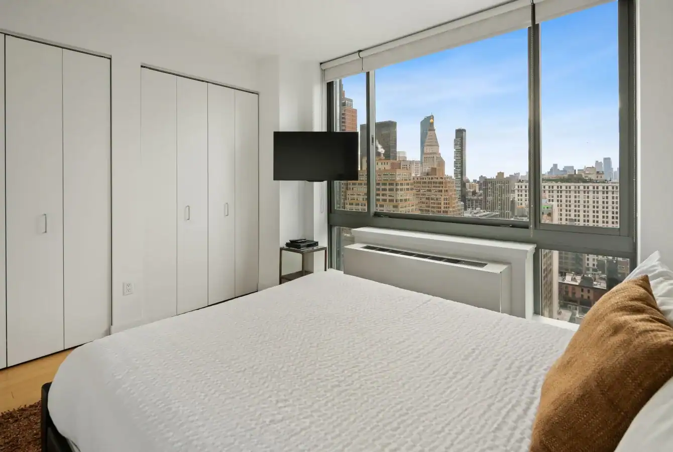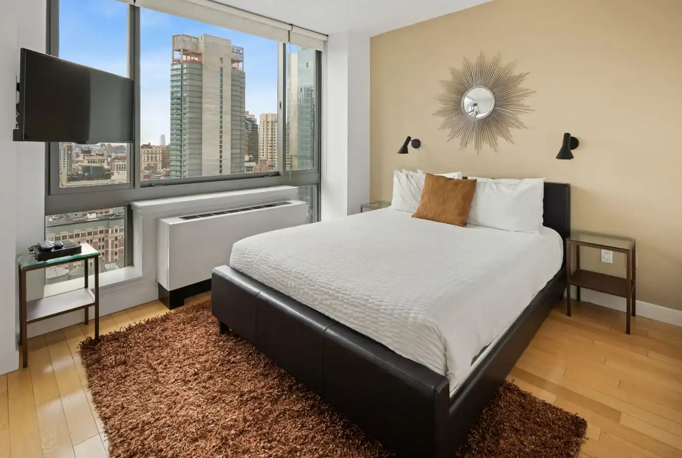 Welcome to Tower 31, an architecturally striking glass tower rising in the heart of Manhattan’s Flatiron District. This newly furnished one-bedroom apartment blends thoughtful design with upscale comfort, offering a refined living experience just moments from Madison Square Park. The residence features state-of-the-art interiors, including a fully equipped kitchen with granite countertops and modern appliances, marble-tiled bath, hardwood floors, and oversized windows that invite natural light throughout the day. The bedroom is fitted with a plush queen-size bed, creating a cozy retreat above the city’s energy.