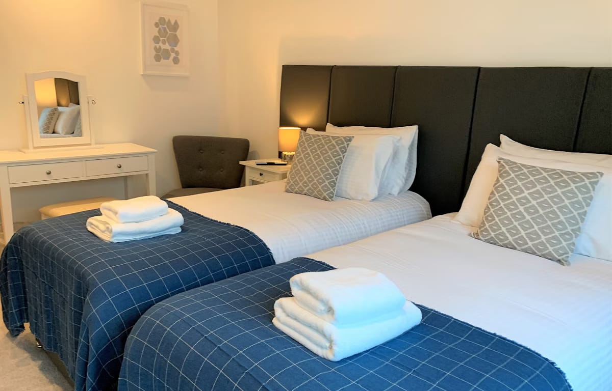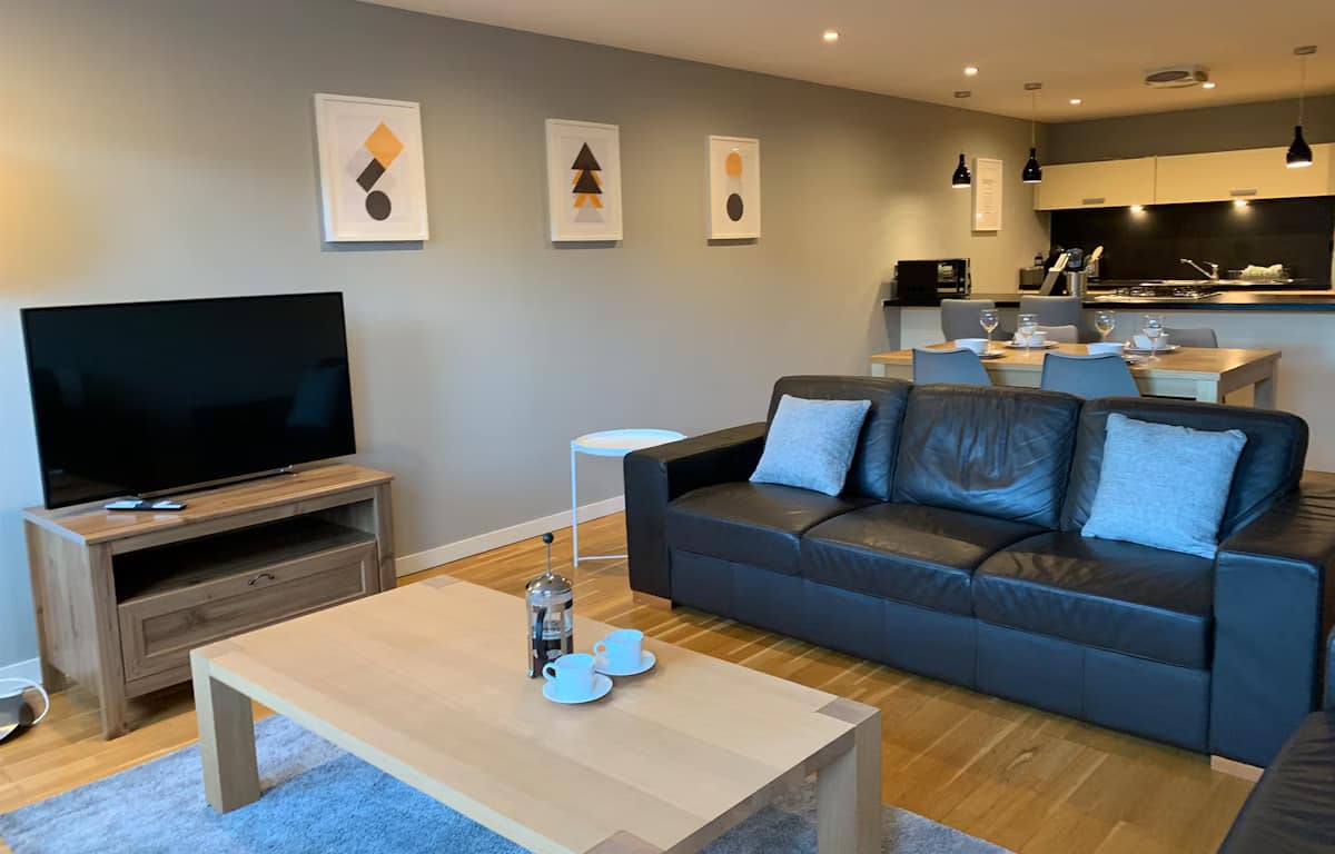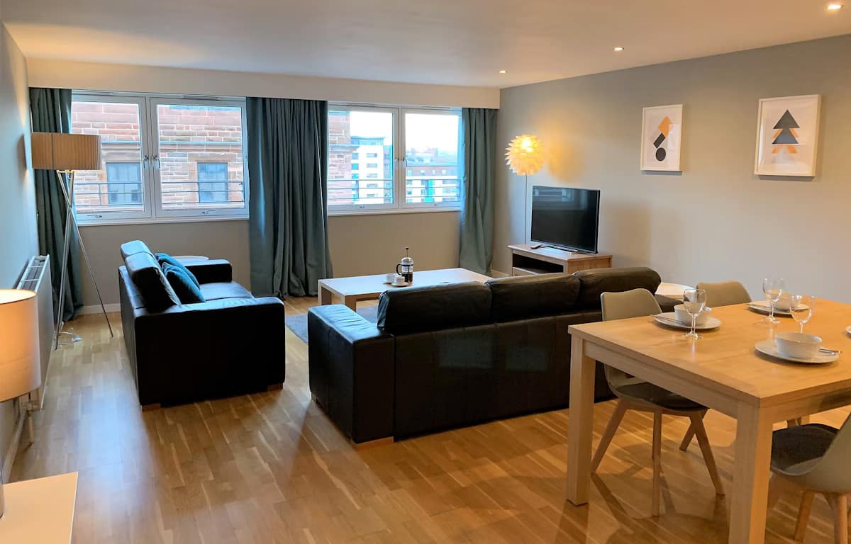 Glasgow Watson Street Apartments offer stylish and contemporary accommodation in the heart of the city’s vibrant Merchant City district. Situated in a modern building at Glasgow Cross, these apartments provide fully equipped, spacious living ideal for families, colleagues, or friends travelling together. Each apartment comfortably sleeps up to four guests, with a super king master bedroom and a twin second bedroom. The open-plan lounge, dining, and kitchen area creates a welcoming space to relax or socialise, complete with a Smart TV and high-speed Wi-Fi. The fully equipped kitchen includes an electric fan oven, gas hob, fridge/freezer, microwave, and dishwasher, while a washer/dryer is conveniently located in a separate cupboard off the hallway. All linen and towels are provided, along with a thoughtful welcome pack of tea, coffee, and biscuits to make guests feel at home.
