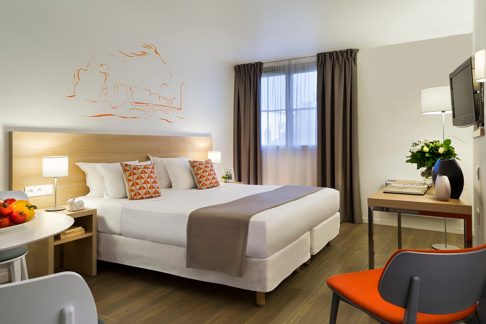 The residence features 111 fully furnished apartments, ranging from efficient studios to spacious options accommodating up to six guests. Each apartment is designed for maximum comfort and independence, complete with a fully equipped kitchen so guests can enjoy self-catering throughout their stay. Thoughtfully decorated interiors create a relaxing atmosphere, making them perfect for both short and extended visits. On-site amenities include a fitness room to keep up with your workout routine and a meeting room designed to support business needs. A private car park is available on request (extra charge), offering added convenience for those arriving by car. The 24-hour reception team is always ready to help, providing local tips, assistance with business services, and ensuring a smooth, stress-free stay.