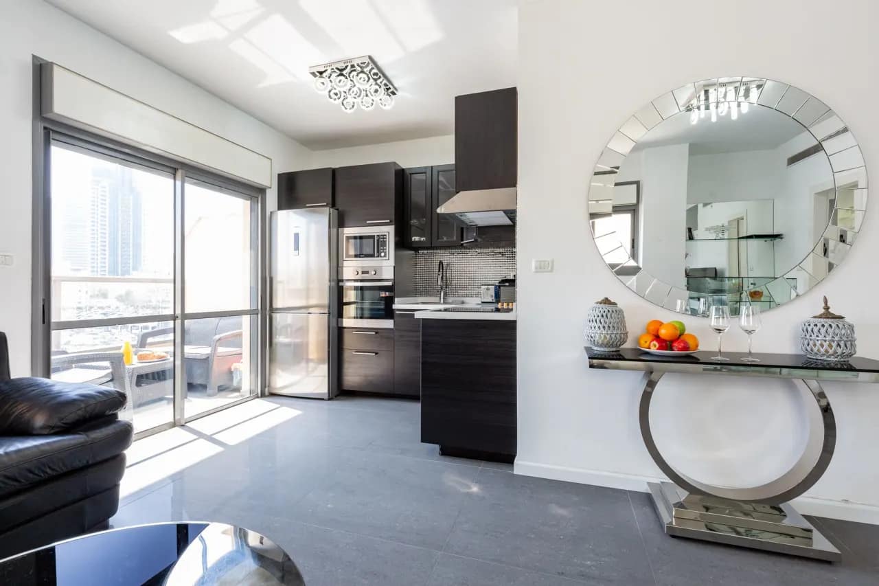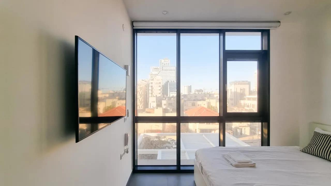 Hakovshim Street Apartments is a modern, stylish two-bedroom rental perfectly designed for travelers seeking a clean and minimalist aesthetic combined with comfort and convenience. The interiors feature carefully curated furniture, elegant tiled floors, and an open layout that allows natural light to fill the space, creating a bright and airy atmosphere. Thoughtful touches throughout the apartment balance the lively energy of Tel Aviv with a peaceful retreat. The apartment includes all daily essentials, such as a fully equipped kitchen with modern appliances, bath essentials, air-conditioning, and high-speed WiFi. A cozy patio offers a stunning view of Banana Beach, providing the perfect spot to relax, enjoy a morning coffee, or watch the sun set with friends or family. One of the bedrooms doubles as a shelter room (mamad in Hebrew), offering both safety and peace of mind during your stay.