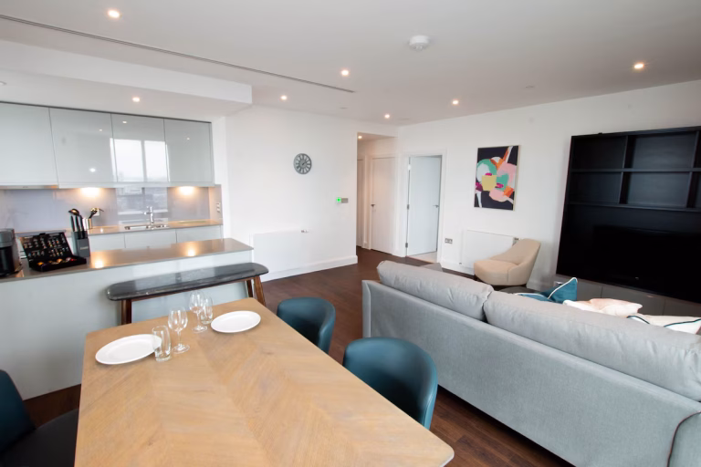 Discover the perfect blend of modern design, comfort, and city convenience in these Canary Wharf serviced apartments. Located in London’s major financial and business district, these spacious three-bedroom, two-bathroom apartments offer an exceptional stay for both business and leisure travellers. Canary Wharf is known for its striking skyscrapers, headquarters of global companies, and vibrant commercial atmosphere. In addition to its business energy, the area also offers a wide range of restaurants, bars, and a large shopping mall with high-end stores and everyday essentials, making it one of London’s most complete urban neighborhoods.