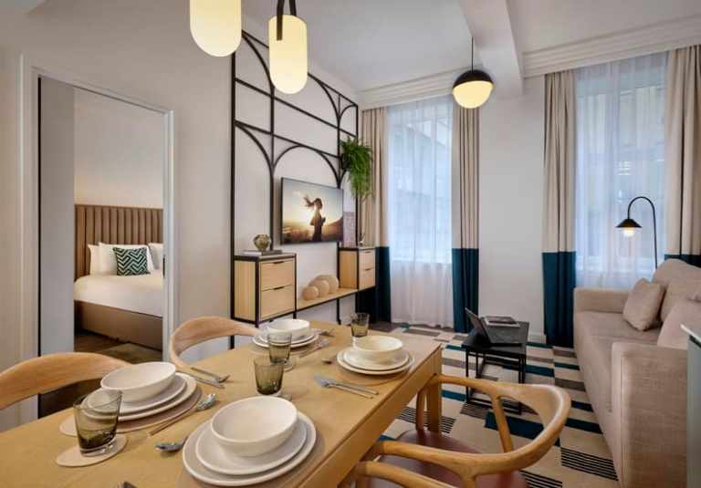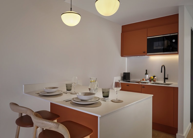 Each apartment is designed for modern living, combining hotel-like amenities with the independence of a fully equipped space. Guests enjoy private kitchens, high speed Wi-Fi, and dedicated dining and living areas, making the apartments ideal for longer stays or travellers who prefer self catering. The interiors are bright and functional, offering a calm space to relax, work, or recharge between city adventures. Complimentary housekeeping and 24-hour support ensure your stay is as seamless as it is comfortable. Whether you’re in town for a few nights or a few weeks, this aparthotel provides the essentials for a truly flexible stay.