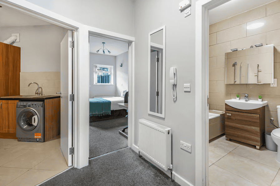 Inside, each apartment is designed with simplicity and efficiency in mind — ideal for remote work, short-term relocations, or weekend city stays. Furnishings are contemporary and understated, while practical touches like fully equipped kitchens, high-spec appliances, and in-apartment laundry facilities support a seamless stay. High-speed Wi-Fi and dedicated workspace areas cater to corporate guests, while soundproofing and blackout blinds ensure downtime is truly restful. The overall aesthetic is clean and modern, with neutral palettes, light-filled rooms, and a layout that balances form with function for everyday liveability and style.