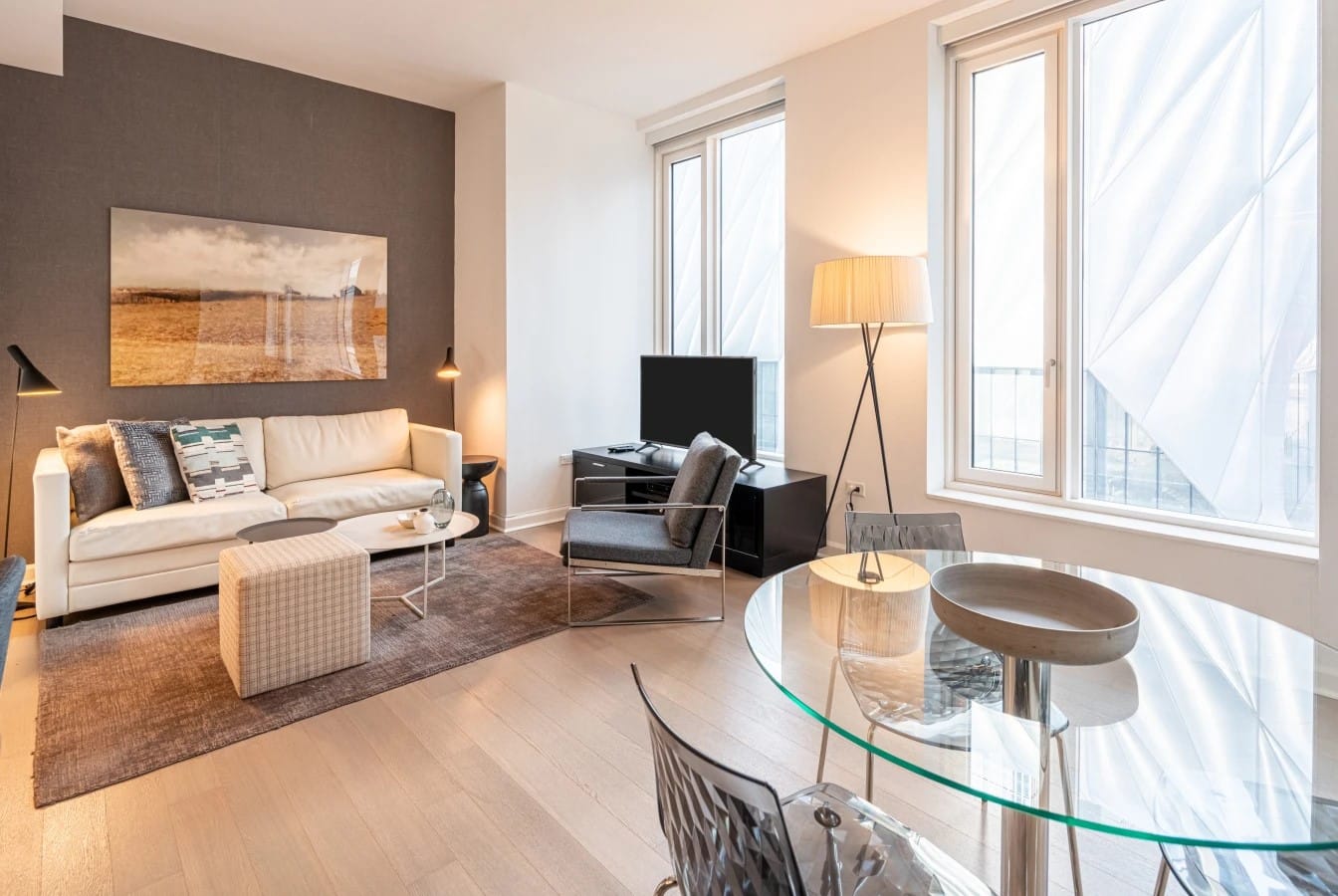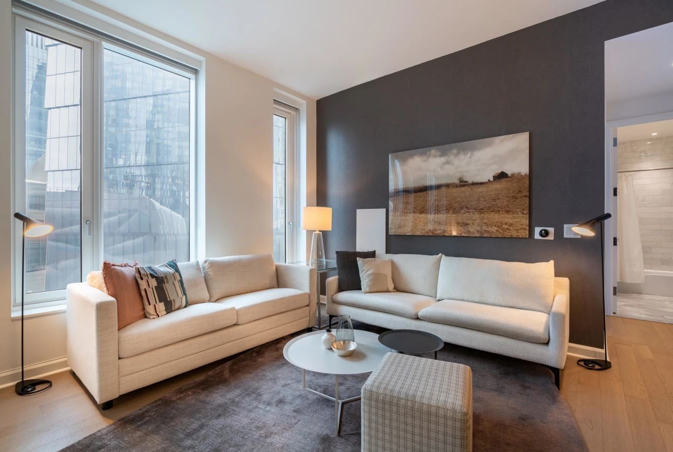 Welcome to One Hudson Yards, a premier luxury residence located at 530 West 30th Street in the heart of Manhattan’s dynamic West Chelsea neighborhood. Offering sophisticated one- and two-bedroom apartments, this stunning high-rise places you at the crossroads of elegance and excitement, just steps from the High Line and overlooking the Hudson River. Each apartment showcases meticulous design with soaring 10-foot ceilings, expansive double-paned windows, and grey oak wood flooring throughout. Residents enjoy spacious layouts featuring state-of-the-art Miele appliances, advanced wireless lighting control, custom closets, and luxurious marble finishes. Bedrooms are furnished with plush king-size beds, offering a restful sanctuary in the heart of the city.