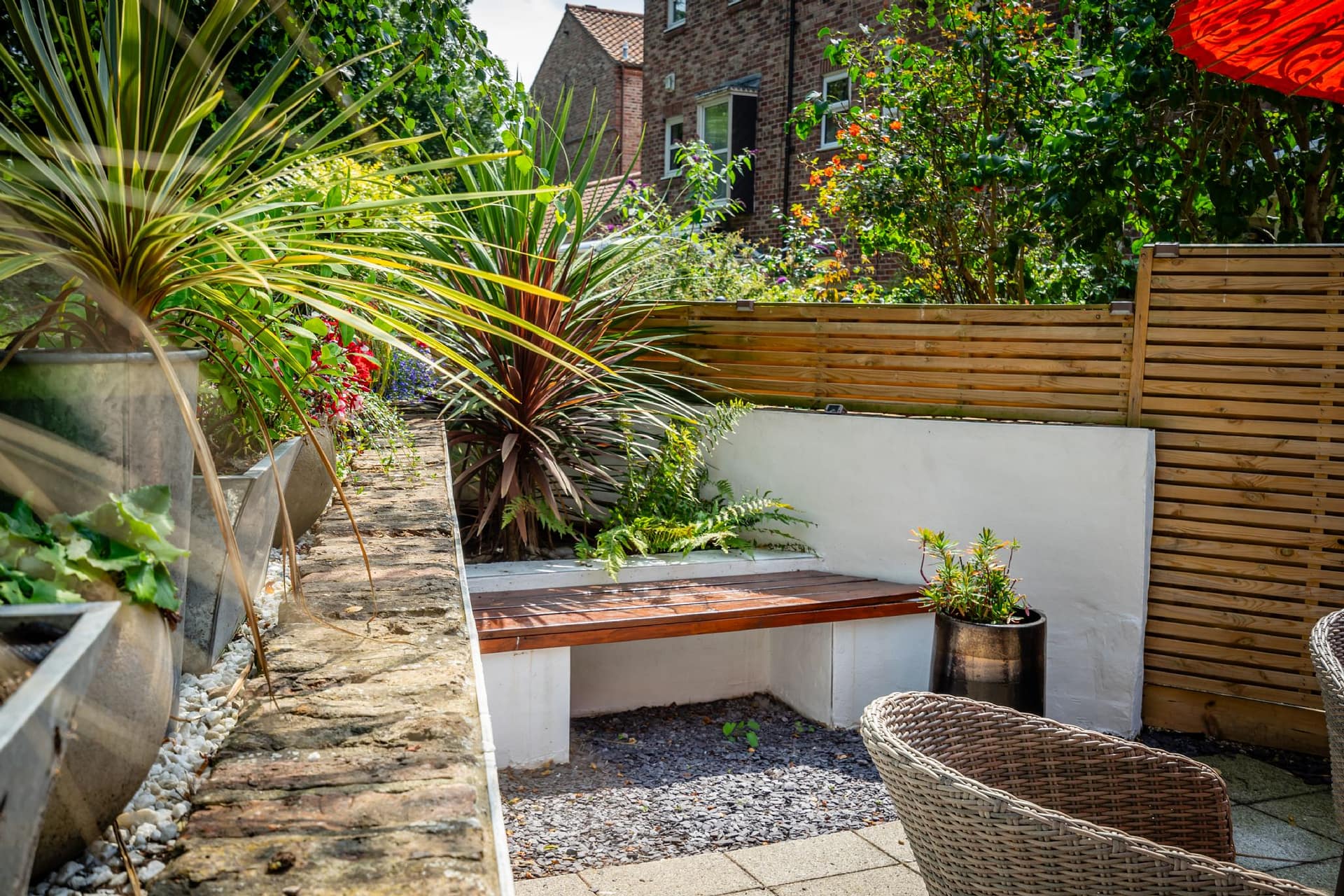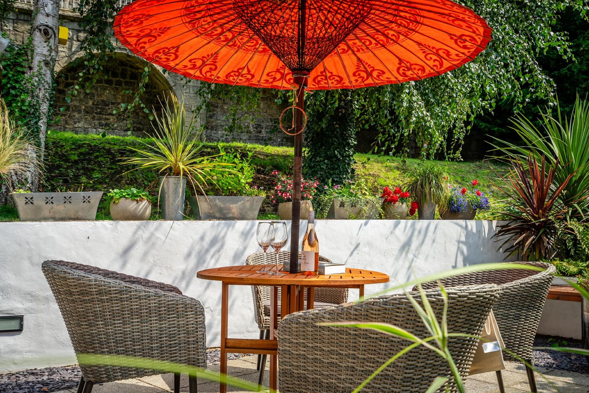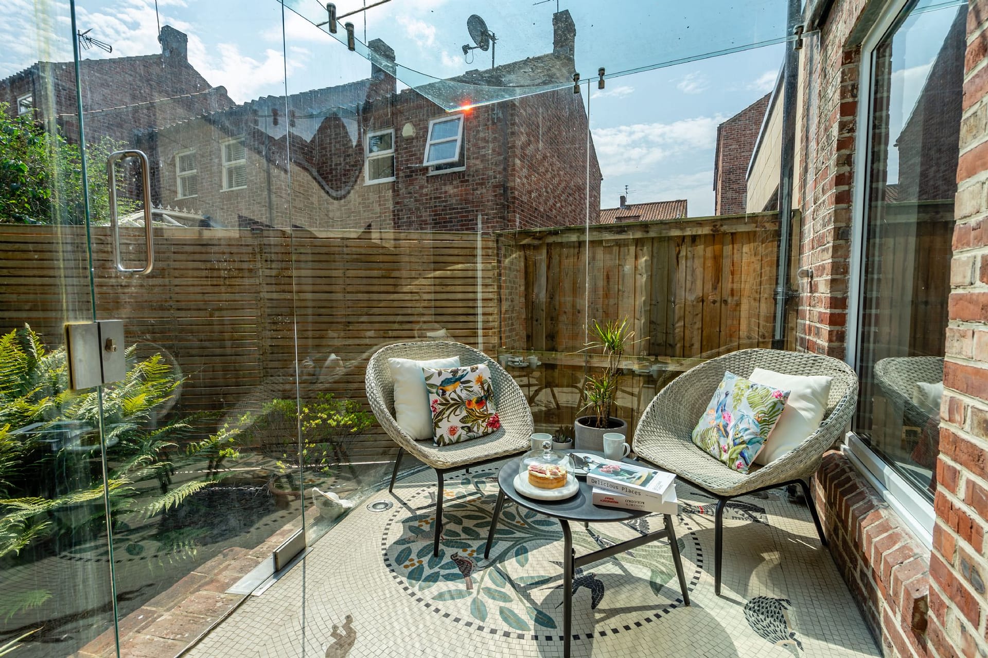 Step outside and you’ll find a tranquil patio garden framed by greenery, a rare feature in a central York property. Furnished with comfortable seating, this space is perfect for morning coffee, al fresco dining, or simply relaxing with a glass of wine after a day of exploring. From here, you’ll be treated to stunning views of York’s iconic city walls, a daily reminder of the rich history and timeless charm that surrounds this unique home. The setting combines peace and privacy with the convenience of being just a short walk from York’s shops, restaurants, and cultural landmarks, ensuring the best of both worlds for every guest.