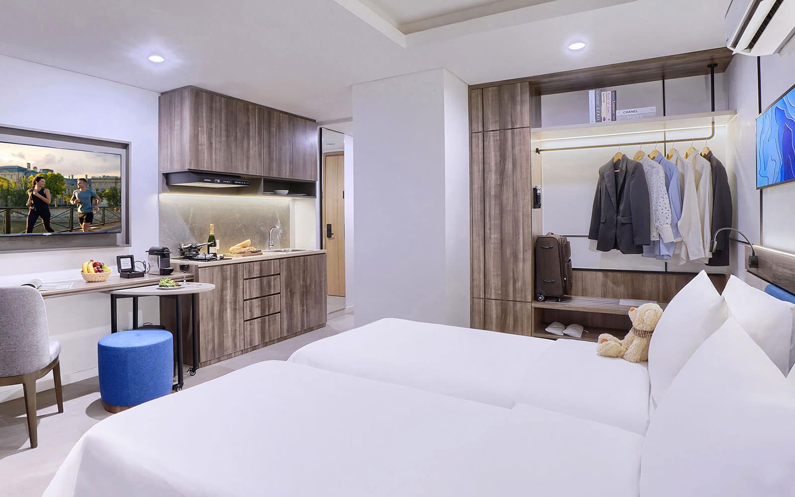 Accommodation follows an apartment format that suits both short and extended stays. Units are set up to support real routines: expect generous space, separate living and dining areas in many layouts, and kitchens or kitchenettes that make simple self-catering easy. This is especially useful if you are travelling with children, staying for a week or more, or prefer the flexibility of preparing breakfast on your own schedule. Practical touches like work-friendly areas and on-site services help the residence work well for remote work and corporate travel, while the overall look and feel stays modern, calm, and functional.