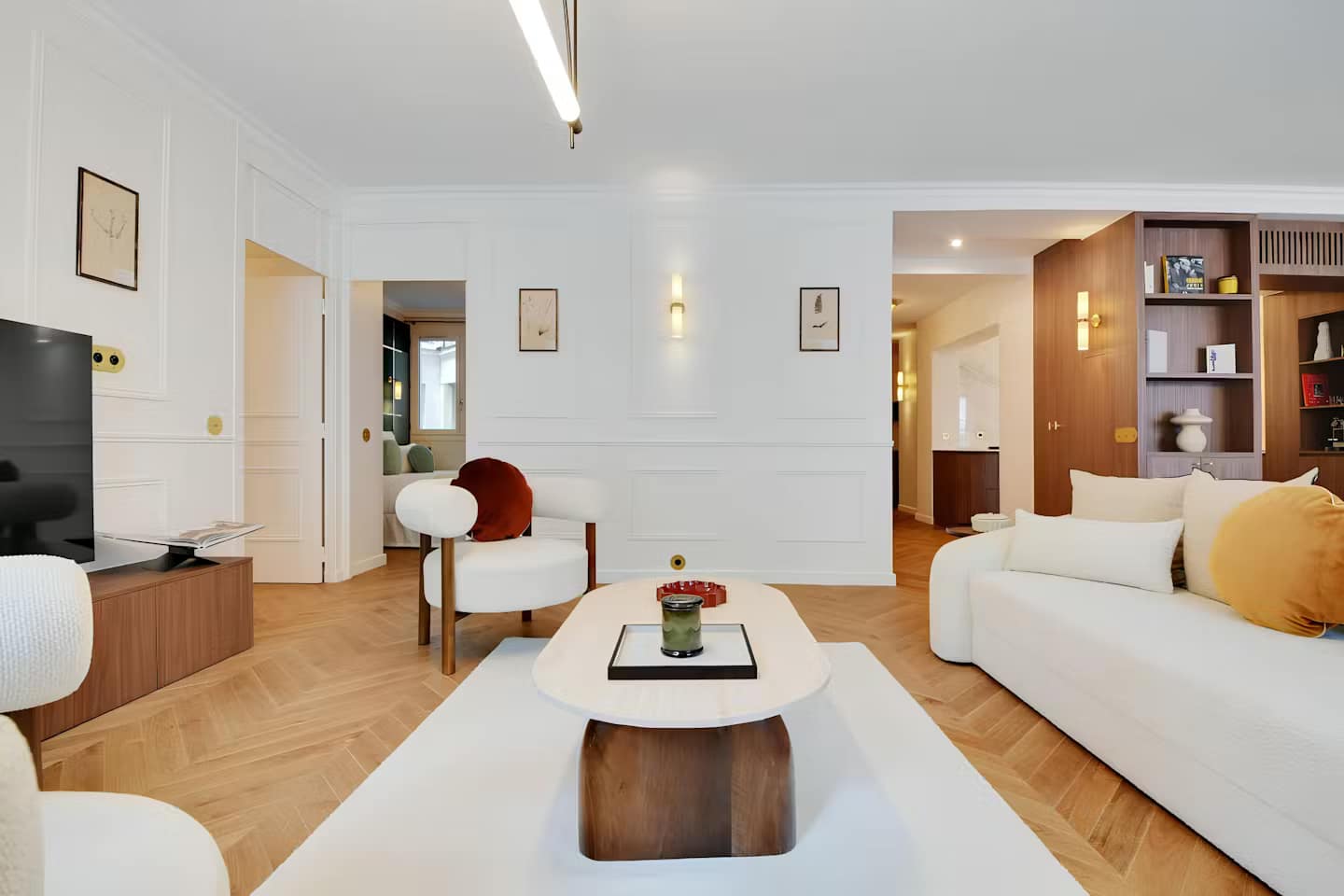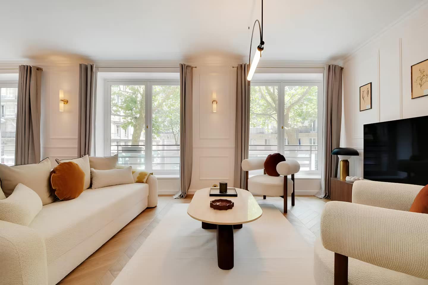 Perfectly placed in the heart of the Latin Quarter, this Jardin du Luxembourg apartment offers an inviting blend of elegance and comfort. With the celebrated gardens just moments from the front door, it’s a haven for those who value culture, charm, and green space. Set within a historic building, the interiors reflect understated luxury, combining contemporary finishes with thoughtful touches that make longer stays feel effortless. Each of the three bedrooms is appointed with a marble en-suite bathroom and its own desk – offering privacy and practicality in equal measure. The spacious living area, enhanced by large windows, opens onto leafy views and provides additional sleeping arrangements on a high-quality sofa bed.