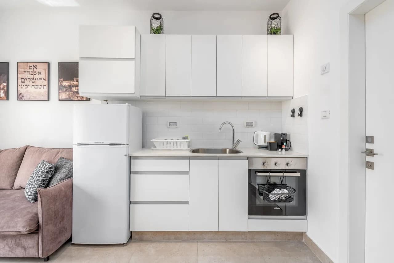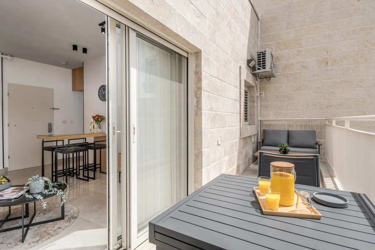 Jerusalem Great Synagogue Apartments include fully equipped kitchens with Nespresso machines, dining areas, and living spaces with sofa beds suitable for two adults or three children. Additional folding beds are available for larger groups, making the units flexible for various needs. Modern conveniences such as washing machines, dryers, high-speed WiFi, luxury toiletries, and fresh coffee ensure a comfortable stay, while optional room service provides an extra touch of convenience. Ground-floor units feature spacious balconies ideal for enjoying a meal outdoors, while upper-floor apartments include multiple balconies and charming city views. The combination of contemporary design and thoughtful amenities creates a perfect blend of comfort and style.