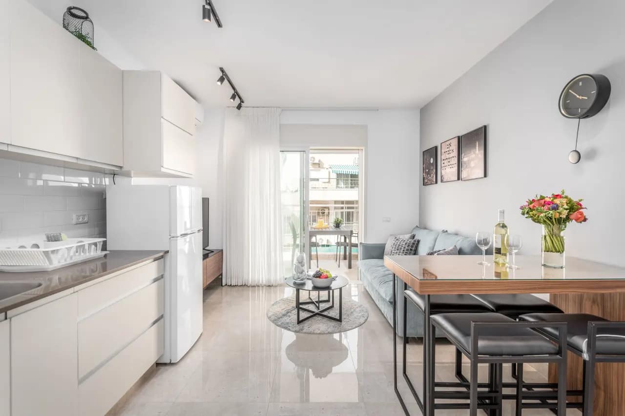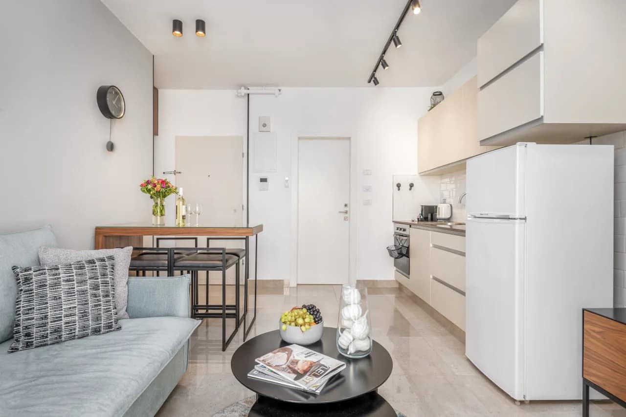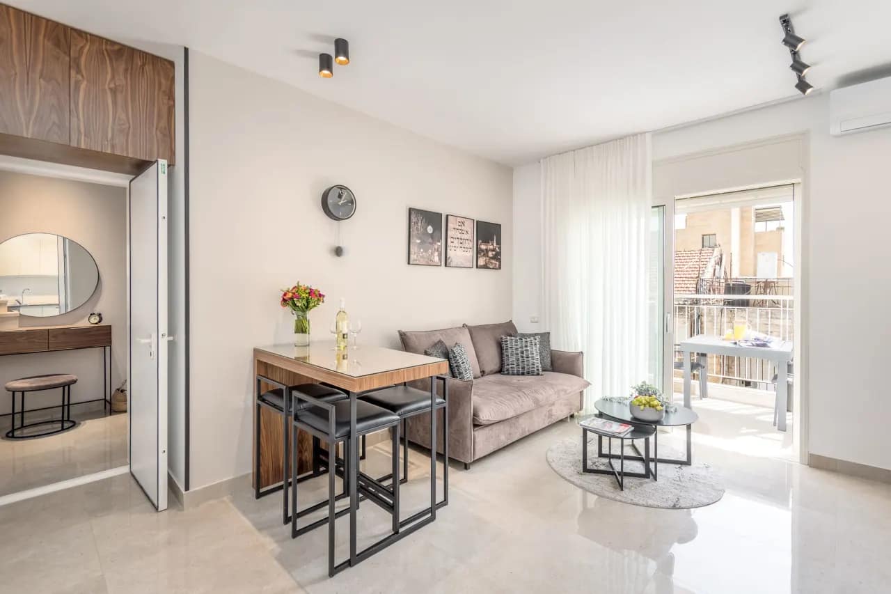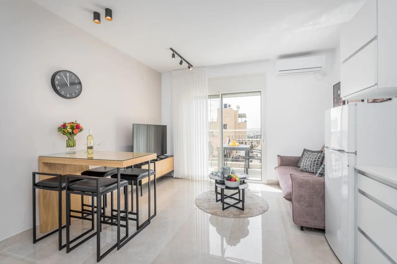 Jerusalem Great Synagogue Apartments offer a selection of luxurious vacation apartments designed with clean, contemporary aesthetics and thoughtful attention to detail. The building features a variety of apartment sizes, including one-bedroom, two-bedroom, three-bedroom, and four-bedroom units, accommodating from 4 up to 10 guests. With layouts ranging from 55m² to 220m², each apartment is designed to provide comfort, space, and style for families, groups, or couples. Air-conditioned rooms, plush mattresses, and carefully curated furnishings create a restful and inviting atmosphere, while large windows and balconies allow natural light to fill the apartments and offer views of the surrounding cityscape.