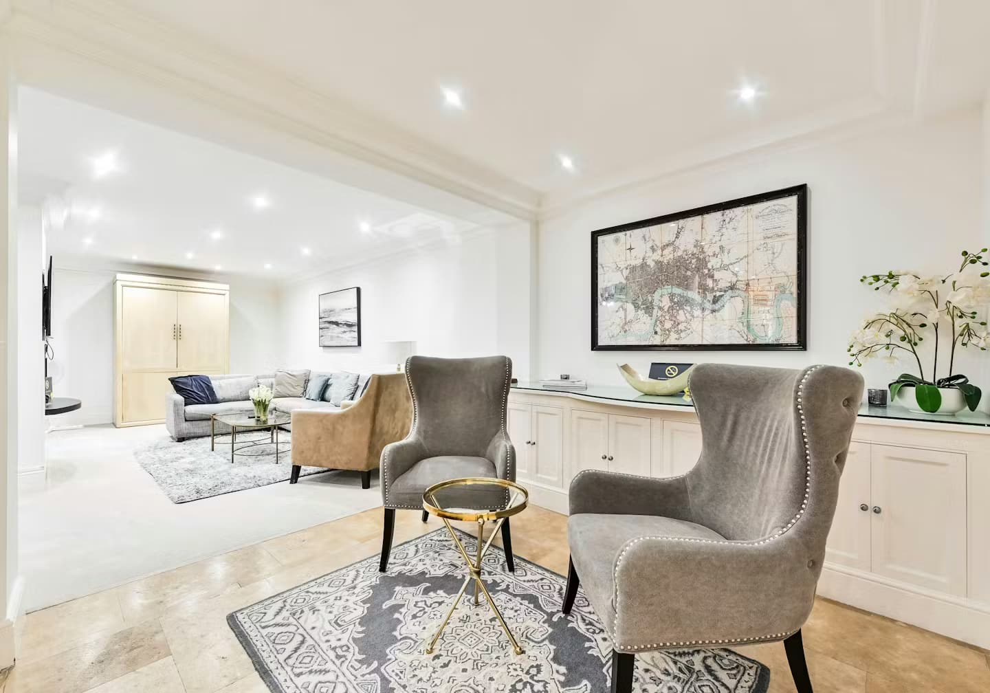 Upstairs, the living area is filled with light from generous windows and opens onto a Juliet balcony with peaceful views over the mews. It’s a serene spot for morning coffee or a nightcap after an evening out. The large kitchen is ideal for those who love to cook, with contemporary fittings and ample space for relaxed dining or entertaining. Downstairs, two beautifully designed bedrooms offer hotel-style comfort, with the main suite boasting a statement soaking tub and dual walk-in showers. The second bedroom and ensuite are equally elegant, perfect for guests, family, or colleagues sharing. This Luxury Mews House in Knightsbridge is crafted with care—balancing open-plan comfort with refined detail in every room.