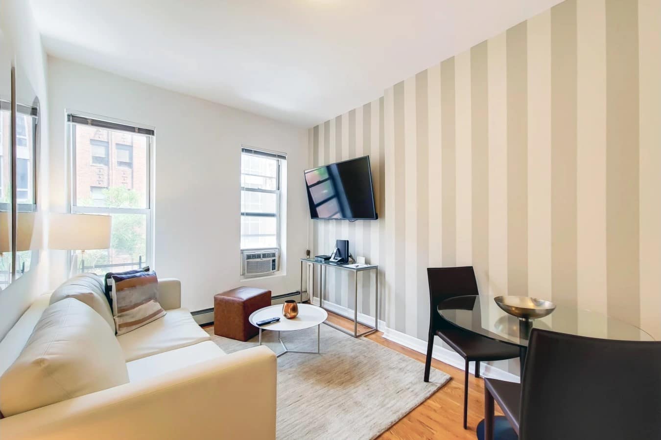 The apartment is thoughtfully designed with hardwood flooring, contemporary furnishings, and an efficient kitchenette ideal for simple meal preparation. Oversized windows fill the space with natural light, creating an inviting and airy ambiance perfect for short-term or extended stays. Complimentary WiFi is included, ensuring guests stay connected throughout their visit. A cozy and refined layout provides a seamless blend of comfort and functionality for individuals or couples seeking a premium Manhattan stay.